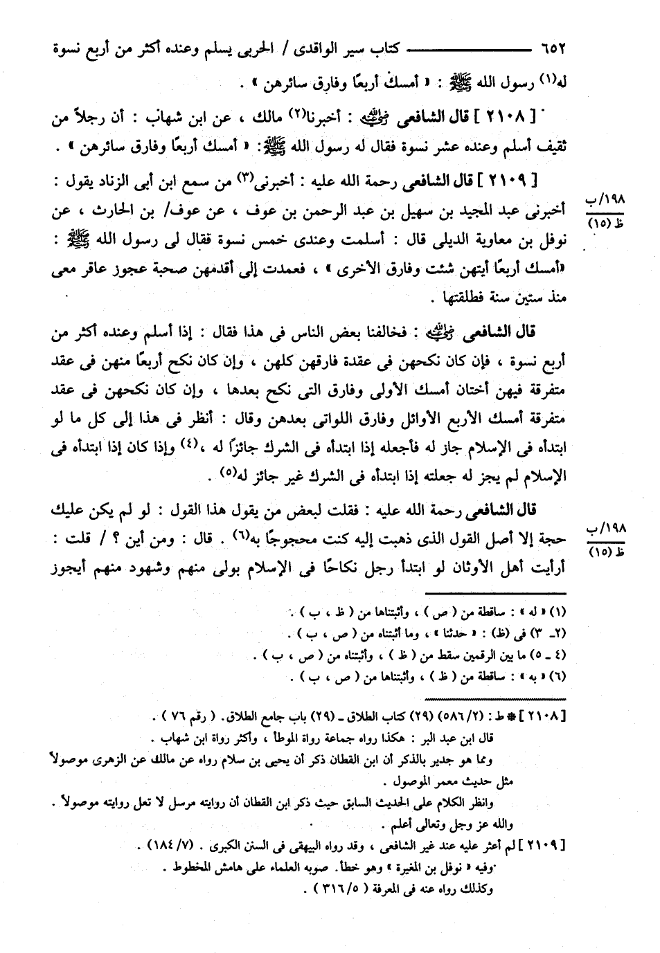 قَالَ الشَّافِعِيُّ : أَخْبَرَنِي مَنْ سَمِعَ ابْنَ أَبِي الزِّنَادِ يَقُولُ أَخْبَرَنِي عَبْدُ الْمَجِيدِ بْنُ سُهَيْلِ بْنِ عَبْدِ الرَّحْمَنِ بْنِ عَوْفٍ عَنْ عَوْفِ بْنِ الْحَارِثِ عَنْ { نَوْفَلِ بْنِ مُعَاوِيَةَ الدَّيْلَمِيِّ قَالَ : أَسْلَمْت وَعِنْدِي خَمْسُ نِسْوَةٍ فَقَالَ لِي رَسُولُ اللَّهِ - صلى الله عليه وسلم - : أَمْسِكْ أَرْبَعًا أَيَّتُهُنَّ شِئْت وَفَارِقْ الْأُخْرَى فَعَمَدْت إلَى أَقْدَمِهِنَّ صُحْبَةً عَجُوزٌ عَاقِرٌ مَعِي مُنْذُ سِتِّينَ سَنَةً فَطَلَّقْتُهَا }