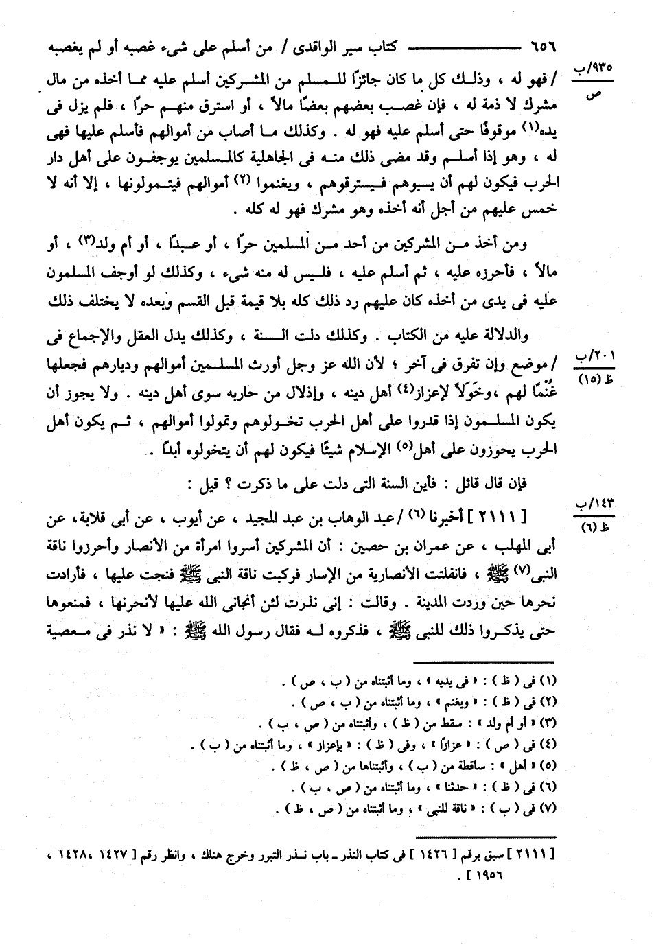 فَهُوَ لَهُ . وَذَلِكَ كُلُّ مَا كَانَ جَائِزًا لِلْمُسْلِمِ مِنْ الْمُشْرِكِينَ أَسْلَمَ عَلَيْهِ مِمَّا أَخَذَهُ مِنْ مَالِ مُشْرِكٍ لاَ ذِمَّةَ لَهُ فَإِنْ غَصَبَ بَعْضُهُمْ بَعْضًا مَالاً أَوْ اسْتَرَقَّ مِنْهُمْ حُرًّا فَلَمْ يَزَلْ فِي يَدِهِ مَوْقُوفًا حَتَّى أَسْلَمَ عَلَيْهِ فَهُوَ لَهُ . وَكَذَلِكَ مَا أَصَابَ مِنْ أَمْوَالِهِمْ فَأَسْلَمَ عَلَيْهَا فَهِيَ لَهُ , وَهُوَ إذَا أَسْلَمَ وَقَدْ مَضَى ذَلِكَ مِنْهُ فِي الْجَاهِلِيَّةِ كَالْمُسْلِمِينَ يوجفون عَلَى أَهْلِ دَارِ الْحَرْبِ فَيَكُونُ لَهُمْ أَنْ يَسْبُوهُمْ فَيَسْتَرِقُّوهُمْ وَيَغْنَمُوا أَمْوَالَهُمْ فيتمولونها إلَّا أَنَّهُ لاَ خُمُسَ عَلَيْهِمْ مِنْ أَجْلِ أَنَّهُ أَخَذَهُ وَهُوَ مُشْرِكٌ فَهُوَ لَهُ كُلُّهُ وَمَنْ أَخَذَ مِنْ الْمُشْرِكِينَ مِنْ أَحَدٍ مِنْ الْمُسْلِمِينَ حُرًّا أَوْ عَبْدًا أَوْ أُمَّ وَلَدٍ أَوْ مَالاً فَأَحْرَزَهُ عَلَيْهِ ثُمَّ أَسْلَمَ عَلَيْهِ فَلَيْسَ لَهُ مِنْهُ شَيْءٌ وَكَذَلِكَ لَوْ أَوْجَفَ الْمُسْلِمُونَ عَلَيْهِ فِي يَدَيْ مَنْ أَخَذَهُ كَانَ عَلَيْهِمْ رَدُّ ذَلِكَ كُلِّهِ بِلاَ قِيمَةٍ قَبْلَ الْقَسْمِ وَبَعْدَهُ لاَ يَخْتَلِفُ ذَلِكَ وَالدَّلاَلَةُ عَلَيْهِ مِنْ الْكِتَابِ وَكَذَلِكَ دَلَّتْ السُّنَّةُ وَكَذَلِكَ يَدُلُّ الْعَقْلُ وَالْإِجْمَاعُ فِي مَوْضِعٍ وَإِنْ تَفَرَّقَ فِي آخَرَ لِأَنَّ اللَّهَ عَزَّ وَجَلَّ أَوْرَثَ الْمُسْلِمِينَ أَمْوَالَهُمْ وَدِيَارَهُمْ فَجَعَلَهَا غُنْمًا لَهُمْ وَخَوَلاً لِإِعْزَازِ أَهْلِ دِينِهِ وَإِذْلاَلِ مَنْ حَارَبَهُ سِوَى أَهْلِ دِينِهِ . وَلاَ يَجُوزُ أَنْ يَكُونَ الْمُسْلِمُونَ إذَا قَدَرُوا عَلَى أَهْلِ الْحَرْبِ تَخَوَّلُوهُمْ وَتَمَوَّلُوا أَمْوَالَهُمْ ثُمَّ يَكُونُ أَهْلُ الْحَرْبِ يَحُوزُونَ عَلَى الْإِسْلاَمِ شَيْئًا فَيَكُونُ لَهُمْ أَنْ يَتَخَوَّلُوهُ أَبَدًا , فَإِنْ قَالَ قَائِلٌ : فَأَيْنَ السُّنَّةُ الَّتِي دَلَّتْ عَلَى مَا ذَكَرْت ؟ قِيلَ : أَخْبَرَنَا عَبْدُ الْوَهَّابِ بْنُ عَبْدِ الْمَجِيدِ عَنْ أَيُّوبَ عَنْ أَبِي قِلاَبَةَ عَنْ أَبِي الْمُهَلَّبِ عَنْ عِمْرَانَ بْنِ حُصَيْنٍ { أَنَّ الْمُشْرِكِينَ أَسَرُوا امْرَأَةً مِنْ الْأَنْصَارِ وَأَحْرَزُوا نَاقَةً لِلنَّبِيِّ - صلى الله عليه وسلم - فَانْفَلَتَتْ الْأَنْصَارِيَّةُ مِنْ الْإِسَارِ فَرَكِبَتْ نَاقَةَ النَّبِيِّ - صلى الله عليه وسلم - فَأَرَادَتْ نَحْرَهَا حِينَ وَرَدَتْ الْمَدِينَةَ وَقَالَتْ : إنِّي نَذَرْت لَئِنْ أَنْجَانِي اللَّهُ عَلَيْهَا لاََنْحَرَنَّهَا فَمَنَعُوهَا حَتَّى يَذْكُرُوا ذَلِكَ لِلنَّبِيِّ - صلى الله عليه وسلم - فَذَكَرُوهُ لَهُ فَقَالَ رَسُولُ اللَّهِ - صلى الله عليه وسلم - : لاَ نَذْرَ فِي مَعْصِيَةٍ @