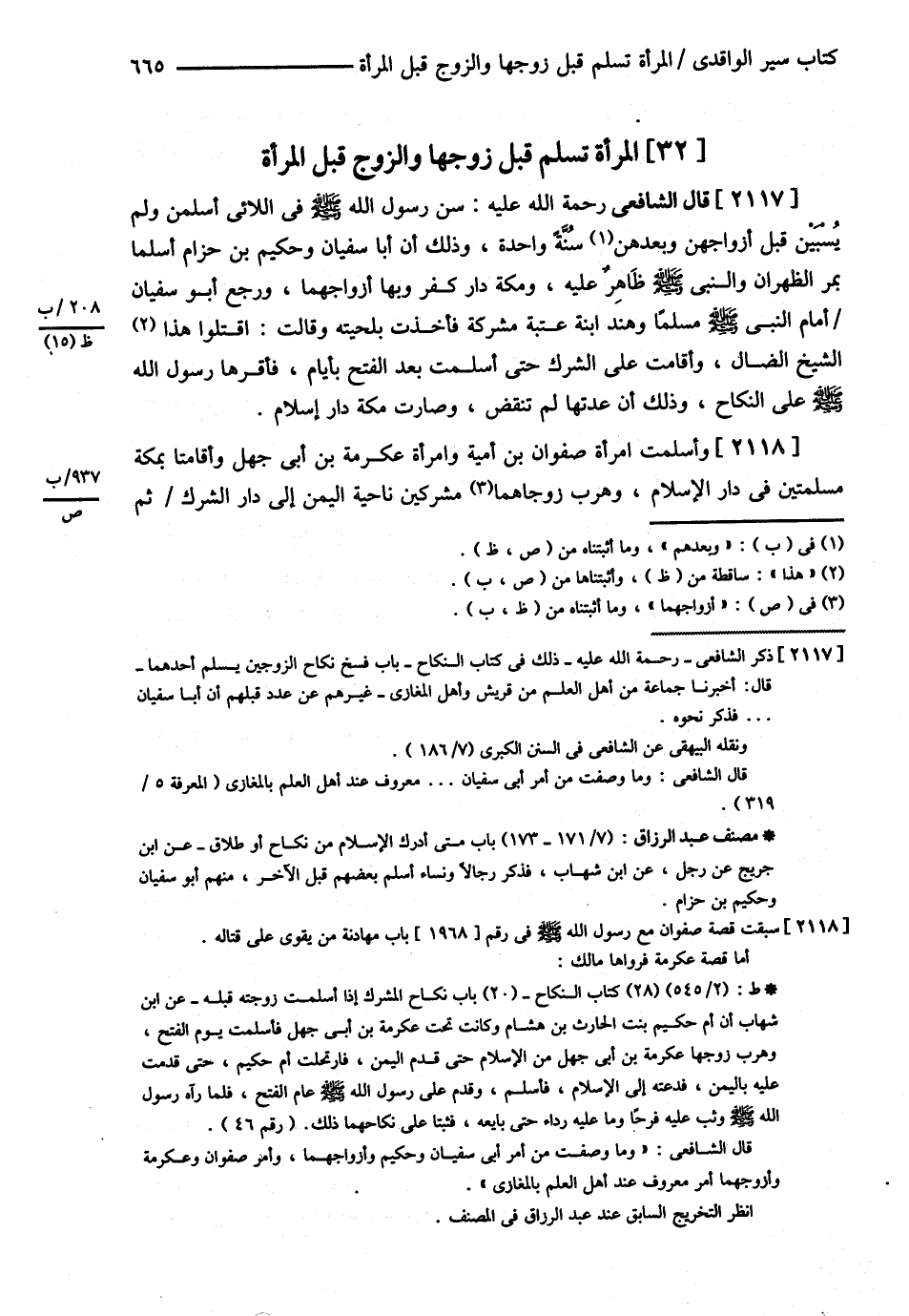 قَالَ الشَّافِعِيُّ : رحمه الله تعالى : سَنَّ رَسُولُ اللَّهِ - صلى الله عليه وسلم - فِي اللَّائِي أَسْلَمْنَ وَلَمْ يُسْبَيْنَ قَبْلَ أَزْوَاجِهِنَّ وَبَعْدَهُمْ سُنَّةً وَاحِدَةً وَذَلِكَ أَنَّ أَبَا سُفْيَانَ وَحَكِيمَ بْنَ حِزَامٍ أَسْلَمَا بِمَرِّ الظَّهْرَانِ وَالنَّبِيُّ - صلى الله عليه وسلم - ظَاهِرٌ عَلَيْهِ وَمَكَّةُ دَارُ كُفْرٍ وَبِهَا أَزْوَاجُهُمَا وَرَجَعَ أَبُو سُفْيَانَ أَمَامَ النَّبِيِّ - صلى الله عليه وسلم - مُسْلِمًا وَهِنْدُ بِنْت عُتْبَةَ مُشْرِكَةً فَأَخَذَتْ بِلِحْيَتِهِ وَقَالَتْ : اُقْتُلُوا هَذَا الشَّيْخَ الضَّالَّ وَأَقَامَتْ عَلَى الشِّرْكِ حَتَّى أَسْلَمَتْ بَعْدَ الْفَتْحِ بِأَيَّامٍ فَأَقَرَّهَا رَسُولُ اللَّهِ - صلى الله عليه وسلم - عَلَى النِّكَاحِ وَذَلِكَ أَنَّ عِدَّتَهَا لَمْ تَنْقَضِ وَصَارَتْ مَكَّةُ دَارَ الْإِسْلاَمِ وَأَسْلَمَتْ امْرَأَةُ صَفْوَانَ بْنِ أُمَيَّةَ وَامْرَأَةُ عِكْرِمَةَ بْنِ أَبِي جَهْلٍ وَأَقَامَتَا بِمَكَّةَ مُسْلِمَتَيْنِ فِي دَارِ الْإِسْلاَمِ وَهَرَبَ زَوْجَاهُمَا مُشْرِكَيْنِ نَاحِيَةَ الْيَمَنِ إلَى دَارِ الشِّرْكِ ثُمَّ @