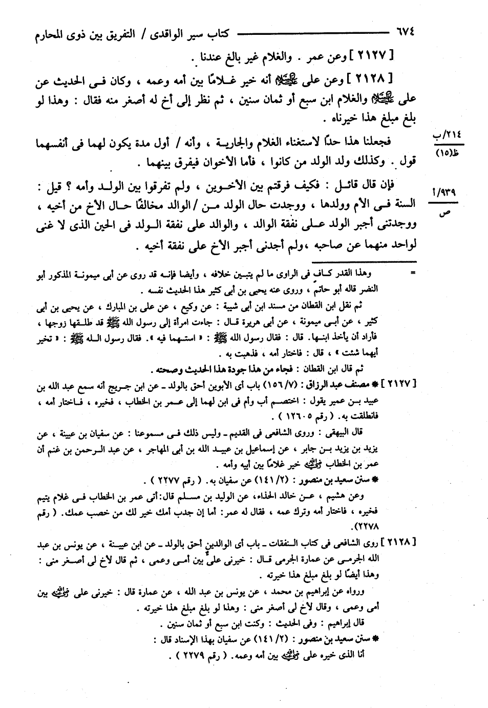 وَعَنْ عُمَرَ رضي الله عنه وَالْغُلاَمُ غَيْرُ بَالِغٍ عِنْدَنَا وَعَنْ عَلِيٍّ رضي الله تعالى عنه أَنَّهُ خَيَّرَ غُلاَمًا بَيْنَ أُمِّهِ وَعَمِّهِ وَكَانَ فِي الْحَدِيثِ عَنْ عَلِيٍّ رضي الله تعالى عنه وَالْغُلاَمُ ابْنُ سَبْعٍ أَوْ ثَمَانِ سِنِينَ ثُمَّ نَظَرَ إلَى أَخٍ لَهُ أَصْغَرَ مِنْهُ فَقَالَ : وَهَذَا لَوْ بَلَغَ مَبْلَغَ هَذَا خَيَّرْنَاهُ فَجَعَلْنَا هَذَا حَدًّا لِاسْتِغْنَاءِ الْغُلاَمِ وَالْجَارِيَةِ وَأَنَّهُ أَوَّلُ مُدَّةٍ يَكُونُ لَهُمَا فِي أَنْفُسِهِمَا قَوْلٌ وَكَذَلِكَ وَلَدُ الْوَلَدِ مَنْ كَانُوا فَأَمَّا الْأَخَوَانِ فَيُفَرَّقُ بَيْنَهُمَا فَإِنْ قَالَ قَائِلٌ : فَكَيْفَ فَرَّقْتُمْ بَيْنَ الْأَخَوَيْنِ وَلَمْ تُفَرِّقُوا بَيْنَ الْوَلَدِ وَأُمِّهِ ؟ قِيلَ : السُّنَّةُ فِي الْأُمِّ وَوَلَدِهَا وَوَجَدْت حَالَ الْوَلَدِ مِنْ الْوَالِدِ مُخَالِفًا حَالَ الْأَخِ مِنْ أَخِيهِ وَوَجَدْتَنِي أَجْبُرُ الْوَلَدَ عَلَى نَفَقَةِ الْوَالِدِ وَالْوَالِدَ عَلَى نَفَقَةِ الْوَلَدِ فِي الْحِينِ الَّذِي لاَ غِنَى لِوَاحِدٍ مِنْهُمَا عَنْ صَاحِبِهِ وَلَمْ أَجِدُنِي أَجْبُرُ الْأَخَ عَلَى نَفَقَةِ أَخِيهِ .@