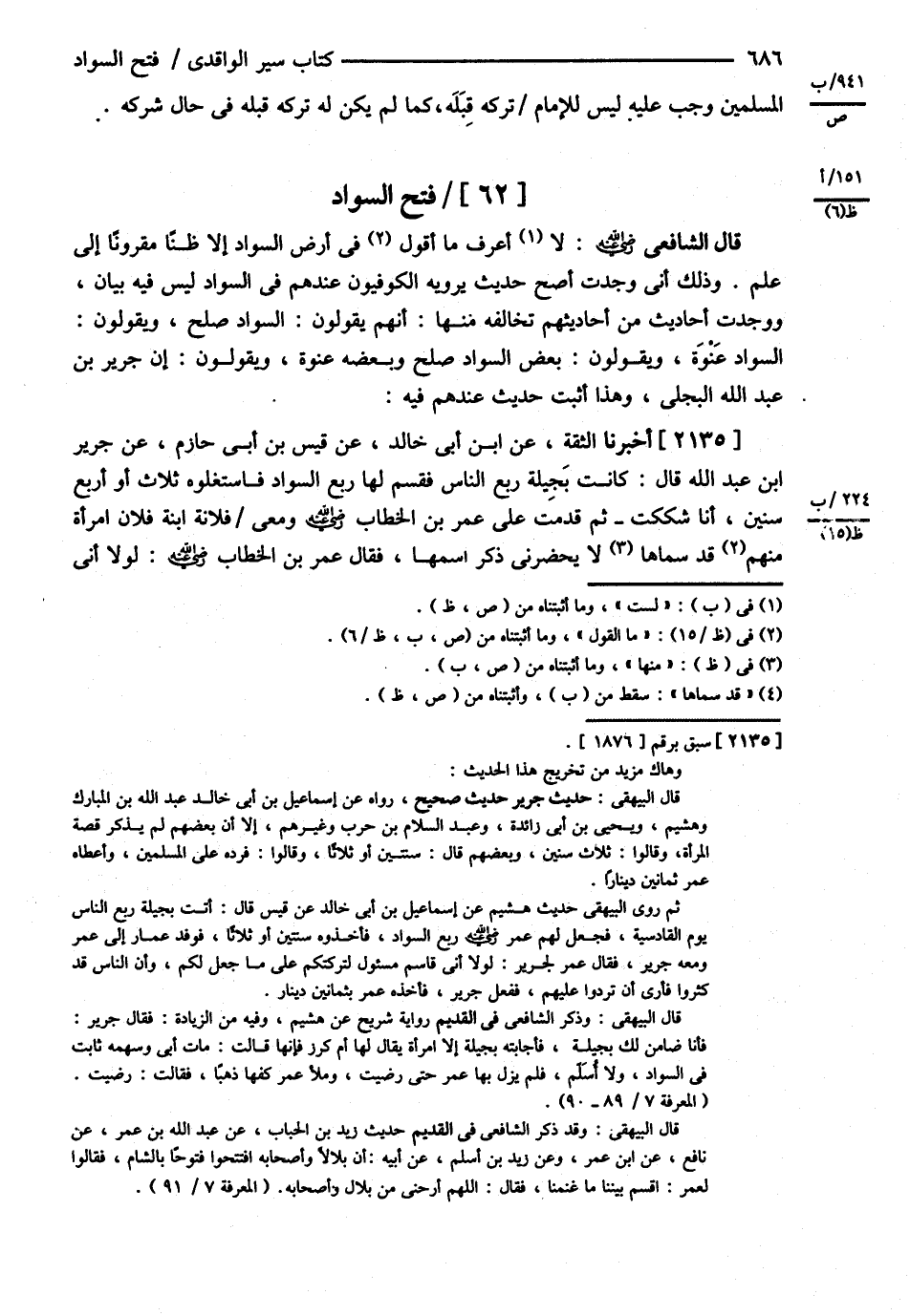 قَالَ الشَّافِعِيُّ : رحمه الله تعالى : لَسْت أَعْرِفُ مَا أَقُولُ فِي أَرْضِ السَّوَادِ إلَّا ظَنًّا مَقْرُونًا إلَى عِلْمٍ وَذَلِكَ أَنِّي وَجَدْت أَصَحَّ حَدِيثٍ يَرْوِيهِ الْكُوفِيُّونَ عِنْدَهُمْ فِي السَّوَادِ لَيْسَ فِيهِ بَيَانٌ وَوَجَدْت أَحَادِيثَ مِنْ أَحَادِيثِهِمْ تُخَالِفُهُ مِنْهَا أَنَّهُمْ يَقُولُونَ : السَّوَادُ صُلْحٌ وَيَقُولُونَ السَّوَادُ عَنْوَةٌ وَيَقُولُونَ بَعْضُ السَّوَادِ صُلْحٌ وَبَعْضُهُ عَنْوَةٌ وَيَقُولُونَ : إنَّ جَرِيرَ بْنَ عَبْدِ اللَّهِ الْبَجَلِيَّ وَهَذَا أَثْبَتُ حَدِيثٍ عِنْدَهُمْ فِيهِ , أَخْبَرَنَا الثِّقَةُ عَنْ ابْنِ أَبِي خَالِدٍ عَنْ قَيْسِ بْنِ أَبِي حَازِمٍ عَنْ جَرِيرِ بْنِ عَبْدِ اللَّهِ قَالَ : كَانَتْ بَجِيلَةُ رُبْعُ النَّاسِ فَقُسِمَ لَهُمْ رُبْعُ السَّوَادِ فَاسْتَغَلُّوهُ ثَلاَثَ أَوْ أَرْبَعَ سِنِينَ أَنَا شَكَكْت ثُمَّ قَدِمْت عَلَى عُمَرَ بْنِ الْخَطَّابِ رضي الله تعالى عنه وَمَعِي فُلاَنَةُ ابْنَةُ فُلاَنٍ امْرَأَةٌ مِنْهُمْ لاَ يَحْضُرُنِي ذِكْرُ اسْمِهَا فَقَالَ عُمَرُ بْنُ الْخَطَّابِ رضي الله تعالى عنه : لَوْلاَ أَنِّي@