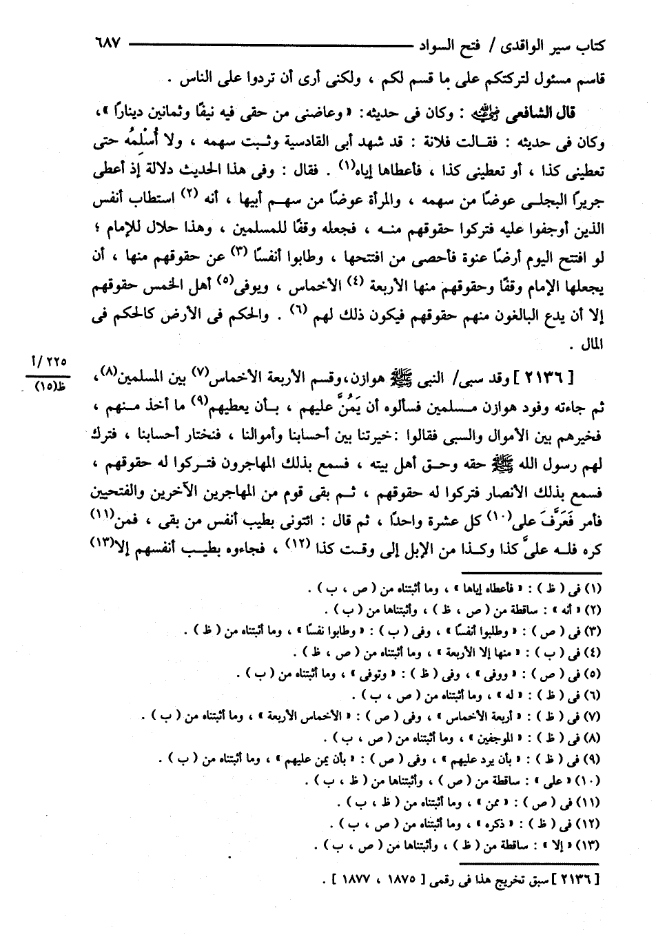 قَالَ الشَّافِعِيُّ : رحمه الله تعالى وَكَانَ فِي حَدِيثِهِ " وعاضني مِنْ حَقِّي فِيهِ نَيِّفًا وَثَمَانِينَ دِينَارًا " وَكَانَ فِي حَدِيثِهِ فَقَالَتْ فُلاَنَةُ : قَدْ شَهِدَ أَبِي الْقَادِسِيَّةَ وَثَبَتَ سَهْمُهُ وَلاَ أُسَلِّمُهُ حَتَّى تُعْطِيَنِي كَذَا أَوْ تُعْطِيَنِي كَذَا فَأَعْطَاهَا إيَّاهُ قَالَ وَفِي هَذَا الْحَدِيثِ دَلاَلَةٌ إذْ أَعْطَى جَرِيرًا الْبَجَلِيَّ عِوَضًا مِنْ سَهْمِهِ وَالْمَرْأَةَ عِوَضًا مِنْ سَهْمِ أَبِيهَا أَنَّهُ اسْتَطَابَ أَنْفُسَ الَّذِينَ أَوْجَفُوا عَلَيْهِ فَتَرَكُوا حُقُوقَهُمْ مِنْهُ فَجَعَلَهُ وَقْفًا لِلْمُسْلِمِينَ وَهَذَا حَلاَلٌ لِلْإِمَامِ لَوْ افْتَتَحَ الْيَوْمَ أَرْضًا عَنْوَةً فَأَحْصَى مَنْ افْتَتَحَهَا وَطَابُوا نَفْسًا عَنْ حُقُوقِهِمْ مِنْهَا أَنْ يَجْعَلَهَا الْإِمَامُ وَقْفًا وَحُقُوقُهُمْ مِنْهَا إلَّا الْأَرْبَعَةَ الْأَخْمَاسِ وَيُوفِي أَهْلَ الْخُمْسِ حُقُوقَهُمْ إلَّا أَنْ يَدَعَ الْبَالِغُونَ مِنْهُمْ حُقُوقَهُمْ فَيَكُونُ ذَلِكَ لَهُمْ وَالْحُكْمُ فِي الْأَرْضِ كَالْحُكْمِ فِي الْمَالِ وَقَدْ { سَبَى النَّبِيُّ - صلى الله عليه وسلم - هَوَازِنَ وَقَسَّمَ الْأَرْبَعَةَ الْأَخْمَاسَ بَيْنَ الْمُسْلِمِينَ ثُمَّ جَاءَتْهُ وُفُودُ هَوَازِنَ مُسْلِمِينَ فَسَأَلُوهُ أَنْ يَمُنَّ عَلَيْهِمْ بِأَنْ يُعْطِيَهُمْ مَا أُخِذَ مِنْهُمْ فَخَيَّرَهُمْ بَيْنَ الْأَمْوَالِ وَالسَّبْيِ فَقَالُوا : خَيَّرْتَنَا بَيْنَ أَحْسَابِنَا وَأَمْوَالِنَا فَنَخْتَارُ أَحْسَابَنَا فَتَرَكَ لَهُمْ رَسُولُ اللَّهِ - صلى الله عليه وسلم - حَقَّهُ وَحَقَّ أَهْلِ بَيْتِهِ فَسَمِعَ بِذَلِكَ الْمُهَاجِرُونَ فَتَرَكُوا لَهُ حُقُوقَهُمْ فَسَمِعَ بِذَلِكَ الْأَنْصَارُ فَتَرَكُوا لَهُ حُقُوقَهُمْ ثُمَّ بَقِيَ قَوْمٌ مِنْ الْمُهَاجِرِينَ الْآخَرِينَ وَالْفَتْحِيِّينَ فَأَمَرَ فَعَرَفَ عَلَى كُلِّ عَشَرَةٍ وَاحِدًا ثُمَّ قَالَ : ائْتُونِي بِطِيبِ أَنْفُسِ مَنْ بَقِيَ فَمَنْ كَرِهَ فَلَهُ عَلَيَّ كَذَا وَكَذَا مِنْ الْإِبِلِ إلَى وَقْتِ كَذَا فِجَاؤُهُ بِطِيبِ أَنْفُسِهِمْ إلَّا@