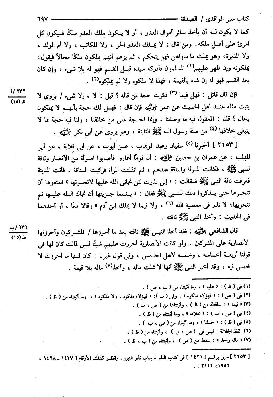 قَالَ الشَّافِعِيُّ : فَقَدْ أَخَذَ النَّبِيُّ - صلى الله عليه وسلم - نَاقَتَهُ بَعْدَمَا أَحْرَزَهَا الْمُشْرِكُونَ وَأَحْرَزَتْهَا الْأَنْصَارِيَّةُ عَلَى الْمُشْرِكِينَ وَلَوْ كَانَتْ الْأَنْصَارِيَّةُ أَحْرَزَتْ عَلَيْهِمْ شَيْئًا لَيْسَ لِمَالِكٍ كَانَ لَهَا فِي قَوْلِنَا أَرْبَعَةُ أَخْمَاسِهِ وَخُمْسُهُ لِأَهْلِ الْخُمْسِ وَفِي قَوْلِ غَيْرِنَا كَانَ لَهَا مَا أَحْرَزَتْ لاَ خُمْسَ فِيهِ وَقَدْ أَخْبَرَ النَّبِيُّ - صلى الله عليه وسلم - أَنَّهَا لاَ تَمْلِكُ مَالَهُ وَأَخَذَ مَالَهُ بِلاَ قِيمَةٍ@