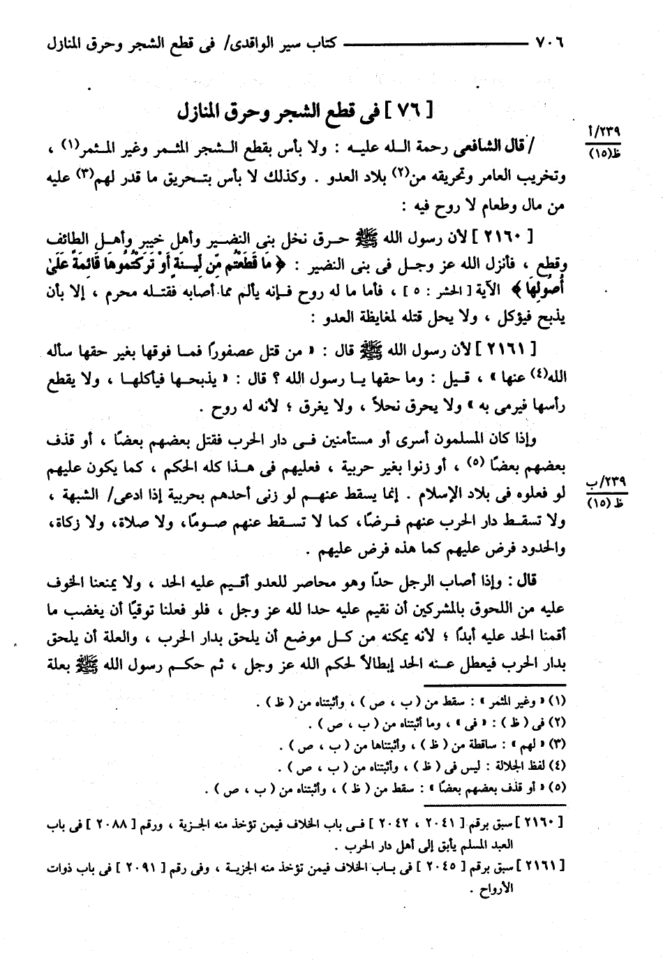 قَالَ الشَّافِعِيُّ : رحمه الله تعالى : وَلاَ بَأْسَ بِقَطْعِ الشَّجَرِ الْمُثْمِرِ وَتَخْرِيبِ الْعَامِرِ وَتَحْرِيقِهِ مِنْ بِلاَدِ الْعَدُوِّ وَكَذَلِكَ لاَ بَأْسَ بِتَحْرِيقِ مَا قَدَرَ لَهُمْ عَلَيْهِ مِنْ مَالٍ وَطَعَامٍ لاَ رُوحَ فِيهِ لِأَنَّ رَسُولَ اللَّهِ - صلى الله عليه وسلم - حَرَّقَ نَخْلَ بَنِي النَّضِيرِ وَأَهْلِ خَيْبَرَ وَأَهْلِ الطَّائِفِ وَقَطَعَ فَأَنْزَلَ اللَّهُ عَزَّ وَجَلَّ فِي بَنِي النَّضِيرِ { مَا قَطَعْتُمْ مِنْ لِينَةٍ أَوْ تَرَكْتُمُوهَا قَائِمَةً عَلَى أُصُولِهَا } الْآيَةُ فَأَمَّا مَالَهُ رُوحٌ فَإِنَّهُ يَأْلَمُ مِمَّا أَصَابَهُ فَقَتْلُهُ مُحَرَّمٌ إلَّا بِأَنْ يُذْبَحَ فَيُؤْكَلَ وَلاَ يَحِلُّ قَتْلُهُ لِمُغَايَظَةِ الْعَدُوِّ لِأَنَّ رَسُولَ اللَّهِ - صلى الله عليه وسلم - قَالَ : { مَنْ قَتَلَ عُصْفُورًا فَمَا فَوْقَهَا بِغَيْرِ حَقِّهَا سَأَلَهُ اللَّهُ عَنْهَا قِيلَ : وَمَا حَقُّهَا يَا رَسُولَ اللَّهِ قَالَ : يَذْبَحُهَا فَيَأْكُلَهَا وَلاَ يَقْطَعَ رَأْسَهَا فَيَرْمِيَ بِهِ } وَلاَ يُحَرِّقُ نَحْلاً وَلاَ يُغْرِقُ لِأَنَّهُ لَهُ رُوحٌ وَإِذَا كَانَ الْمُسْلِمُونَ أَسْرَى أَوْ مُسْتَأْمَنِينَ فِي دَارِ الْحَرْبِ فَقَتَلَ بَعْضُهُمْ بَعْضًا أَوْ قَذَفَ بَعْضُهُمْ بَعْضًا أَوْ زَنَوْا بِغَيْرِ حَرْبِيَّةٍ فَعَلَيْهِمْ فِي هَذَا كُلِّهِ الْحُكْمُ كَمَا يَكُونُ عَلَيْهِمْ لَوْ فَعَلُوهُ فِي بِلاَدِ الْإِسْلاَمِ إنَّمَا يَسْقُطُ عَنْهُمْ لَوْ زَنَى أَحَدُهُمْ بِحَرْبِيَّةٍ إذَا ادَّعَى الشُّبْهَةَ , وَلاَ تُسْقِطُ دَارُ الْحَرْبِ . عَنْهُمْ فَرْضًا كَمَا لاَ تُسْقِطُ عَنْهُمْ صَوْمًا وَلاَ صَلاَةً وَلاَ زَكَاةً وَالْحُدُودُ فَرْضٌ عَلَيْهِمْ كَمَا هَذِهِ فَرْضٌ عَلَيْهِمْ , قَالَ : وَإِذَا أَصَابَ الرَّجُلُ حَدًّا وَهُوَ مُحَاصِرٌ لِلْعَدُوِّ أُقِيمَ عَلَيْهِ الْحَدُّ وَلاَ يَمْنَعُنَا الْخَوْفُ عَلَيْهِ مِنْ اللُّحُوقِ بِالْمُشْرِكِينَ أَنْ نُقِيمَ عَلَيْهِ حَدًّا لِلَّهِ عَزَّ وَجَلَّ فَلَوْ فَعَلْنَا تَوَقِّيًا أَنْ يَغْضَبَ مَا أَقَمْنَا الْحَدَّ عَلَيْهِ أَبَدًا لِأَنَّهُ يُمْكِنُهُ مِنْ كُلِّ مَوْضِعٍ أَنْ يَلْحَقَ بِدَارِ الْحَرْبِ وَالْعِلَّةُ أَنْ يَلْحَقَ بِدَارِ الْحَرْبِ فَيُعَطَّلَ عَنْهُ الْحَدُّ إبْطَالاً لِحُكْمِ اللَّهِ عَزَّ وَجَلَّ ثُمَّ حَكَمَ رَسُولُ اللَّهِ - صلى الله عليه وسلم - بِعِلَّةِ @