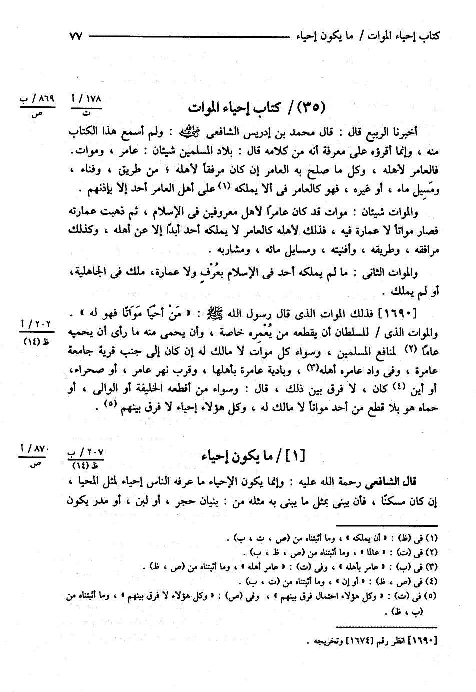 إحْيَاءُ الْمَوَاتِ ( أَخْبَرَنَا الرَّبِيعُ ) قَالَ : قَالَ مُحَمَّدُ بْنُ إدْرِيسَ الشَّافِعِيُّ : وَلَمْ أَسْمَعْ هَذَا الْكِتَابَ مِنْهُ , وَإِنَّمَا أَقْرَأهُ عَلَى مَعْرِفَةِ أَنَّهُ كَانَ مِنْ كَلاَمِهِ قَالَ : وَبِلاَدُ الْمُسْلِمِينَ شَيْئَانِ عَامِرٌ وَمَوَاتٌ فَالْعَامِرُ لِأَهْلِهِ وَكُلُّ مَا صَلُحَ بِهِ الْعَامِرُ إنْ كَانَ مُرْفَقًا لِأَهْلِهِ مِنْ طَرِيقٍ وَفِنَاءٍ وَمَسِيلِ مَاءٍ , أَوْ غَيْرِهِ فَهُوَ كَالْعَامِرِ فِي أَنْ لاَ يَمْلِكَهُ عَلَى أَهْلِ الْعَامِرِ أَحَدٌ إلَّا بِإِذْنِهِمْ وَالْمَوَاتُ شَيْئَانِ مَوَاتٌ قَدْ كَانَ عَامِرًا لِأَهْلٍ مَعْرُوفِينَ فِي الْإِسْلاَمِ ثُمَّ ذَهَبَتْ عِمَارَتُهُ فَصَارَ مَوَاتًا لاَ عِمَارَةَ فِيهِ فَذَلِكَ لِأَهْلِهِ كَالْعَامِرِ لاَ يَمْلِكُهُ أَحَدٌ أَبَدًا إلَّا عَنْ أَهْلِهِ , وَكَذَلِكَ مَرَافِقُهُ وَطَرِيقُهُ وَأَفْنَيْته وَمَسَايِلُ مَائِهِ وَمَشَارِبُهُ . وَالْمَوَاتُ الثَّانِي مَا لَمْ يَمْلِكْهُ أَحَدٌ فِي الْإِسْلاَمِ بِعُرْفٍ , وَلاَ عِمَارَةٍ , مُلِكَ فِي الْجَاهِلِيَّةِ , أَوْ لَمْ يُمْلَكْ فَذَلِكَ الْمَوَاتُ الَّذِي قَالَ رَسُولُ اللَّهِ - صلى الله عليه وسلم - { مَنْ أَحْيَا مَوَاتًا فَهُوَ لَهُ } وَالْمَوَاتُ الَّذِي لِلسُّلْطَانِ أَنْ يَقْطَعَهُ مَنْ يُعَمِّرُهُ خَاصَّةً وَأَنْ يَحْمِيَ مِنْهُ مَا رَأَى أَنْ يَحْمِيَهُ عَامًّا لِمَنَافِع الْمُسْلِمِينَ وَسَوَاءٌ كُلُّ مَوَاتٍ لاَ مَالِكَ لَهُ إنْ كَانَ إلَى جَنْبِ قَرْيَةٍ جَامِعَةٍ عَامِرَةٍ , وَفِي وَادٍ عَامِرٍ بِأَهْلِهِ وَبَادِيَةٍ عَامِرَةٍ بِأَهْلِهَا وَقُرْبِ نَهْرٍ عَامِرٍ , أَوْ صَحْرَاءَ أَوْ أَيْنَ كَانَ لاَ فَرْقَ بَيْنَ ذَلِكَ , قَالَ وَسَوَاءٌ مَنْ أَقْطَعَهُ الْخَلِيفَةُ أَوْ الْوَالِي , أَوْ حَمَاهُ هُوَ بِلاَ قَطْعٍ مِنْ أَحَدٍ مَوَاتًا لاَ مَالِكَ لَهُ وَكُلُّ هَؤُلاَءِ أَحْيَاءٌ لاَ فَرْقَ بَيْنَهُمْ .