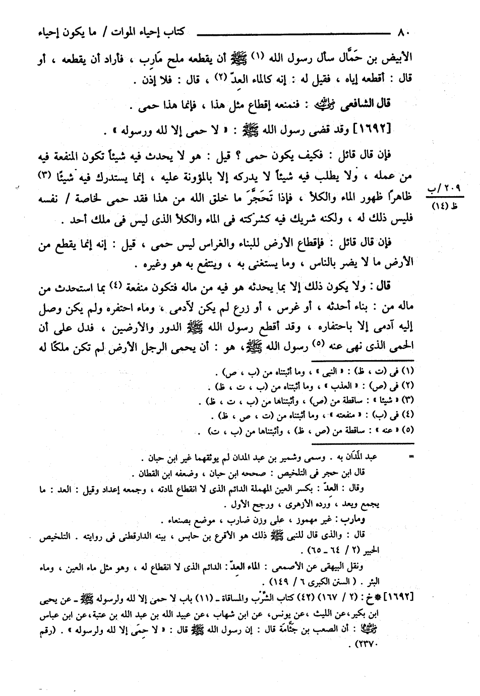 قَالَ الشَّافِعِيُّ : فَنَمْنَعُهُ إقْطَاعَ مِثْلِ هَذَا فَإِنَّمَا هَذَا حِمًى , وَقَدْ قَضَى رَسُولُ اللَّهِ - صلى الله عليه وسلم - { لاَ حِمَى إلَّا لِلَّهِ وَرَسُولِهِ } فَإِنْ قَالَ قَائِلٌ : فَكَيْفَ يَكُونُ حِمًى ؟ قِيلَ : هُوَ لاَ يُحْدِثُ فِيهِ شَيْئًا تَكُونُ الْمَنْفَعَةُ فِيهِ مِنْ عَمَلِهِ , وَلاَ يَطْلُبُ فِيهِ شَيْئًا لاَ يُدْرِكُهُ إلَّا بِالْمُؤْنَةِ عَلَيْهِ إنَّمَا يَسْتَدِرْك فِيهِ شَيْئًا ظَاهِرًا ظُهُورَ الْمَاءِ وَالْكَلاَِ , فَإِذَا تَحَجَّرَ مَا خَلَقَ اللَّهُ مِنْ هَذَا , فَقَدْ حَمَى لِخَاصَّةِ نَفْسِهِ فَلَيْسَ ذَلِكَ لَهُ , وَلَكِنَّهُ شَرِيكٌ فِيهِ كَشَرِكَتِهِ فِي الْمَاءِ وَالْكَلاَِ الَّذِي لَيْسَ فِي مِلْكِ أَحَدٍ , فَإِنْ قَالَ قَائِلٌ : فَإِقْطَاعُ الْأَرْضِ لِلْبِنَاءِ وَالْغِرَاسِ لَيْسَ حِمًى , قِيلَ : إنَّهُ إنَّمَا يَقْطَعُ مِنْ الْأَرْضِ مَا لاَ يَضُرُّ بِالنَّاسِ وَمَا يَسْتَغْنِي بِهِ وَيَنْتَفِعُ بِهِ هُوَ وَغَيْرُهُ , قَالَ : وَلاَ يَكُونُ ذَلِكَ إلَّا بِمَا يُحْدِثُهُ هُوَ فِيهِ مِنْ مَالٍ فَتَكُونُ مَنْفَعَتُهُ بِمَا اسْتَحْدَثَ مِنْ مَالِهِ مِنْ بِنَاءٍ أَحْدَثَهُ , أَوْ غَرْسٍ , أَوْ زَرْعٍ لَمْ يَكُنْ لِآدَمِيٍّ وَمَاءٍ احْتَفَرَهُ , وَلَمْ يَكُنْ وَصَلَ إلَيْهِ آدَمِيٌّ إلَّا بِاحْتِفَارِهِ , وَقَدْ أَقْطَعَ رَسُولُ اللَّهِ - صلى الله عليه وسلم - وَسَلَّمَ الدُّورَ وَالْأَرْضِينَ , فَدَلَّ عَلَى أَنَّ الْحِمَى الَّذِي نَهَى عَنْهُ رَسُولُ اللَّهِ - صلى الله عليه وسلم - هُوَ أَنْ يَحْمِيَ الرَّجُلُ الْأَرْضَ لَمْ تَكُنْ مِلْكًا لَهُ ,@