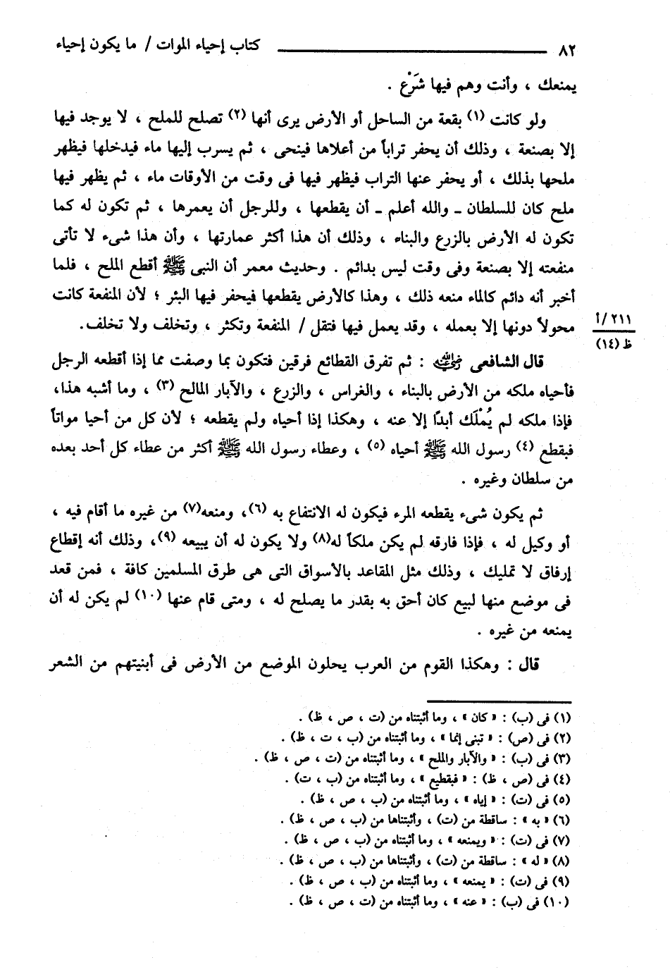 يَمْنَعْك وَأَنْتَ وَهُمْ فِيهَا شُرَّعٌ , وَلَوْ كَانَ بُقْعَةً مِنْ السَّاحِلِ , أَوْ الْأَرْضِ يَرَى أَنَّهَا تَصْلُحُ لِلْمِلْحِ لاَ يُوجَدُ فِيهَا إلَّا بِصَنْعَةٍ وَذَلِكَ أَنْ يَحْفِرَ تُرَابًا مِنْ أَعْلاَهَا فَيُنَحِّيَ ثُمَّ يُسَرِّبَ إلَيْهَا مَاءً فَيُدْخِلَهَا فَيَظْهَرَ مِلْحُهَا بِذَلِكَ , أَوْ يَحْفِرَ عَنْهَا التُّرَابَ فَيَظْهَرَ فِيهَا مِنْ وَقْتٍ مِنْ الْأَوْقَاتِ مَاءٌ ثُمَّ يَظْهَرَ فِيهَا كَانَ لِلسُّلْطَانِ وَاَللَّهُ تَعَالَى أَعْلَمُ أَنْ يَقْطَعَهَا وَلِلرَّجُلِ أَنْ يَعْمُرَهَا ثُمَّ تَكُونَ لَهُ كَمَا تَكُونُ لَهُ الْأَرْضُ بِالزَّرْعِ وَالْبِنَاءِ , وَذَلِكَ أَنَّ هَذَا أَكْثَرُ عِمَارَتِهَا وَأَنَّ هَذَا شَيْءٌ لاَ تَأْتِي مَنْفَعَتُهُ إلَّا بِصَنْعَةٍ , وَفِي وَقْتٍ لَيْسَ بِدَائِمٍ وَحَدِيثُ مَعْمَرٍ { أَنَّ النَّبِيَّ - صلى الله عليه وسلم - أَقْطَعَ الْمِلْحَ } فَلَمَّا أُخْبِرَ أَنَّهُ دَائِمٌ كَالْمَاءِ مَنَعَهُ ذَلِكَ , وَهَذَا كَالْأَرْضِ يَقْطَعُهَا فَيَحْفِرَ فِيهَا الْبِئْرَ ; لِأَنَّ الْمَنْفَعَةَ كَانَتْ مَحُولاً دُونَهَا إلَّا بِعَمَلِهِ , وَقَدْ يَعْمَلُ فِيهَا فَتَقِلُّ الْمَنْفَعَةُ وَتَكْثُرُ وَيُخْلِفُ , وَلاَ يُخْلِفُ .
