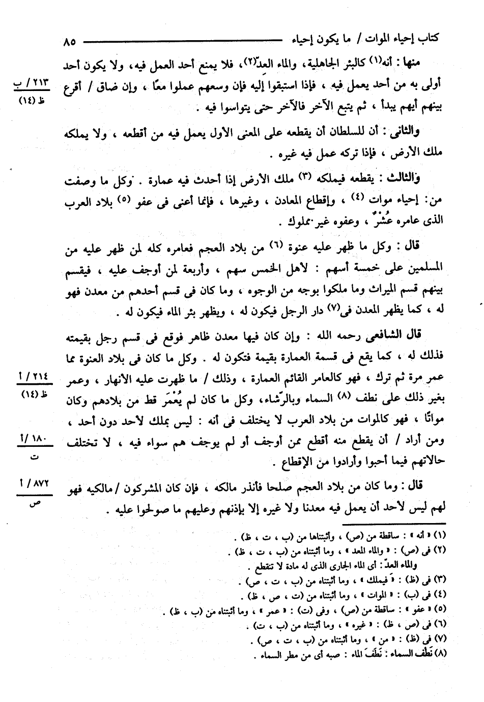 مِنْهَا أَنَّهُ كَالْبِئْرِ الْجَاهِلِيَّةِ وَالْمَاءِ الْمُعَدِّ فَلاَ يُمْنَعُ أَحَدٌ الْعَمَلَ فِيهِ , وَلاَ يَكُونُ أَحَدٌ أَوْلَى بِهِ مِنْ أَحَدٍ يَعْمَلُ فِيهِ , فَإِذَا اسْتَبَقُوا إلَيْهِ فَإِنْ وَسِعَهُمْ عَمِلُوا مَعًا , وَإِنْ ضَاقَ أُقْرِعَ بَيْنَهُمْ أَيُّهُمْ يَبْدَأُ ثُمَّ يَتْبَعُ الْآخَرُ فَالْآخَرُ حَتَّى يَتَوَاسَوْا فِيهِ . وَالثَّانِي : أَنَّ لِلسُّلْطَانِ أَنْ يَقْطَعَهُ عَلَى الْمَعْنَى الْأَوَّلِ يَعْمَلُ فِيهِ مَنْ أَقْطَعَهُ , وَلاَ يَمْلِكُهُ مِلْكَ الْأَرْضِ , فَإِذَا تَرَكَهُ عَمِلَ فِيهِ غَيْرُهُ . وَالثَّالِثُ : يَقْطَعُهُ فَيَمْلِكُهُ مِلْكَ الْأَرْضِ إذَا أَحْدَثَ فِيهِ عِمَارَةً وَكُلُّ مَا وَصَفْت مِنْ إحْيَاءِ الْمَوْتِ وَإِقْطَاعِ الْمَعَادِنِ وَغَيْرِهَا فَإِنَّمَا أَعْنِي فِي عَفْوِ بِلاَدِ الْعَرَبِ الَّذِي عَامِرُهُ عُشْرٌ وَعَفْوُهُ غَيْرُ مَمْلُوكٍ قَالَ : وَكُلُّ مَا ظَهَرَ عَلَيْهِ عَنْوَةً مِنْ بِلاَدِ الْعَجَمِ فَعَامِرُهُ كُلُّهُ لِمَنْ ظَهَرَ عَلَيْهِ مِنْ الْمُسْلِمِينَ عَلَى خَمْسَةِ أَسْهُمٍ لِأَهْلِ الْخُمْسِ سَهْمٌ وَأَرْبَعَةٌ لِمَنْ أَوْجَفَ عَلَيْهِ فَيُقَسَّمُ بَيْنَهُمْ قَسْمَ الْمِيرَاثِ وَمَا مَلَكُوا بِوَجْهٍ مِنْ الْوُجُوهِ وَمَا كَانَ فِي قَسْمِ أَحَدِهِمْ مِنْ مَعْدِنٍ فَهُوَ لَهُ كَمَا يَظْهَرُ الْمَعْدِنُ فِي دَارِ الرَّجُلِ فَيَكُونُ لَهُ وَيَظْهَرُ بِئْرُ الْمَاءِ فَيَكُونُ لَهُ .