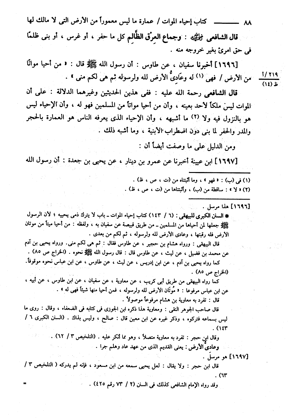قَالَ الشَّافِعِيُّ : فَفِي هَذَيْنِ الْحَدِيثَيْنِ وَغَيْرِهِمَا الدَّلاَلَةُ عَلَى أَنَّ الْمَوَاتَ لَيْسَ مِلْكًا لِأَحَدٍ بِعَيْنِهِ وَأَنَّ مَنْ أَحْيَا مَوَاتًا مِنْ الْمُسْلِمِينَ فَهُوَ لَهُ وَأَنَّ الْإِحْيَاءَ لَيْسَ هُوَ بِالنُّزُولِ فِيهِ وَمَا أَشْبَهَهُ وَأَنَّ الْإِحْيَاءَ الَّذِي يَعْرِفُهُ النَّاسُ هُوَ الْعِمَارَةُ بِالْحَجَرِ وَالْمَدَرِ وَالْحَفْرِ لِمَا بُنِيَ دُونَ اضْطِرَابِ الْأَبْنِيَةِ وَمَا أَشْبَهَ ذَلِكَ وَمِنْ الدَّلِيلِ عَلَى مَا وَصَفْت أَيْضًا أَنَّ ابْنَ عُيَيْنَةَ أَخْبَرَنَا عَنْ عَمْرِو بْنِ دِينَارٍ عَنْ يَحْيَى بْنِ جَعْدَةَ { أَنَّ رَسُولَ اللَّهِ @