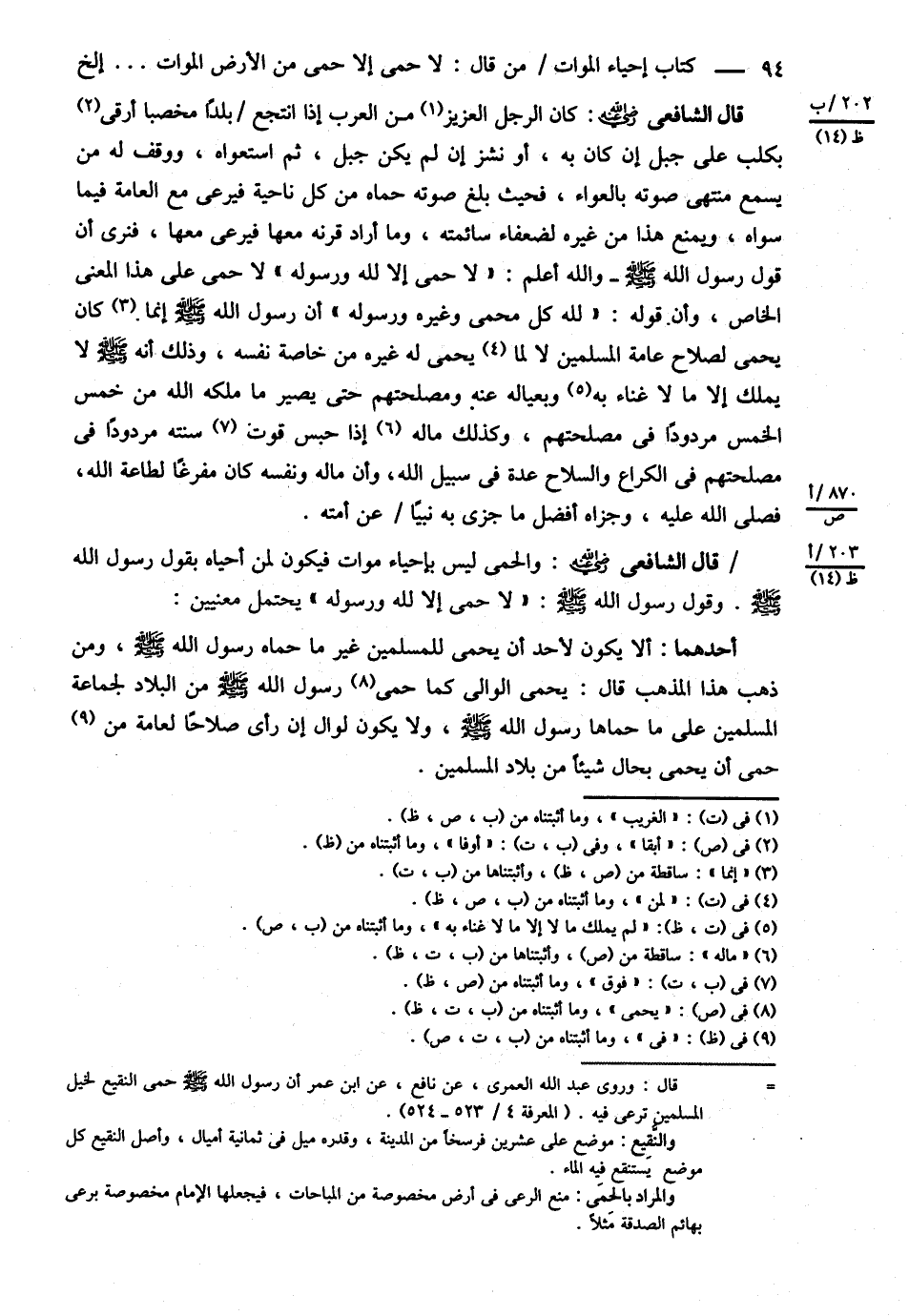 قَالَ الشَّافِعِيُّ : كَانَ الرَّجُلُ الْعَزِيزُ مِنْ الْعَرَبِ إذَا انْتَجَعَ بَلَدًا مُخْصِبًا أَوْفَى بِكَلْبٍ عَلَى جَبَلٍ إنْ كَانَ بِهِ , أَوْ نَشَزَ إنْ لَمْ يَكُنْ جَبَلٌ ثُمَّ اسْتَعْوَاهُ وَوَقَفَ لَهُ مَنْ يَسْمَعُ مُنْتَهَى صَوْتِهِ بِالْعُوَاءِ فَحَيْثُ بَلَغَ صَوْتُهُ حَمَاهُ مِنْ كُلِّ نَاحِيَةٍ فَيَرْعَى مَعَ الْعَامَّةِ فِيمَا سِوَاهُ وَيَمْنَعُ هَذَا مِنْ غَيْرِهِ لِضُعَفَاءِ سَائِمَتِهِ وَمَا أَرَادَ قَرْنَهُ مَعَهَا فَيَرْعَى مَعَهَا فَنَرَى أَنَّ قَوْلَ رَسُولِ اللَّهِ - صلى الله عليه وسلم - وَاَللَّهُ أَعْلَمُ " { لاَ حِمَى إلَّا لِلَّهِ وَرَسُولِهِ } لاَ حِمَى عَلَى هَذَا الْمَعْنَى الْخَاصِّ وَأَنَّ قَوْلَهُ لِلَّهِ كُلُّ مَحْمِيٍّ وَغَيْرِهِ وَرَسُولِهِ أَنَّ رَسُولَ اللَّهِ - صلى الله عليه وسلم - إنَّمَا كَانَ يَحْمِي لِصَلاَحِ عَامَّةِ الْمُسْلِمِينَ لاَ لِمَا يَحْمِي لَهُ غَيْرُهُ مِنْ خَاصَّةِ نَفْسِهِ وَذَلِكَ أَنَّهُ - صلى الله عليه وسلم - لاَ يَمْلِكُ إلَّا مَا لاَ غِنَاءَ بِهِ وَبِعِيَالِهِ عَنْهُ وَمَصْلَحَتِهِمْ حَتَّى يَصِيرَ مَا مَلَّكَهُ اللَّهُ مِنْ خُمْسِ الْخُمْسِ مَرْدُودًا فِي مَصْلَحَتِهِمْ , وَكَذَلِكَ مَالُهُ إذَا حَبَسَ فَوْقَ سَنَتِهِ مَرْدُودًا فِي مَصْلَحَتِهِمْ فِي الْكُرَاعِ وَالسِّلاَحِ عِدَّةً فِي سَبِيلِ اللَّهِ وَأَنَّ مَالَهُ وَنَفْسَهُ كَانَ مُفْرَغًا لِطَاعَةِ اللَّهِ تَعَالَى فَj وَجَزَاهُ أَفْضَلَ مَا جَزَى بِهِ نَبِيًّا عَنْ أُمَّتِهِ .