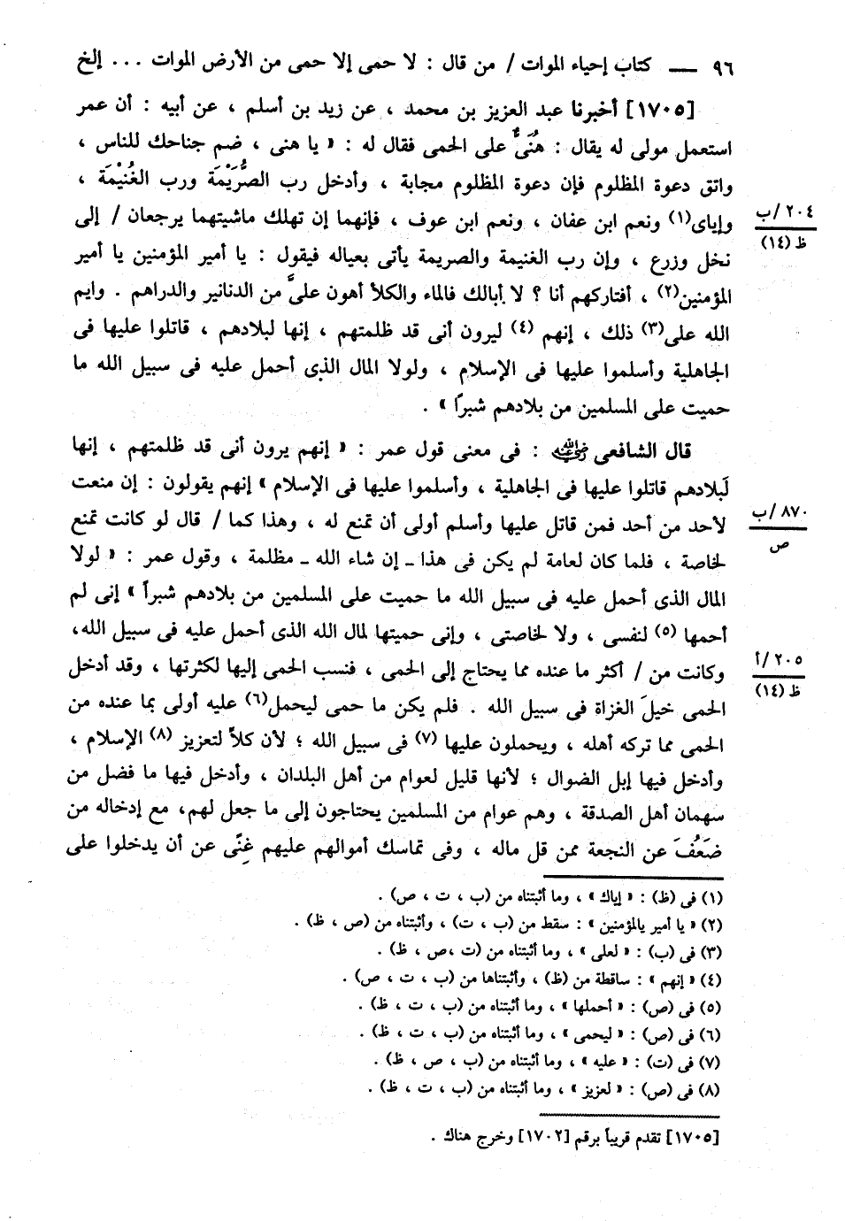 قَالَ الشَّافِعِيُّ : فِي مَعْنَى قَوْلِ عُمَرَ " إنَّهُمْ يَرَوْنِي أَنِّي قَدْ ظَلَمْتُهُمْ إنَّهَا لَبِلاَدُهُمْ قَاتَلُوا عَلَيْهَا فِي الْجَاهِلِيَّةِ , وَأَسْلَمُوا عَلَيْهَا فِي الْإِسْلاَمِ إنَّهُمْ يَقُولُونَ إنْ مَنَعْت لِأَحَدٍ مِنْ أَحَدٍ مَنْ قَاتَلَ عَلَيْهَا وَأَسْلَمَ أَوْلَى أَنْ تَمْنَعَ لَهُ " , وَهَذَا كَمَا قَالَ : لَوْ كَانَتْ تُمْنَعُ لِخَاصَّةٍ فَلِمَا كَانَ لِعَامَّةٍ لَمْ يَكُنْ فِي هَذَا إنْ شَاءَ اللَّهُ مَظْلِمَةٌ . وَقَوْلُ عُمَرَ " لَوْلاَ الْمَالُ الَّذِي أَحْمِلُ عَلَيْهِ فِي سَبِيلِ اللَّهِ مَا حَمَيْت عَلَى الْمُسْلِمِينَ مِنْ بِلاَدِهِمْ شِبْرًا إنِّي لَمْ أَحْمِهَا لِنَفْسِي , وَلاَ لِخَاصَّتِي وَإِنِّي حَمَيْتهَا لِمَالِ اللَّهِ الَّذِي أَحْمِلُ عَلَيْهِ فِي سَبِيلِ اللَّهِ وَكَانَتْ مِنْ أَكْثَرِ مَا عِنْدَهُ مِمَّا يَحْتَاجُ إلَى الْحِمَى فَنَسَبَ الْحِمَى إلَيْهَا لِكَثْرَتِهَا , وَقَدْ أَدْخَلَ الْحِمَى خَيْلَ الْغُزَاةِ فِي سَبِيلِ اللَّهِ " فَلَمْ يَكُنْ مَا حَمَى لِيُحْمَلَ عَلَيْهِ أَوْلَى بِمَا عِنْدَهُ مِنْ الْحِمَى مِمَّا تَرَكَهُ أَهْلُهُ وَيَحْمِلُونَ عَلَيْهَا فِي سَبِيلِ اللَّهِ ; لِأَنَّ كُلًّا لِتَعْزِيرِ الْإِسْلاَمِ , وَأَدْخَلَ فِيهَا إبِلَ الضَّوَالِّ ; لِأَنَّهَا قَلِيلٌ لِعَوَامَّ مِنْ أَهْلِ الْبُلْدَانِ وَأَدْخَلَ فِيهَا مَا فَضَلَ مِنْ سُهْمَانِ أَهْلِ الصَّدَقَةِ مِنْ إبِلِ الصَّدَقَةِ وَهُمْ عَوَامُّ مِنْ الْمُسْلِمِينَ يَحْتَاجُونَ إلَى مَا جَعَلَ مَعَ إدْخَالِهِ مَنْ ضَعُفَ عَنْ النُّجْعَةِ مِمَّنْ قَلَّ مَالُهُ , وَفِي تَمَاسُكِ أَمْوَالِهِمْ عَلَيْهِمْ غِنًى عَنْ أَنْ يُدْخَلُوا عَلَى@