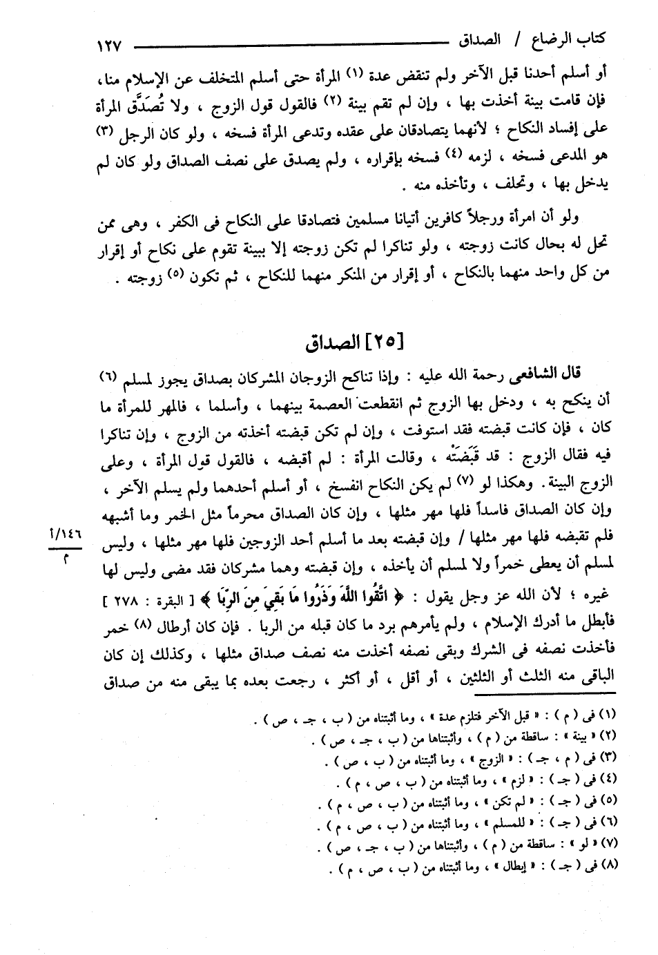 قَالَ الشَّافِعِيُّ : رحمه الله تعالى : وَإِذَا تَنَاكَحَ الزَّوْجَانِ الْمُشْرِكَانِ بِصَدَاقٍ يَجُوزُ لِمُسْلِمٍ أَنْ يَنْكِحَ بِهِ وَدَخَلَ بِهَا الزَّوْجُ ثُمَّ انْقَطَعَتْ الْعِصْمَةُ بَيْنَهُمَا وَأَسْلَمَا فَالْمَهْرُ لِلْمَرْأَةِ مَا كَانَ فَإِنْ كَانَتْ قَبَضَتْهُ فَقَدْ اسْتَوْفَتْ وَإِنْ لَمْ تَكُنْ قَبَضَتْهُ أَخَذَتْهُ مِنْ الزَّوْجِ وَإِنْ تَنَاكَرَا فِيهِ فَقَالَ الزَّوْجُ قَدْ قَبَضْته وَقَالَتْ الْمَرْأَةُ لَمْ أَقْبِضْهُ فَالْقَوْلُ قَوْلُ الْمَرْأَةِ وَعَلَى الزَّوْجِ الْبَيِّنَةُ وَهَكَذَا لَوْ لَمْ يَكُنْ النِّكَاحُ انْفَسَخَ أَوْ أَسْلَمَ أَحَدُهُمَا وَلَمْ يُسْلِمْ الْآخَرُ وَإِنْ كَانَ الصَّدَاقُ فَاسِدًا فَلَهَا مَهْرُ مِثْلِهَا وَإِنْ كَانَ الصَّدَاقُ مُحَرَّمًا مِثْلَ الْخَمْرِ وَمَا أَشْبَهَهُ فَلَمْ تَقْبِضْهُ فَلَهَا مَهْرُ مِثْلِهَا وَإِنْ قَبَضَتْهُ بَعْدَمَا أَسْلَمَ أَحَدُ الزَّوْجَيْنِ فَلَهَا مَهْرُ مِثْلِهَا وَلَيْسَ لِمُسْلِمٍ أَنْ يُعْطِيَ خَمْرًا وَلاَ لِمُسْلِمٍ أَنْ يَأْخُذَهُ وَإِنْ قَبَضَتْهُ وَهُمَا مُشْرِكَانِ فَقَدْ مَضَى وَلَيْسَ لَهَا غَيْرُهُ لِأَنَّ اللَّهَ عَزَّ وَجَلَّ يَقُولُ { اتَّقُوا اللَّهَ وَذَرُوا مَا بَقِيَ مِنْ الرِّبَا } فَأَبْطَلَ مَا أَدْرَكَ الْإِسْلاَمُ وَلَمْ يَأْمُرْهُمْ بِرَدِّ مَا كَانَ قَبْلَهُ مِنْ الرِّبَا فَإِنْ كَانَ أَرْطَالَ خَمْرٍ فَأَخَذَتْ نِصْفَهُ فِي الشِّرْكِ وَبَقِيَ نِصْفُهُ أَخَذَتْ مِنْهُ نِصْفَ صَدَاقِ مِثْلِهَا وَكَذَلِكَ إنْ كَانَ الْبَاقِي مِنْهُ الثُّلُثَ أَوْ الثُّلُثَيْنِ أَوْ أَقَلَّ أَوْ أَكْثَرَ رَجَعَتْ بَعْدَهُ بِمَا يَبْقَى مِنْهُ مِنْ صَدَاقِ@