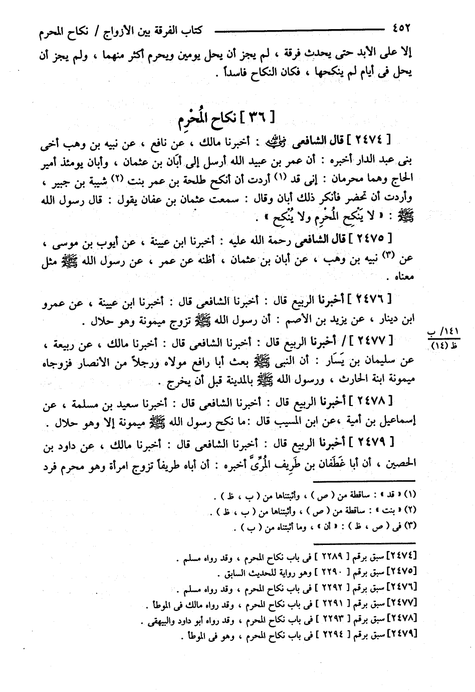 قَالَ الشَّافِعِيُّ : أَخْبَرَنَا ابْنُ عُيَيْنَةَ عَنْ أَيُّوبَ بْنِ مُوسَى عَنْ نَبِيهِ بْنِ وَهْبٍ عَنْ أَبَانَ بْنِ عُثْمَانَ أَظُنُّهُ عَنْ عُمَرَ عَنْ رَسُولِ اللَّهِ - صلى الله عليه وسلم - مِثْلَ مَعْنَاهُ ( أَخْبَرَنَا الرَّبِيعُ ) قَالَ ( أَخْبَرَنَا الشَّافِعِيُّ ) قَالَ أَخْبَرَنَا ابْنُ عُيَيْنَةَ عَنْ عَمْرِو بْنِ دِينَارٍ عَنْ يَزِيدَ بْنِ الْأَصَمِّ { أَنَّ رَسُولَ اللَّهِ - صلى الله عليه وسلم - تَزَوَّجَ مَيْمُونَةَ وَهُوَ حَلاَلٌ } ( أَخْبَرَنَا الرَّبِيعُ ) قَالَ ( أَخْبَرَنَا الشَّافِعِيُّ ) قَالَ أَخْبَرَنَا مَالِكٌ عَنْ رَبِيعَةَ عَنْ سُلَيْمَانَ بْنِ يَسَارٍ { أَنَّ النَّبِيَّ - صلى الله عليه وسلم - بَعَثَ أَبَا رَافِعٍ مَوْلاَهُ وَرَجُلاً مِنْ الْأَنْصَارِ فَزَوَّجَاهُ مَيْمُونَةَ ابْنَةَ الْحَارِثِ وَرَسُولُ اللَّهِ - صلى الله عليه وسلم - بِالْمَدِينَةِ قَبْلَ أَنْ يَخْرُجَ } ( أَخْبَرَنَا الرَّبِيعُ ) قَالَ أَخْبَرَنَا الشَّافِعِيُّ قَالَ أَخْبَرَنَا سَعِيدُ بْنُ مَسْلَمَةَ عَنْ إسْمَاعِيلَ بْنِ أُمَيَّةَ عَنْ ابْنِ الْمُسَيِّبِ قَالَ { مَا نَكَحَ رَسُولُ اللَّهِ - صلى الله عليه وسلم - مَيْمُونَةَ إلَّا وَهُوَ حَلاَلٌ } ( أَخْبَرَنَا الرَّبِيعُ ) قَالَ ( أَخْبَرَنَا الشَّافِعِيُّ ) قَالَ : أَخْبَرَنَا مَالِكٌ عَنْ دَاوُد بْنِ الْحُصَيْنِ أَنَّ أَبَا غَطَفَانَ بْنَ طَرِيفٍ الْمُرِّيُّ أَخْبَرَهُ أَنَّ أَبَاهُ طَرِيفًا تَزَوَّجَ امْرَأَةً وَهُوَ مُحْرِمٌ فَرَدَّ@