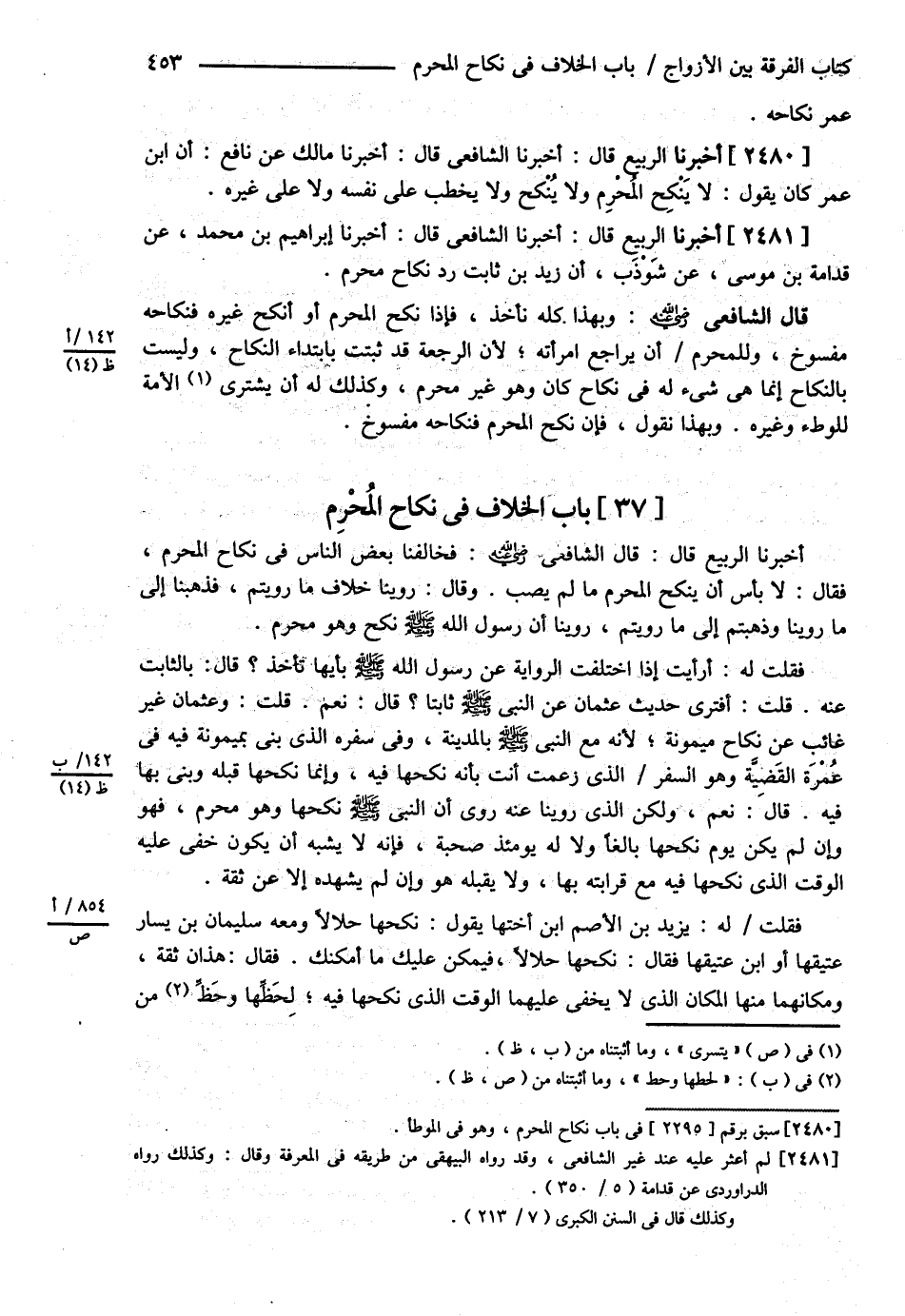 قَالَ الشَّافِعِيُّ : رحمه الله فَخَالَفَنَا بَعْضُ النَّاسِ فِي نِكَاحِ الْمُحْرِمِ فَقَالَ لاَ بَأْسَ أَنْ يَنْكِحَ الْمُحْرِمُ مَا لَمْ يُصِبْ وَقَالَ رَوَيْنَا خِلاَفَ مَا رَوَيْتُمْ فَذَهَبْنَا إلَى مَا رَوَيْنَا وَذَهَبْتُمْ إلَى مَا رَوَيْتُمْ رَوَيْنَا { أَنَّ رَسُولَ اللَّهِ - صلى الله عليه وسلم - نَكَحَ وَهُوَ مُحْرِمٌ } فَقُلْت لَهُ أَرَأَيْت إذَا اخْتَلَفَتْ الرِّوَايَةُ عَنْ رَسُولِ اللَّهِ - صلى الله عليه وسلم - بِأَيِّهَا تَأْخُذُ ؟ قَالَ بِالثَّابِتِ عَنْهُ قُلْت أَفَتَرَى حَدِيثَ عُثْمَانَ عَنْ النَّبِيِّ - صلى الله عليه وسلم - ثَابِتًا ؟ قَالَ : نَعَمْ قُلْت وَعُثْمَانُ غَيْرُ غَائِبٍ عَنْ نِكَاحِ مَيْمُونَةَ لِأَنَّهُ مَعَ النَّبِيِّ - صلى الله عليه وسلم - بِالْمَدِينَةِ وَفِي سَفَرِهِ الَّذِي بَنَى بِمَيْمُونَةَ فِيهِ فِي عُمْرَةِ الْقَضِيَّةِ وَهُوَ السَّفَرُ الَّذِي زَعَمْت أَنْتَ بِأَنَّهُ نَكَحَهَا فِيهِ وَإِنَّمَا نَكَحَهَا قَبْلَهُ وَبَنَى بِهَا فِيهِ قَالَ : نَعَمْ وَلَكِنَّ الَّذِي رَوَيْنَا عَنْهُ رَوَى أَنَّ النَّبِيَّ - صلى الله عليه وسلم - نَكَحَهَا وَهُوَ مُحْرِمٌ فَهُوَ وَإِنْ لَمْ يَكُنْ يَوْمَ نَكَحَهَا بَالِغًا وَلاَ لَهُ يَوْمئِذٍ صُحْبَةٌ فَإِنَّهُ لاَ يُشْبِهُ أَنْ يَكُونَ خَفِيَ عَلَيْهِ الْوَقْتُ الَّذِي نَكَحَهَا فِيهِ مَعَ قَرَابَتِهِ بِهَا وَلاَ يَقْبَلُهُ هُوَ وَإِنْ لَمْ يَشْهَدْهُ إلَّا عَنْ ثِقَةٍ فَقُلْت لَهُ يَزِيدُ بْنُ الْأَصَمِّ ابْنُ أُخْتِهَا يَقُولُ نَكَحَهَا حَلاَلاً وَمَعَهُ سُلَيْمَانُ بْنُ يَسَارٍ عَتِيقُهَا أَوْ ابْنُ عَتِيقِهَا فَقَالَ نَكَحَهَا حَلاَلاً فَيُمْكِنُ عَلَيْك مَا أَمْكَنَك فَقَالَ هَذَانِ ثِقَةٌ وَمَكَانَهُمَا مِنْهَا الْمَكَانَ الَّذِي لاَ يَخْفَى عَلَيْهِمَا الْوَقْتُ الَّذِي نَكَحَهَا فِيهِ لِحَظهَا وَحَظ مَنْ@