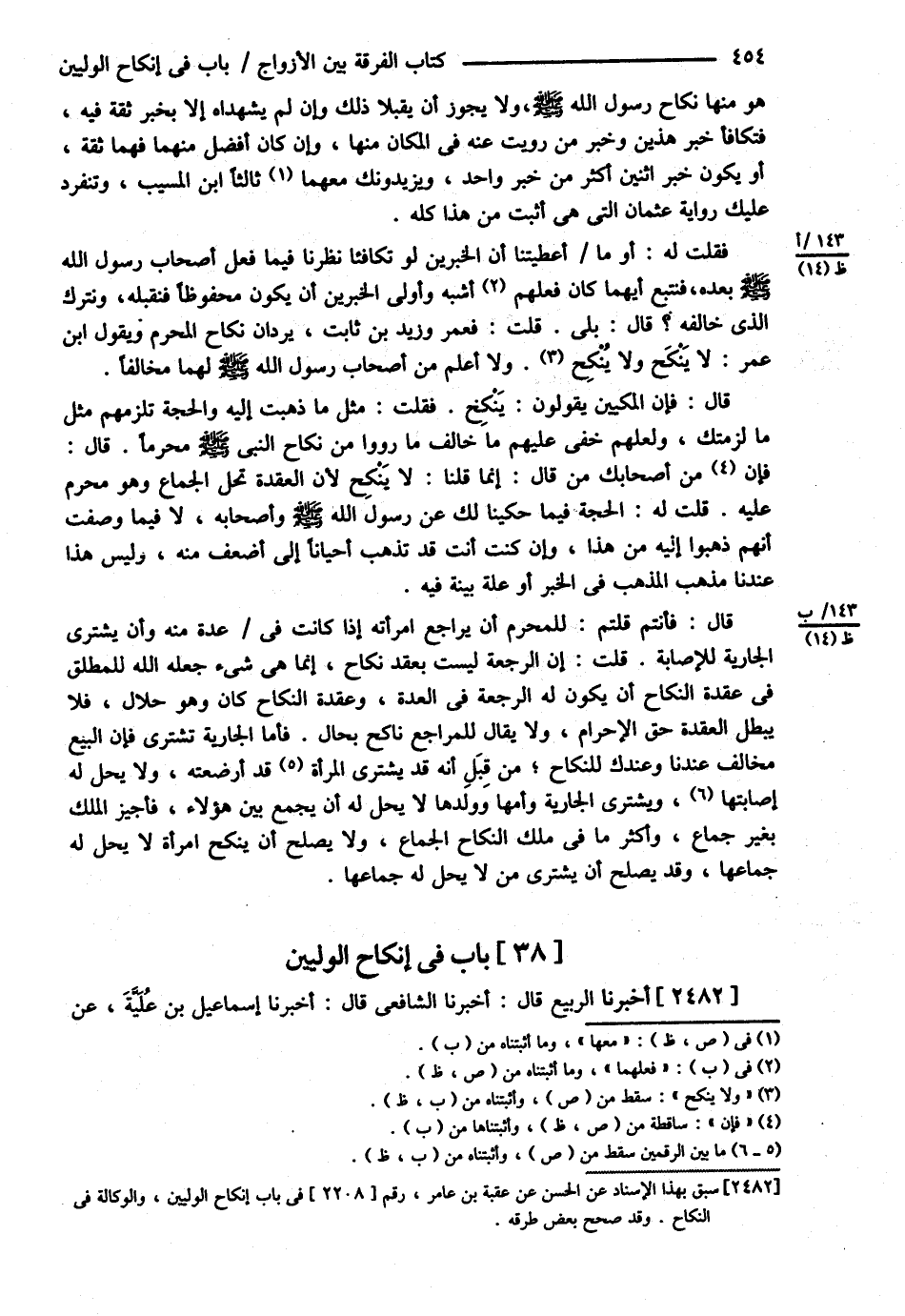 هُوَ مِنْهَا نِكَاحُ رَسُولِ اللَّهِ - صلى الله عليه وسلم - وَلاَ يَجُوزُ أَنْ يَقْبَلاَ ذَلِكَ وَإِنْ لَمْ يَشْهَدَاهُ إلَّا بِخَبَرِ ثِقَةٍ فِيهِ فَتَكَافَأَ خَبَرُ هَذَيْنِ وَخَبَرُ مَنْ رَوَيْت عَنْهُ فِي الْمَكَانِ مِنْهَا وَإِنْ كَانَ أَفْضَلَ مِنْهُمَا فَهُمَا ثِقَةٌ أَوْ يَكُونُ خَبَرُ اثْنَيْنِ أَكْثَرَ مِنْ خَبَرِ وَاحِدٍ وَيَزِيدُونَك مَعَهُمَا ثَالِثًا ابْنُ الْمُسَيِّبِ وَتَنْفَرِدُ عَلَيْك رِوَايَةُ عُثْمَانَ الَّتِي هِيَ أَثْبَتُ مِنْ هَذَا كُلِّهِ فَقُلْت لَهُ : أَوْ مَا أَعْطَيْتنَا أَنَّ الْخَبَرَيْنِ لَوْ تَكَافَآ نَظَرْنَا فِيمَا فَعَلَ أَصْحَابُ رَسُولِ اللَّهِ - صلى الله عليه وسلم - بَعْدَهُ فَنَتَّبِعُ أَيَّهمَا كَانَ فِعْلُهُمَا أَشْبَهَ , وَأَوْلَى الْخَبَرَيْنِ أَنْ يَكُونَ مَحْفُوظًا فَنَقْبَلَهُ وَنَتْرُكَ الَّذِي خَالَفَهُ ؟ قَالَ : بَلَى قُلْت فَعُمَرُ وَيَزِيدُ بْنُ ثَابِتٍ يَرُدَّانِ نِكَاحَ الْمُحْرِمِ وَيَقُولُ ابْنُ عُمَرَ لاَ يَنْكِحُ وَلاَ يُنْكَحُ وَلاَ أَعْلَمُ مِنْ أَصْحَابِ رَسُولِ اللَّهِ - صلى الله عليه وسلم - لَهُمَا مُخَالِفًا قَالَ فَإِنَّ الْمَكِّيِّينَ يَقُولُونَ يَنْكِحُ . فَقُلْت مِثْلَ مَا ذَهَبْت إلَيْهِ وَالْحُجَّةُ تَلْزَمُهُمْ مِثْلَ مَا لَزِمَتْك وَلَعَلَّهُمْ خَفِيَ عَلَيْهِمْ مَا خَالَفَ مَا رَوَوْا مِنْ نِكَاحِ النَّبِيِّ - صلى الله عليه وسلم - مُحْرِمًا قَالَ فَإِنَّ مِنْ أَصْحَابِك مَنْ قَالَ إنَّمَا قُلْنَا لاَ يَنْكِحُ لِأَنَّ الْعُقْدَةَ تُحِلُّ الْجِمَاعَ وَهُوَ مُحَرَّمٌ عَلَيْهِ قُلْت لَهُ الْحُجَّةُ فِيمَا حَكَيْنَا لَك عَنْ رَسُولِ اللَّهِ - صلى الله عليه وسلم - وَأَصْحَابِهِ لاَ فِيمَا وَصَفْت أَنَّهُمْ ذَهَبُوا إلَيْهِ مِنْ هَذَا وَإِنْ كُنْت أَنْتَ قَدْ تَذْهَبُ أَحْيَانًا إلَى أَضْعَفَ مِنْهُ وَلَيْسَ هَذَا عِنْدَنَا مَذْهَبَ الْمَذَاهِبِ فِي الْخَبَرِ أَوْ عِلَّةً بَيِّنَةً فِيهِ قَالَ فَأَنْتُمْ قُلْتُمْ لِلْمُحْرِمِ أَنْ يُرَاجِعَ امْرَأَتَهُ إذَا كَانَتْ فِي عِدَّةٍ مِنْهُ وَأَنْ يَشْتَرِيَ الْجَارِيَةَ لِلْإِصَابَةِ قُلْت إنَّ الرَّجْعَةَ لَيْسَتْ بِعَقْدِ نِكَاحٍ إنَّمَا هِيَ شَيْءٌ جَعَلَهُ اللَّهُ لِلْمُطَلِّقِ فِي عُقْدَةِ النِّكَاحِ أَنْ يَكُونَ لَهُ الرَّجْعَةُ فِي الْعِدَّةِ وَعُقْدَةُ النِّكَاحِ كَانَ وَهُوَ حَلاَلٌ فَلاَ يُبْطِلُ الْعُقْدَةَ حَقُّ الْإِحْرَامِ وَلاَ يُقَالُ لِلْمُرَاجِعِ نَاكِحٌ بِحَالِ فَأَمَّا الْجَارِيَةُ تُشْتَرَى فَإِنَّ الْبَيْعَ مُخَالِفٌ عِنْدَنَا وَعِنْدَك لِلنِّكَاحِ مِنْ قِبَلِ أَنَّهُ قَدْ يَشْتَرِي الْمَرْأَةَ قَدْ أَرْضَعَتْهُ وَلاَ يَحِلُّ لَهُ إصَابَتُهَا وَيَشْتَرِي الْجَارِيَةَ وَأُمَّهَا وَوَلَدَهَا لاَ يَحِلُّ لَهُ أَنْ يَجْمَعَ بَيْنَ هَؤُلاَءِ فَأُجِيزَ الْمِلْكُ بِغَيْرِ جِمَاعٍ وَأَكْثَرُ مَا فِي مِلْكِ النِّكَاحِ الْجِمَاعُ وَلاَ يَصْلُحُ أَنْ يَنْكِحَ امْرَأَةً لاَ يَحِلُّ لَهُ جِمَاعُهَا وَقَدْ يَصْلُحُ أَنْ يَشْتَرِيَ مَنْ لاَ يَحِلُّ لَهُ جِمَاعُهَا .