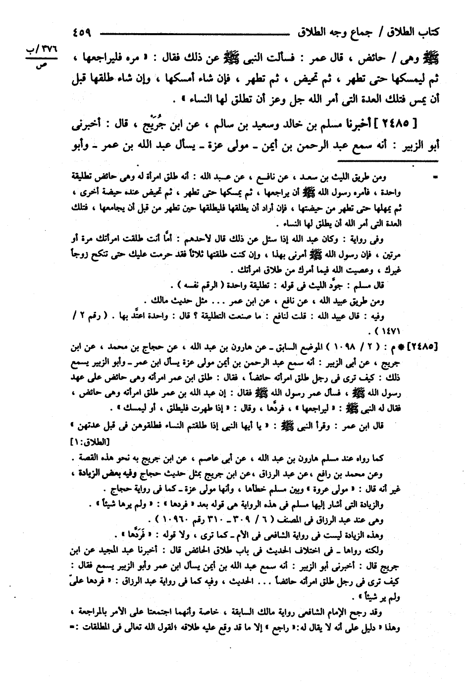 - صلى الله عليه وسلم - وَهِيَ حَائِضٌ قَالَ عُمَرُ فَسَأَلْتُ النَّبِيَّ - صلى الله عليه وسلم - عَنْ ذَلِكَ فَقَالَ مُرْهُ فَلْيُرَاجِعْهَا ثُمَّ لِيُمْسِكْهَا حَتَّى تَطْهُرَ ثُمَّ تَحِيضَ ثُمَّ تَطْهُرَ فَإِنْ شَاءَ أَمْسَكَهَا وَإِنْ شَاءَ طَلَّقَهَا قَبْلَ أَنْ يَمَسَّ فَتِلْكَ الْعِدَّةُ الَّتِي أَمَرَ اللَّهُ عَزَّ وَجَلَّ أَنْ تَطْلُقَ لَهَا النِّسَاءُ } أَخْبَرَنَا مُسْلِمُ بْنُ خَالِدٍ وَسَعِيدُ بْنُ سَالِمٍ عَنْ ابْنِ جُرَيْجٍ قَالَ أَخْبَرَنِي أَبُو الزُّبَيْرِ أَنَّهُ سَمِعَ عَبْدَ الرَّحْمَنِ بْنَ أَيْمَنَ مَوْلَى عَزَّةَ يَسْأَلُ عَبْدَ اللَّهَ بْنَ عُمَرَ وَأَبُو@
