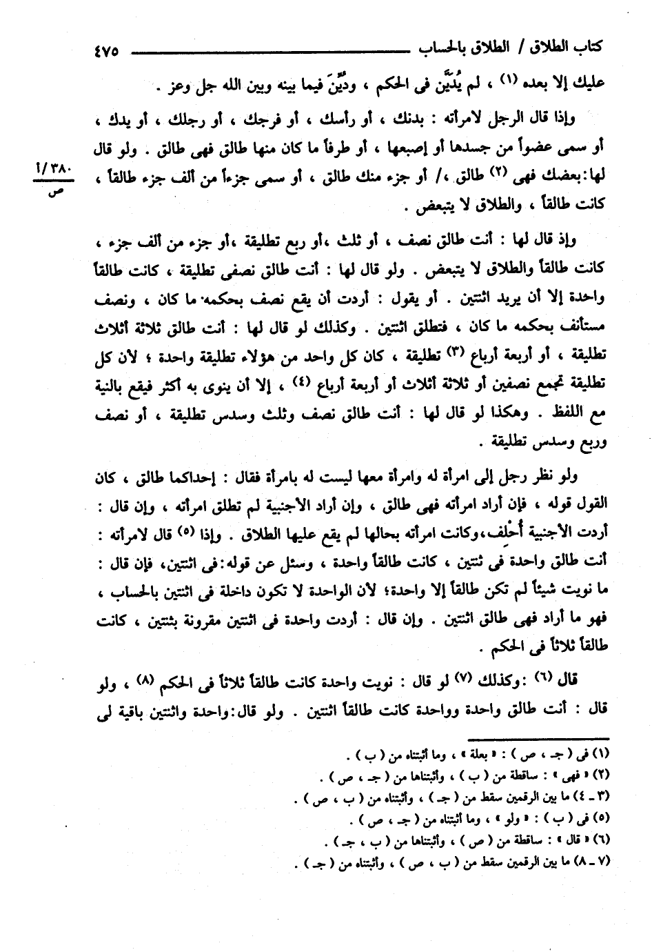 وَإِذَا قَالَ الرَّجُلُ لِامْرَأَتِهِ بَدَنُك أَوْ رَأْسُك أَوْ فَرْجُك أَوْ رِجْلُك أَوْ يَدُك أَوْ سَمَّى عُضْوًا مِنْ جَسَدِهَا أَوْ إصْبَعَهَا أَوْ طَرَفًا مَا كَانَ مِنْهَا طَالِقٌ فَهِيَ طَالِقٌ , وَلَوْ قَالَ لَهَا بَعْضُك طَالِقٌ أَوْ جُزْءٌ مِنْك طَالِقٌ أَوْ سَمَّى جُزْءًا مِنْ أَلْفِ جُزْءٍ طَالِقًا كَانَتْ طَالِقًا وَالطَّلاَقُ لاَ يَتَبَعَّضُ وَإِذَا قَالَ لَهَا أَنْتِ طَالِقٌ نِصْفَ أَوْ ثُلُثَ أَوْ رُبُعَ تَطْلِيقَةٍ أَوْ جُزْءًا مِنْ أَلْفِ جُزْءٍ كَانَتْ طَالِقًا وَالطَّلاَقُ لاَ يَتَبَعَّضُ .