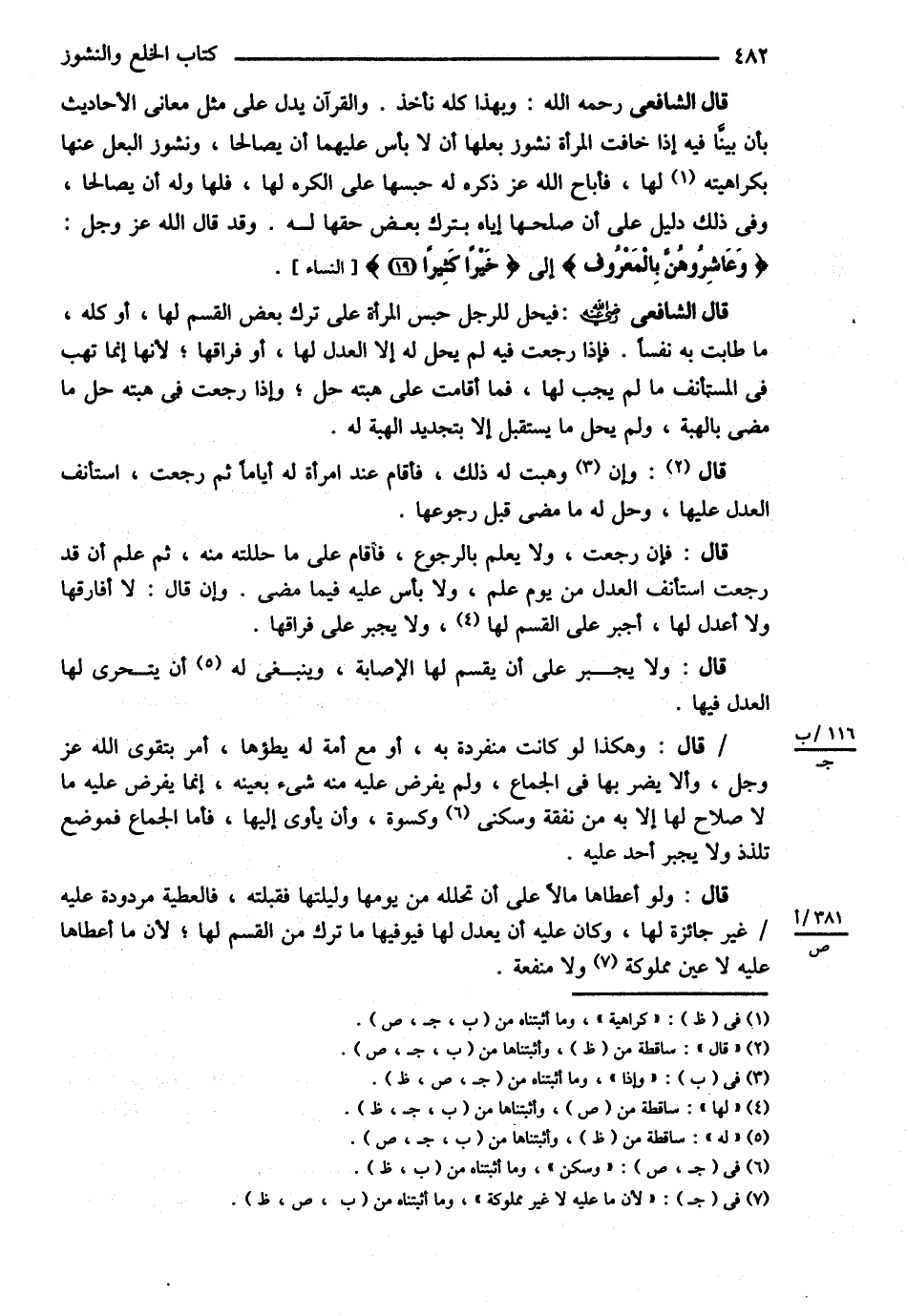 قَالَ الشَّافِعِيُّ : وَبِهَذَا كُلِّهِ نَأْخُذُ وَالْقُرْآنُ يَدُلُّ عَلَى مِثْلِ مَعَانِي الْأَحَادِيثِ بِأَنْ بَيَّنَّا فِيهِ إذَا خَافَتْ الْمَرْأَةُ نُشُوزَ بَعْلِهَا أَنْ لاَ بَأْسَ عَلَيْهِمَا أَنْ يُصَالَحَا وَنُشُوزُ الْبَعْلِ عَنْهَا بِكَرَاهِيَتِهِ لَهَا فَأَبَاحَ اللَّهُ تَعَالَى لَهُ حَبْسَهَا عَلَى الْكُرْهِ لَهَا فَلَهَا وَلَهُ أَنْ يُصَالِحَا وَفِي ذَلِكَ دَلِيلٌ عَلَى أَنَّ صُلْحَهَا إيَّاهُ بِتَرْكِ بَعْضِ حَقِّهَا لَهُ . وَقَدْ قَالَ اللَّهُ عَزَّ وَجَلَّ : ? وَعَاشِرُوهُنَّ بِالْمَعْرُوفِ } إلَى { خَيْرًا كَثِيرًا }
