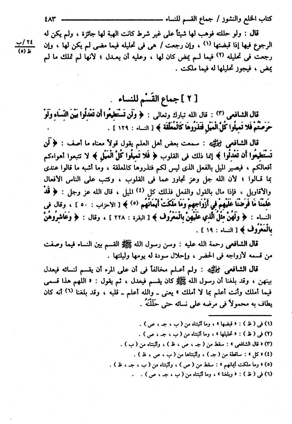 قَالَ الشَّافِعِيُّ : قَالَ اللَّهُ تَبَارَكَ وَتَعَالَى { وَلَنْ تَسْتَطِيعُوا أَنْ تَعْدِلُوا بَيْنَ النِّسَاءِ وَلَوْ حَرَصْتُمْ فَلاَ تَمِيلُوا كُلَّ الْمَيْلِ فَتَذَرُوهَا كَالْمُعَلَّقَةِ }