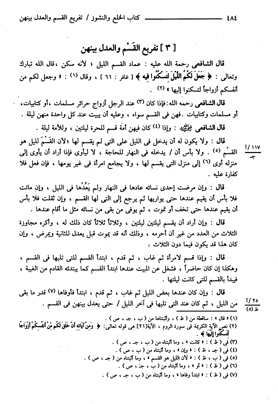 قَالَ الشَّافِعِيُّ : فَإِذَا كَانَ عِنْدَ الرَّجُلِ أَزْوَاجٌ حَرَائِرُ مُسْلِمَاتٌ أَوْ كِتَابِيَّاتٌ , أَوْ مُسْلِمَاتٌ وَكِتَابِيَّاتٌ . فَهُنَّ فِي الْقَسْمِ سَوَاءٌ وَعَلَيْهِ أَنْ يَبِيتَ عِنْدَ كُلِّ وَاحِدَةٍ مِنْهُنَّ لَيْلَةً