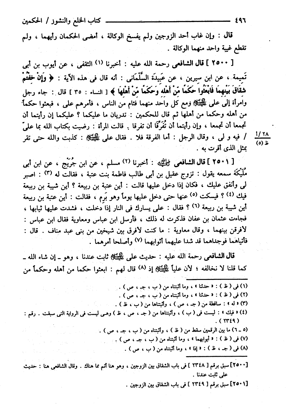 قَالَ الشَّافِعِيُّ: أَخْبَرَنَا الثَّقَفِيُّ عَنْ أَيُّوبَ بْنِ أَبِي تَمِيمَةَ عَنْ ابْنِ سِيرِينَ عَنْ عُبَيْدَة السَّلْمَانِيِّ أَنَّهُ قَالَ فِي هَذِهِ الآيَةِ {وَإِنْ خِفْتُمْ شِقَاقَ بَيْنِهِمَا فَابْعَثُوا حَكَمًا مِنْ أَهْلِهِ وَحَكَمًا مِنْ أَهْلِهَا} قَالَ جَاءَ رَجُلٌ وَامْرَأَةٌ إلَى عَلِيٍّ رضي الله عنه وَمَعَ كُلِّ وَاحِدٍ مِنْهُمَا فِئَامٌ مِنْ النَّاسِ فَأَمَرَهُمْ عَلِيٌّ فَبَعَثُوا حَكَمًا مِنْ أَهْلِهِ وَحَكَمًا مِنْ أَهْلِهَا ثُمَّ قَالَ لِلْحَكَمَيْنِ: تَدْرِيَانِ مَا عَلَيْكُمَا , عَلَيْكُمَا إنْ رَأَيْتُمَا أَنْ تَجْمَعَا أَنْ تَجْمَعَا وَإِنْ رَأَيْتُمَا أَنْ تُفَرِّقَا أَنْ تُفَرِّقَا قَالَتْ الْمَرْأَةُ رَضِيت بِكِتَابِ اللَّهِ بِمَا عَلَيَّ فِيهِ وَلِيَ , وَقَالَ الرَّجُلُ أَمَّا الْفُرْقَةُ فَلاَ. فَقَالَ عَلِيٌّ رضي الله عنه كَذَبْت وَاَللَّهِ حَتَّى تُقِرَّ بِمِثْلِ الَّذِي أَقَرَّتْ بِهِ.