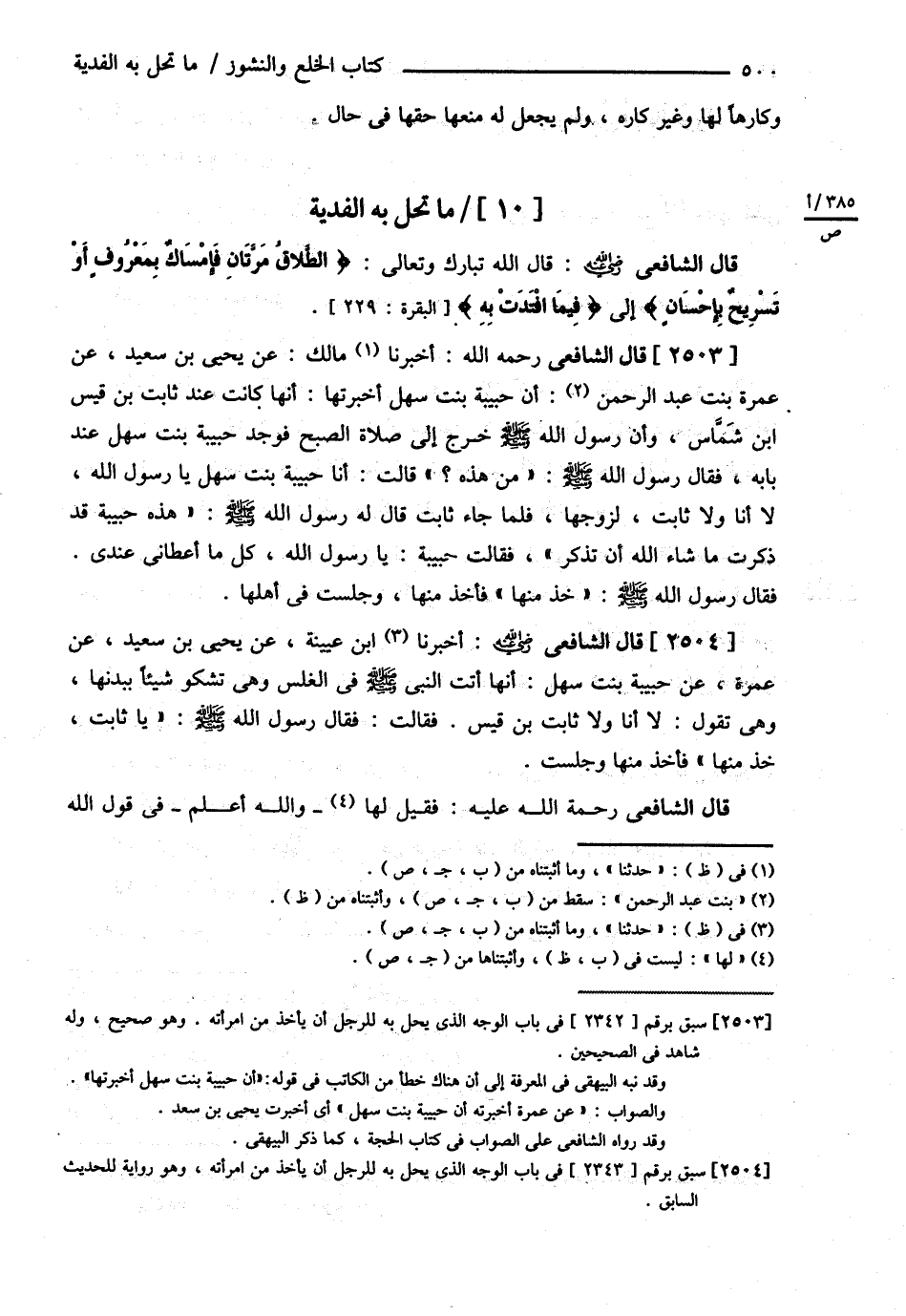 قَالَ الشَّافِعِيُّ : أَخْبَرَنَا مَالِكٌ عَنْ يَحْيَى بْنِ سَعِيدٍ { عَنْ عَمْرَةَ أَنَّ حَبِيبَةَ بِنْتَ سَهْلٍ أَخْبَرَتْهَا أَنَّهَا كَانَتْ عِنْدَ ثَابِتِ بْنِ قَيْسِ بْنِ شِمَاسٍ وَأَنَّ رَسُولَ اللَّهِ - صلى الله عليه وسلم - خَرَجَ إلَى صَلاَةِ الصُّبْحِ فَوَجَدَ حَبِيبَةَ بِنْتَ سَهْلٍ عِنْدَ بَابِهِ فَقَالَ رَسُولُ اللَّهِ - صلى الله عليه وسلم - مَنْ هَذِهِ ؟ قَالَتْ أَنَا حَبِيبَةُ بِنْتُ سَهْلٍ يَا رَسُولَ اللَّهِ لاَ أَنَا وَلاَ ثَابِتٌ لِزَوْجِهَا فَلَمَّا جَاءَ ثَابِتٌ قَالَ لَهُ رَسُولُ اللَّهِ - صلى الله عليه وسلم - هَذِهِ حَبِيبَةُ قَدْ ذَكَرَتْ مَا شَاءَ اللَّهُ أَنْ تَذْكُرَ فَقَالَتْ حَبِيبَةُ يَا رَسُولَ اللَّهِ كُلُّ مَا أَعْطَانِي عِنْدِي فَقَالَ رَسُولُ اللَّهِ - صلى الله عليه وسلم - خُذْ مِنْهَا فَأَخَذَ مِنْهَا وَجَلَسَتْ فِي أَهْلِهَا }