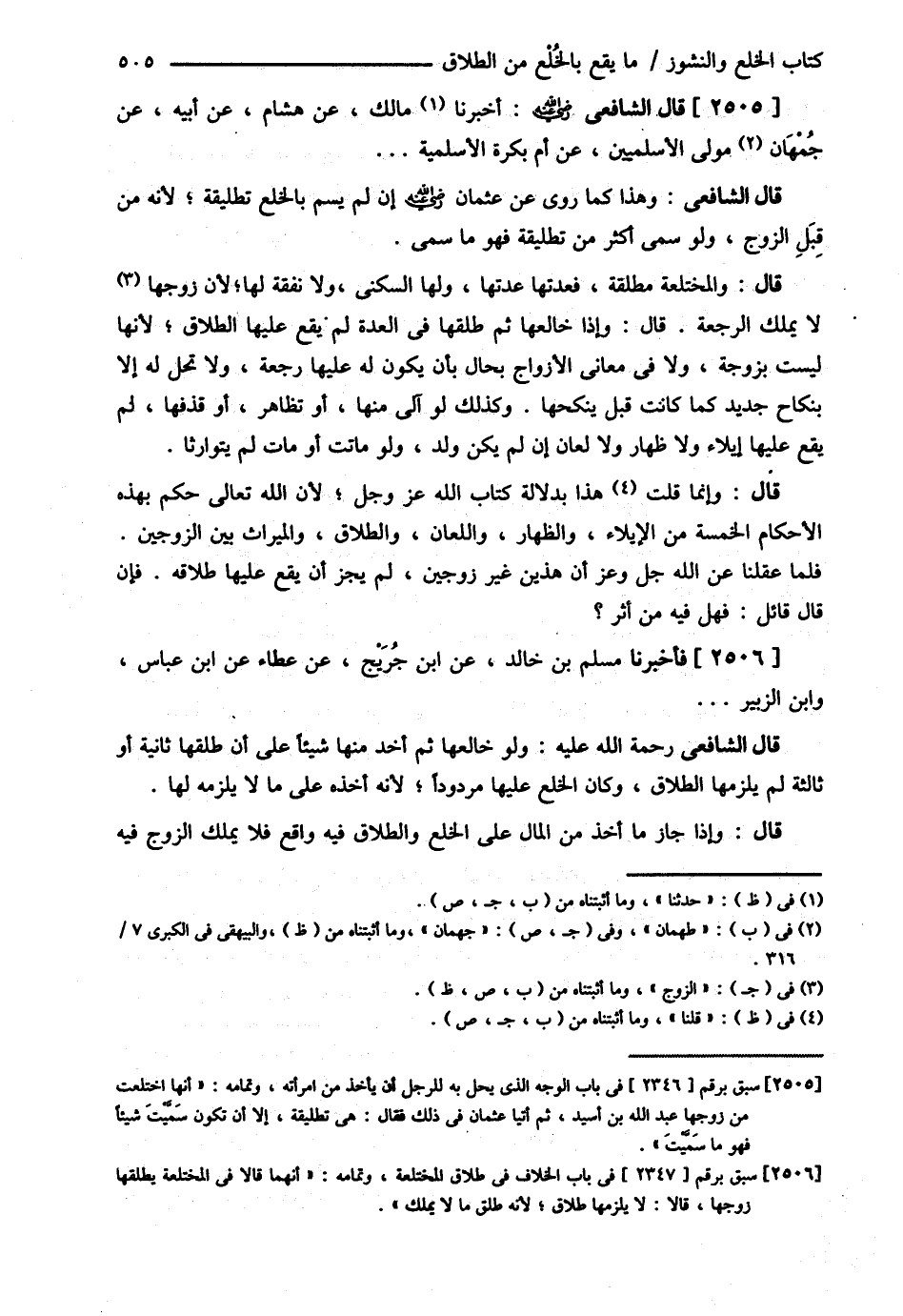 قَالَ الشَّافِعِيُّ: أَخْبَرَنَا مَالِكٌ عَنْ هِشَامٍ عَنْ أَبِيهِ عَنْ طَهْمَانَ مَوْلَى الأسلميين عَنْ أُمِّ بَكْرَةَ الْأَسْلَمِيَّةِ