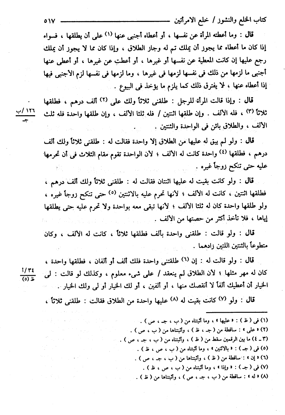 ( قَالَ ) وَلَوْ كَانَتْ بَقِيَتْ لَهُ عَلَيْهَا اثْنَتَانِ فَقَالَتْ لَهُ طَلِّقْنِي ثَلاَثًا وَلَك أَلْفُ دِرْهَمٍ فَطَلَّقَهَا اثْنَتَيْنِ كَانَتْ لَهُ الْأَلْف لِأَنَّهَا تُحَرَّمُ عَلَيْهِ بِالِاثْنَتَيْنِ حَتَّى تَنْكِحَ زَوْجًا غَيْرَهُ وَلَوْ طَلَّقَهَا وَاحِدَةً كَانَ لَهُ ثُلُثَا الْأَلْفِ لِأَنَّهَا تَبْقَى مَعَهُ بِوَاحِدَةٍ وَلاَ تُحَرَّمُ عَلَيْهِ حَتَّى يُطَلِّقَهَا إيَّاهَا فَلاَ تَأْخُذُ أَكْثَرَ مِنْ حِصَّتِهَا مِنْ الْأَلْفِ