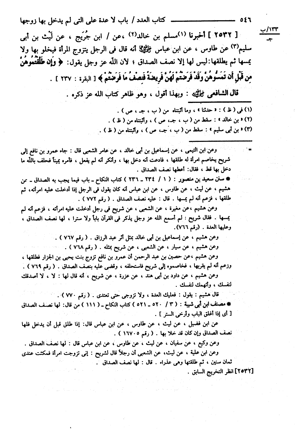أَخْبَرَنَا مُسْلِمٌ عَنْ ابْنِ جُرَيْجٍ عَنْ لَيْثٍ عَنْ طَاوُسٍ عَنْ ابْنِ عَبَّاسٍ رضي الله تعالى عنهما أَنَّهُ قَالَ فِي الرَّجُلِ يَتَزَوَّجُ الْمَرْأَةَ فَيَخْلُو بِهَا وَلاَ يَمَسُّهَا ثُمَّ يُطَلِّقُهَا لَيْسَ لَهَا إلَّا نِصْفُ الصَّدَاقِ لِأَنَّ اللَّهَ عَزَّ وَجَلَّ يَقُولُ: {وَإِنْ طَلَّقْتُمُوهُنَّ مِنْ قَبْلِ أَنْ تَمَسُّوهُنَّ وَقَدْ فَرَضْتُمْ لَهُنَّ فَرِيضَةً فَنِصْفُ مَا فَرَضْتُمْ}