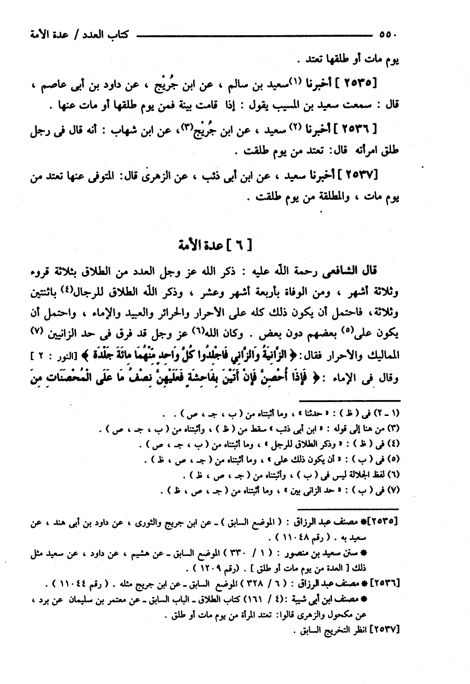 قَالَ الشَّافِعِيُّ : رحمه الله : ذَكَرَ اللَّهُ عَزَّ وَجَلَّ الْعِدَدَ مِنْ الطَّلاَقِ بِثَلاَثَةِ قُرُوءٍ وَثَلاَثَةِ أَشْهُرٍ وَمِنْ الْوَفَاةِ بِأَرْبَعَةِ أَشْهُرٍ وَعَشْرٍ وَذَكَرَ اللَّهُ الطَّلاَقَ لِلرِّجَالِ بِاثْنَتَيْنِ وَثَلاَثَةٍ فَاحْتَمَلَ أَنْ يَكُونَ ذَلِكَ كُلُّهُ عَلَى الْأَحْرَارِ وَالْحَرَائِرِ وَالْعَبِيدِ وَالْإِمَاءِ وَاحْتَمَلَ أَنْ يَكُونَ ذَلِكَ عَلَى بَعْضِهِمْ دُونَ بَعْضٍ وَكَانَ عَزَّ وَجَلَّ قَدْ فَرَّقَ فِي حَدِّ الزَّانِي بَيْنَ الْمَمَالِيكِ وَالْأَحْرَارِ فَقَالَ : { الزَّانِيَةُ وَالزَّانِي فَاجْلِدُوا كُلَّ وَاحِدٍ مِنْهُمَا مِائَةَ جَلْدَةٍ } وَقَالَ فِي الْإِمَاءِ { فَإِذَا أُحْصِنَّ فَإِنْ أَتَيْنَ بِفَاحِشَةٍ فَعَلَيْهِنَّ نِصْفُ مَا عَلَى الْمُحْصَنَاتِ مِنْ@