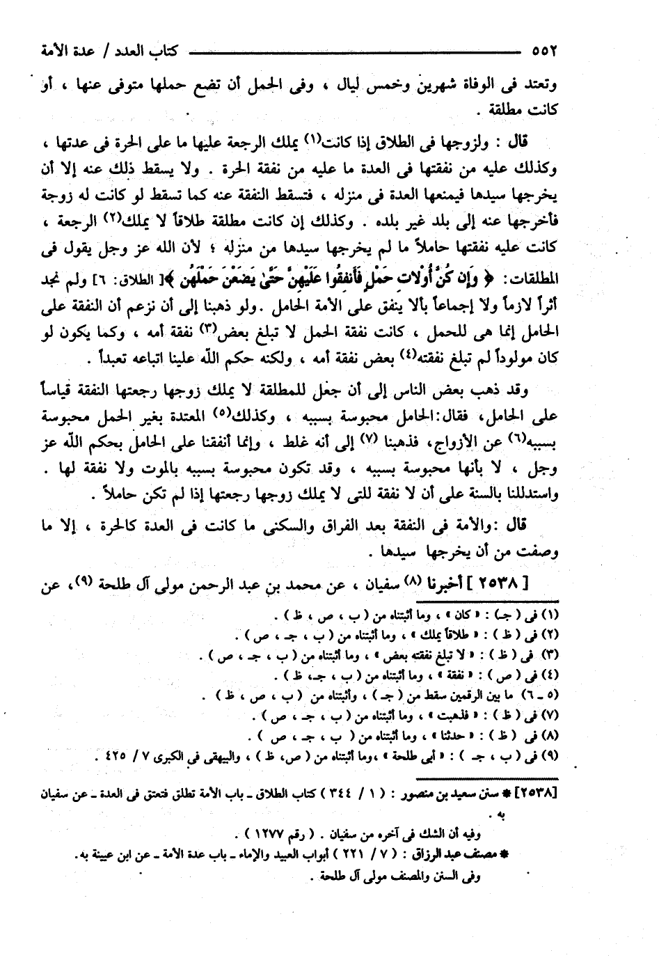 وَتَعْتَدُّ فِي الْوَفَاةِ شَهْرَيْنِ وَخَمْسَ لَيَالٍ , وَفِي الْحَمْلِ أَنْ تَضَعَ حَمْلَهَا مُتَوَفًّى عَنْهَا أَوْ كَانَتْ مُطَلَّقَةً . ( قَالَ ) وَلِزَوْجِهَا فِي الطَّلاَقِ إذَا كَانَتْ يَمْلِكُ الرَّجْعَةَ عَلَيْهَا مَا عَلَى الْحُرَّةِ فِي عِدَّتِهَا وَكَذَلِكَ عَلَيْهِ مِنْ نَفَقَتِهَا فِي الْعِدَّةِ مَا عَلَيْهِ مِنْ نَفَقَةِ الْحُرَّةِ . وَلاَ يَسْقُطُ ذَلِكَ عَنْهُ إلَّا أَنْ يُخْرِجَهَا سَيِّدُهَا فَيَمْنَعَهَا الْعِدَّةَ فِي مَنْزِلِهِ فَتَسْقُطَ النَّفَقَةُ عَنْهُ كَمَا تَسْقُطُ لَوْ كَانَتْ لَهُ زَوْجَةٌ فَأَخْرَجَهَا عَنْهُ إلَى بَلَدٍ غَيْرِ بَلَدِهِ . وَكَذَلِكَ إنْ كَانَتْ مُطَلَّقَةً طَلاَقًا لاَ يَمْلِكُ الرَّجْعَةَ كَانَتْ عَلَيْهِ نَفَقَتُهَا حَامِلاً مَا لَمْ يُخْرِجْهَا سَيِّدُهَا مِنْ مَنْزِلِهِ لِأَنَّ اللَّهَ عَزَّ وَجَلَّ يَقُولُ فِي الْمُطَلَّقَاتِ { وَإِنْ كُنَّ أُولاَتِ حَمْلٍ فَأَنْفِقُوا عَلَيْهِنَّ حَتَّى يَضَعْنَ حَمْلَهُنَّ } وَلَمْ نَجِدْ أَثَرًا لاَزِمًا وَلاَ إجْمَاعًا بِأَنْ لاَ يُنْفَقَ عَلَى الْأَمَةِ الْحَامِلِ وَلَوْ ذَهَبْنَا إلَى أَنْ نَزْعُمَ أَنَّ النَّفَقَةَ عَلَى الْحَامِلِ إنَّمَا هِيَ لِلْحَمْلِ كَانَتْ نَفَقَةُ الْحَمْلِ لاَ تَبْلُغُ بَعْضَ نَفَقَةِ أَمَةٍ وَكَمَا يَكُونُ لَوْ كَانَ مَوْلُودًا لَمْ تَبْلُغْ نَفَقَتُهُ بَعْضَ نَفَقَةِ أُمِّهِ وَلَكِنَّهُ حُكْمُ اللَّهِ تَعَالَى عَلَيْنَا اتِّبَاعُهُ تَعَبُّدًا , وَقَدْ ذَهَبَ بَعْضُ النَّاسِ إلَى أَنْ جَعَلَ لِلْمُطَلَّقَةِ لاَ يَمْلِكُ زَوْجُهَا رَجْعَتَهَا النَّفَقَةَ قِيَاسًا عَلَى الْحَامِلِ فَقَالَ الْحَامِلُ مَحْبُوسَةٌ بِسَبَبِهِ , وَكَذَلِكَ الْمُعْتَدَّةُ بِغَيْرِ الْحَمْلِ مَحْبُوسَةٌ بِسَبَبِهِ عَنْ الْأَزْوَاجِ , فَذَهَبْنَا إلَى أَنَّهُ غَلَطٌ وَإِنَّمَا أَنْفَقْنَا عَلَى الْحَامِلِ بِحُكْمِ اللَّهِ عَزَّ وَجَلَّ لاَ بِأَنَّهَا مَحْبُوسَةٌ بِسَبَبِهِ وَقَدْ تَكُونُ مَحْبُوسَةً بِسَبَبِهِ بِالْمَوْتِ وَلاَ نَفَقَةَ لَهَا , وَاسْتَدْلَلْنَا بِالسُّنَّةِ عَلَى أَنْ لاَ نَفَقَةَ لِلَّتِي لاَ يَمْلِكُ زَوْجُهَا رَجْعَتَهَا إذَا لَمْ تَكُنْ حَامِلاً . ( قَالَ ) وَالْأَمَةُ فِي النَّفَقَةِ بَعْدَ الْفِرَاقِ وَالسُّكْنَى مَا كَانَتْ فِي الْعِدَّةِ كَالْحُرَّةِ إلَّا مَا وَصَفْت مِنْ أَنْ يُخْرِجَهَا سَيِّدُهَا , أَخْبَرَنَا سُفْيَانُ عَنْ مُحَمَّدِ بْنِ عَبْدِ الرَّحْمَنِ مَوْلَى أَبِي طَلْحَةَ عَنْ @