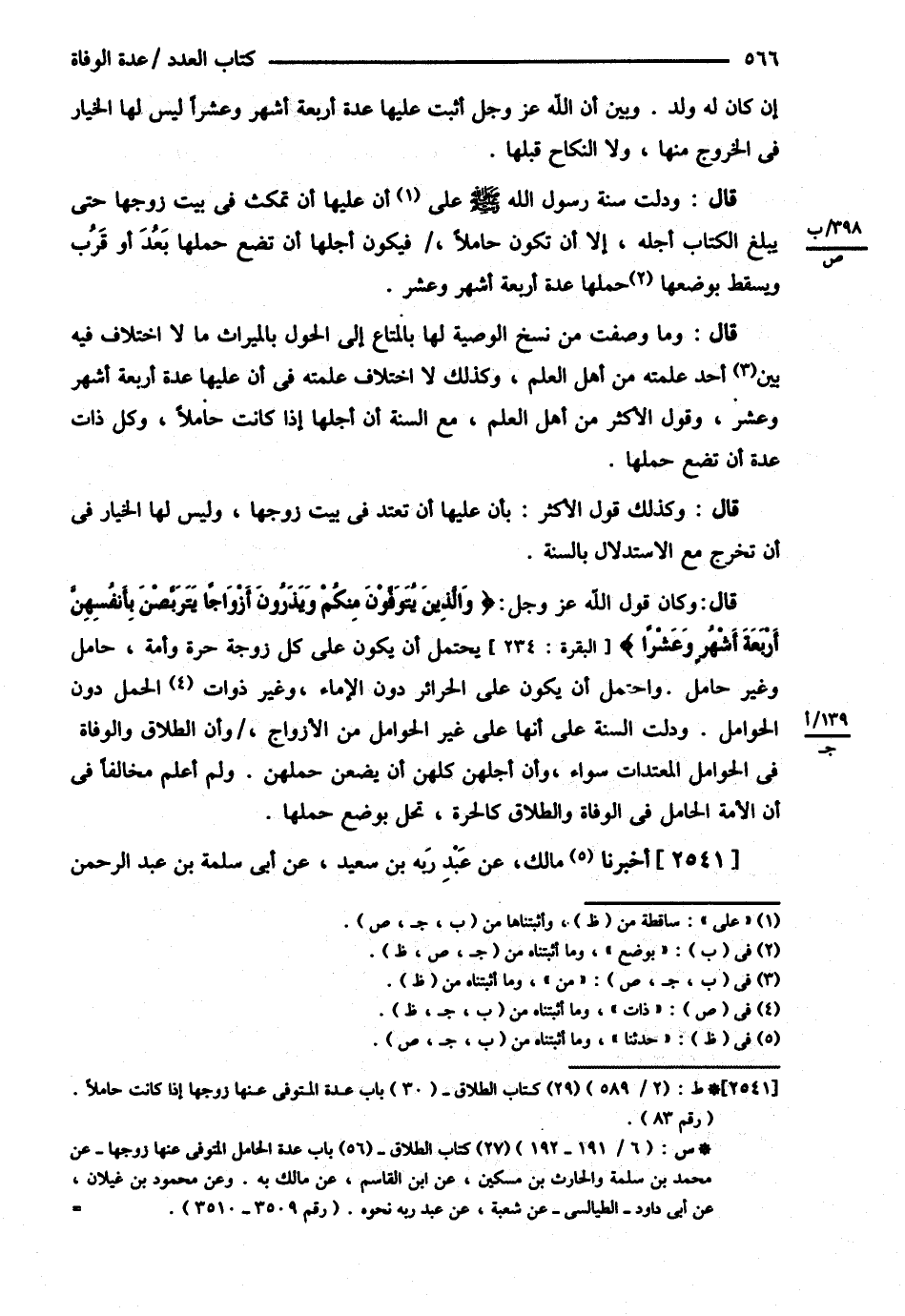 إنْ كَانَ لَهُ وَلَدٌ . وَبَيَّنَ أَنَّ اللَّهَ عَزَّ وَجَلَّ أَثْبَتَ عَلَيْهَا عِدَّةً أَرْبَعَةَ أَشْهُرٍ وَعَشْرًا لَيْسَ لَهَا الْخِيَارُ فِي الْخُرُوجِ مِنْهَا وَلاَ النِّكَاحُ قَبْلَهَا قَالَ وَدَلَّتْ سُنَّةُ رَسُولِ اللَّهِ - صلى الله عليه وسلم - عَلَى أَنَّ عَلَيْهَا أَنْ تَمْكُثَ فِي بَيْتِ زَوْجِهَا حَتَّى يَبْلُغَ الْكِتَابُ أَجَلَهُ إلَّا أَنْ تَكُونَ حَامِلاً فَيَكُونَ أَجَلُهَا أَنْ تَضَعَ حَمْلَهَا بَعُدَ أَوْ قَرُبَ , وَيَسْقُطُ بِوَضْعِ حَمْلِهَا عِدَّةُ أَرْبَعَةِ أَشْهُرٍ وَعَشْرٍ . ( قَالَ ) وَمَا وَصَفْت مِنْ نَسْخِ الْوَصِيَّةِ لَهَا بِالْمَتَاعِ إلَى الْحَوْلِ بِالْمِيرَاثِ مَا لاَ اخْتِلاَفَ فِيهِ مِنْ أَحَدٍ عَلِمْته مِنْ أَهْلِ الْعِلْمِ . وَكَذَلِكَ لاَ اخْتِلاَفَ عَلِمْته فِي أَنَّ إلَيْهَا عِدَّةَ الْأَرْبَعَةِ أَشْهُرٍ وَعَشْرٍ وَقَوْلُ الْأَكْثَرِ مِنْ أَهْلِ الْعِلْمِ مَعَ السُّنَّةِ أَنَّ أَجَلَهَا إذَا كَانَتْ حَامِلاً وَكُلِّ ذَاتِ عِدَّةٍ أَنْ تَضَعَ حَمْلَهَا . ( قَالَ ) وَكَذَلِكَ قَوْلُ الْأَكْثَرِ بِأَنَّ عَلَيْهَا أَنْ تَعْتَدَّ فِي بَيْتِ زَوْجِهَا وَلَيْسَ لَهَا الْخِيَارُ فِي أَنْ تَخْرُجَ مَعَ الِاسْتِدْلاَلِ بِالسُّنَّةِ . ( قَالَ ) وَكَانَ قَوْلُ اللَّهِ عَزَّ وَجَلَّ : ? وَاَلَّذِينَ يُتَوَفَّوْنَ مِنْكُمْ وَيَذَرُونَ أَزْوَاجًا يَتَرَبَّصْنَ بِأَنْفُسِهِنَّ أَرْبَعَةَ أَشْهُرٍ وَعَشْرًا } يَحْتَمِلُ أَنْ يَكُونَ عَلَى كُلِّ زَوْجَةٍ حُرَّةٍ وَأَمَةٍ حَامِلٍ وَغَيْرِ حَامِلٍ , وَاحْتَمَلَ أَنْ يَكُونَ عَلَى الْحَرَائِرِ دُونَ الْإِمَاءِ وَغَيْرِ ذَوَاتِ الْحَمْلِ دُونَ الْحَوَامِلِ , وَدَلَّتْ السُّنَّةُ عَلَى أَنَّهَا عَلَى غَيْرِ الْحَوَامِلِ مِنْ الْأَزْوَاجِ وَأَنَّ الطَّلاَقَ وَالْوَفَاةَ فِي الْحَوَامِلِ الْمُعْتَدَّاتِ سَوَاءٌ وَأَنَّ أَجَلَهُنَّ كُلَّهُنَّ أَنْ يَضَعْنَ حَمْلَهُنَّ . وَلَمْ أَعْلَمْ مُخَالِفًا فِي أَنَّ الْأَمَةَ الْحَامِلَ فِي الْوَفَاةِ وَالطَّلاَقِ كَالْحُرَّةِ تَحِلُّ بِوَضْعِ حَمْلِهَا أَخْبَرَنَا مَالِكٌ عَنْ عَبْدِ رَبِّهِ بْنِ سَعِيدٍ عَنْ أَبِي سَلَمَةَ بْنِ عَبْدِ الرَّحْمَنِ @