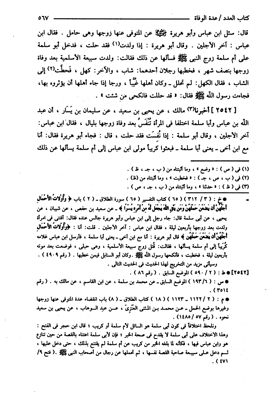 قَالَ سُئِلَ ابْنُ عَبَّاسٍ وَأَبُو هُرَيْرَةَ رضي الله تعالى عنهما عَنْ الْمُتَوَفَّى عَنْهَا زَوْجُهَا وَهِيَ حَامِلٌ ؟ فَقَالَ ابْنُ عَبَّاسٍ آخِرُ الْأَجَلَيْنِ . وَقَالَ أَبُو هُرَيْرَةَ إذَا وَلَدَتْ فَقَدْ حَلَّتْ فَدَخَلَ أَبُو سَلَمَةَ عَلَى أُمِّ سَلَمَةَ زَوْجِ النَّبِيِّ - صلى الله عليه وسلم - فَسَأَلَهَا عَنْ ذَلِكَ فَقَالَتْ : { وَلَدَتْ سُبَيْعَةُ الْأَسْلَمِيَّةُ بَعْدَ وَفَاةِ زَوْجِهَا بِنِصْفِ شَهْرٍ فَخَطَبَهَا رَجُلاَنِ أَحَدُهُمَا شَابٌّ وَالْآخَرُ كَهْلٌ فَخُطِبَتْ إلَى الشَّابِّ فَقَالَ الْكَهْلُ لَمْ تَحْلِلْ وَكَانَ أَهْلُهَا غُيَّبًا وَرَجَا إذَا جَاءَ أَهْلُهَا أَنْ يُؤْثِرُوهُ بِهَا فَجَاءَتْ رَسُولَ اللَّهِ - صلى الله عليه وسلم - فَقَالَ قَدْ حَلَلْت فَانْكِحِي مَنْ شِئْت } أَخْبَرَنَا مَالِكٌ عَنْ يَحْيَى بْنِ سَعِيدٍ عَنْ سُلَيْمَانَ بْنِ يَسَارٍ أَنَّ عَبْدَ اللَّهِ بْنَ عَبَّاسٍ وَأَبَا سَلَمَةَ اخْتَلَفَا فِي الْمَرْأَةِ تَنْفَسُ بَعْدَ وَفَاةِ زَوْجِهَا بِلَيَالٍ فَقَالَ ابْنُ عَبَّاسٍ آخِرُ الْأَجَلَيْنِ وَقَالَ أَبُو سَلَمَةَ إذَا نَفِسَتْ فَقَدْ حَلَّتْ قَالَ فَجَاءَ أَبُو هُرَيْرَةَ فَقَالَ أَنَا مَعَ ابْن أَخِي يَعْنِي أَبَا سَلَمَةَ فَبَعَثُوا كُرَيْبًا مَوْلَى ابْنِ عَبَّاسٍ إلَى أُمِّ سَلَمَةَ يَسْأَلُهَا عَنْ ذَلِكَ@