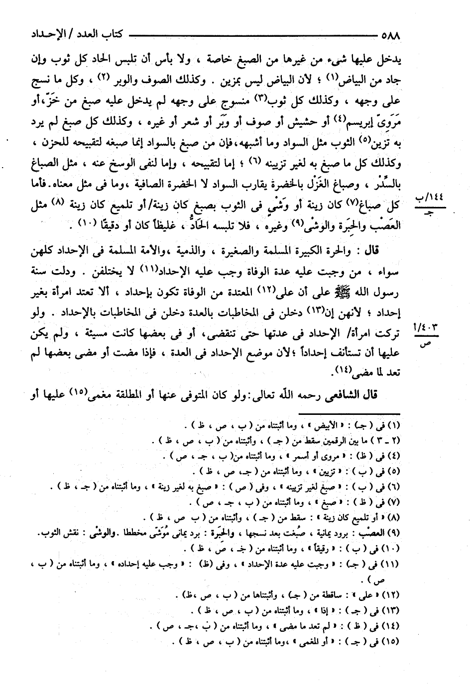يُدْخَلَ عَلَيْهَا شَيْءٌ مِنْ غَيْرِهَا مِنْ الصِّبْغِ خَاصَّةً وَلاَ بَأْسَ أَنْ تَلْبَسَ الْحَادُّ كُلَّ ثَوْبٍ وَإِنْ جَادَ مِنْ الْبَيَاضِ لِأَنَّ الْبَيَاضَ لَيْسَ بِمُزَيِّنٍ , وَكَذَلِكَ الصُّوفُ وَالْوَبَرُ وَكُلُّ مَا نُسِجَ عَلَى وَجْهِهِ وَكَذَلِكَ كُلُّ ثَوْبٍ مَنْسُوجٍ عَلَى وَجْهِهِ لَمْ يَدْخُلْ عَلَيْهِ صِبْغٌ مِنْ خَزٍّ أَوْ مَرْوِيِّ إبْرَيْسَمٍ أَوْ حَشِيشٍ أَوْ صُوفٍ أَوْ وَبَرٍ أَوْ شَعْرٍ أَوْ غَيْرِهِ , وَكَذَلِكَ كُلُّ صِبْغٍ لَمْ يُرَدْ بِهِ تَزْيِينُ الثَّوْبِ مِثْلُ السَّوَادِ وَمَا أَشْبَهَهُ فَإِنَّ مَنْ صَبَغَ بِالسَّوَادِ إنَّمَا صَبَغَهُ لِتَقْبِيحِهِ لِلْحُزْنِ وَكَذَلِكَ كُلُّ مَا صُبِغَ لِغَيْرِ تَزْيِينِهِ إمَّا لِتَقْبِيحِهِ وَإِمَّا لِنَفْيِ الْوَسَخِ عَنْهُ مِثْلُ الصِّبَاغِ بِالسِّدْرِ وَصِبَاغِ الْغَزْلِ بِالْخُضْرَةِ تُقَارِبُ السَّوَادَ لاَ الْخُضْرَةِ الصَّافِيَةِ وَمَا فِي مِثْلِ مَعْنَاهُ فَأَمَّا كُلُّ صِبَاغٍ كَانَ زِينَةً أَوْ وَشْيٍ فِي الثَّوْبِ بِصِبْغٍ كَانَ زِينَةً أَوْ تَلْمِيعٍ كَانَ زِينَةً مِثْلَ الْعَصْبِ وَالْحِبَرَةِ وَالْوَشْيِ وَغَيْرِهِ فَلاَ تَلْبَسُهُ الْحَادَّ غَلِيظًا كَانَ أَوْ رَقِيقًا . ( قَالَ ) وَالْحُرَّةُ الْكَبِيرَةُ الْمُسْلِمَةُ وَالصَّغِيرَةُ وَالذِّمِّيَّةُ وَالْأَمَةُ الْمُسْلِمَةُ فِي الْإِحْدَادِ كُلُّهُنَّ سَوَاءٌ مَنْ وَجَبَتْ عَلَيْهِ عِدَّةُ الْوَفَاةِ وَجَبَ عَلَيْهِ الْإِحْدَادُ لاَ يَخْتَلِفْنَ . وَدَلَّتْ سُنَّةُ رَسُولِ اللَّهِ - صلى الله عليه وسلم - عَلَى أَنَّ عَلَى الْمُعْتَدَّةِ مِنْ الْوَفَاةِ تَكُونُ بِإِحْدَادٍ أَنْ لاَ تَعْتَدَّ امْرَأَةٌ بِغَيْرِ إحْدَادٍ لِأَنَّهُنَّ إنْ دَخَلْنَ فِي الْمُخَاطَبَاتِ بِالْعِدَّةِ دَخَلْنَ فِي الْمُخَاطَبَاتِ بِالْإِحْدَادِ وَلَوْ تَرَكَتْ امْرَأَةٌ الْإِحْدَادَ فِي عِدَّتِهَا حَتَّى تَنْقَضِيَ أَوْ فِي بَعْضِهَا كَانَتْ مُسِيئَةً وَلَمْ يَكُنْ عَلَيْهَا أَنْ تَسْتَأْنِفَ إحْدَادًا لِأَنَّ مَوْضِعَ الْإِحْدَادِ فِي الْعِدَّةِ فَإِذَا مَضَتْ أَوْ مَضَى بَعْضُهَا لَمْ تَعُدْ لِمَا مَضَى .