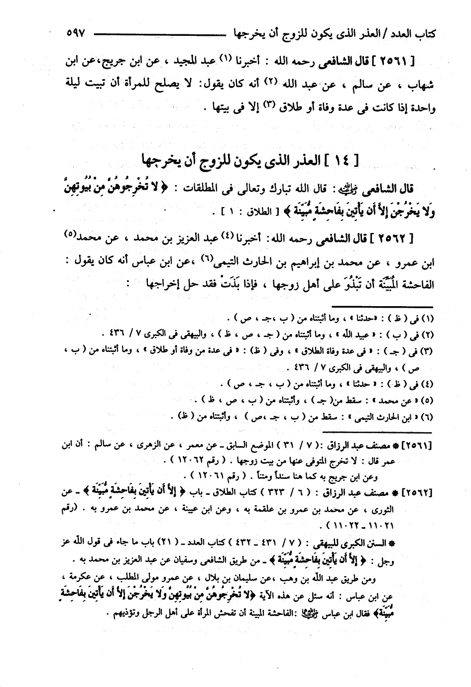 قَالَ الشَّافِعِيُّ : أَخْبَرَنَا عَبْدُ الْعَزِيزِ بْنُ مُحَمَّدٍ عَنْ مُحَمَّدِ بْنِ عَمْرٍو عَنْ مُحَمَّدِ بْنِ إبْرَاهِيمَ عَنْ ابْنِ عَبَّاسٍ أَنَّهُ كَانَ يَقُولُ : الْفَاحِشَةُ الْمُبَيِّنَةُ أَنْ تَبْذُوَ عَلَى أَهْلِ زَوْجِهَا فَإِذَا بَذَتْ فَقَدْ حَلَّ إخْرَاجُهَا :@