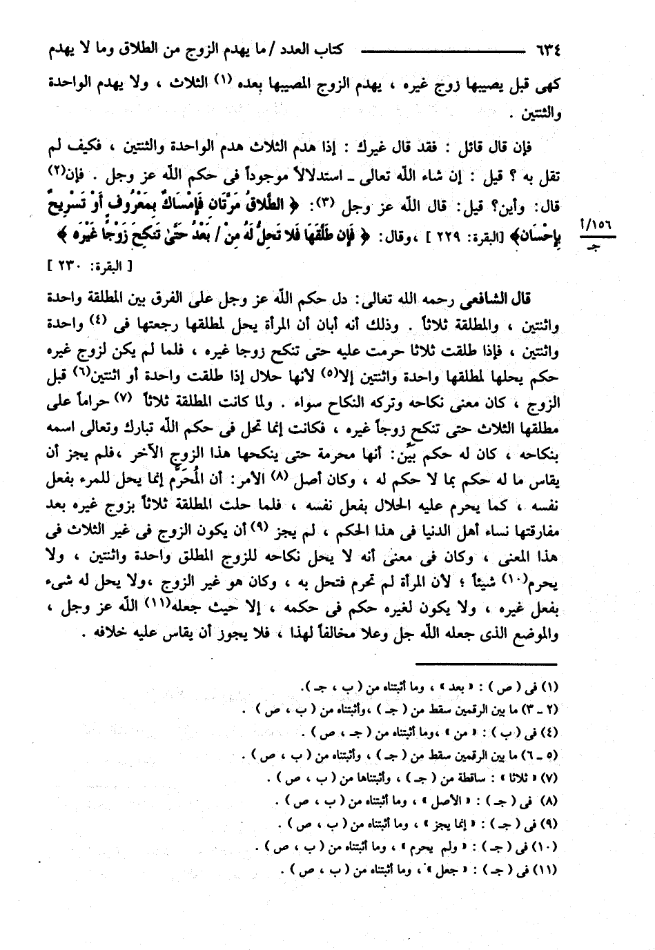 كَهِيَ قَبْلَ أَنْ يُصِيبَهَا زَوْجٌ غَيْرُهُ يَهْدِمُ الزَّوْجُ المصيبها بَعْدَهُ الثَّلاَثَ وَلاَ يَهْدِمُ الْوَاحِدَةَ وَالثِّنْتَيْنِ , فَإِنْ قَالَ قَائِلٌ فَقَدْ قَالَ غَيْرُك إذَا هَدَمَ الثَّلاَثَ هَدَمَ الْوَاحِدَةَ وَالثِّنْتَيْنِ فَكَيْفَ لَمْ تَقُلْ بِهِ ؟ قِيلَ إنْ شَاءَ اللَّهُ تَعَالَى اسْتِدْلاَلاً مَوْجُودًا فِي حُكْمِ اللَّهِ عَزَّ وَجَلَّ فَإِنْ قَالَ وَأَيْنَ ؟ قِيلَ قَالَ اللَّهُ عَزَّ وَجَلَّ : ? الطَّلاَقُ مَرَّتَانِ فَإِمْسَاكٌ بِمَعْرُوفٍ أَوْ تَسْرِيحٌ بِإِحْسَانٍ } وَقَالَ : { فَإِنْ طَلَّقَهَا فَلاَ تَحِلُّ لَهُ مِنْ بَعْدُ حَتَّى تَنْكِحَ زَوْجًا غَيْرَهُ } .