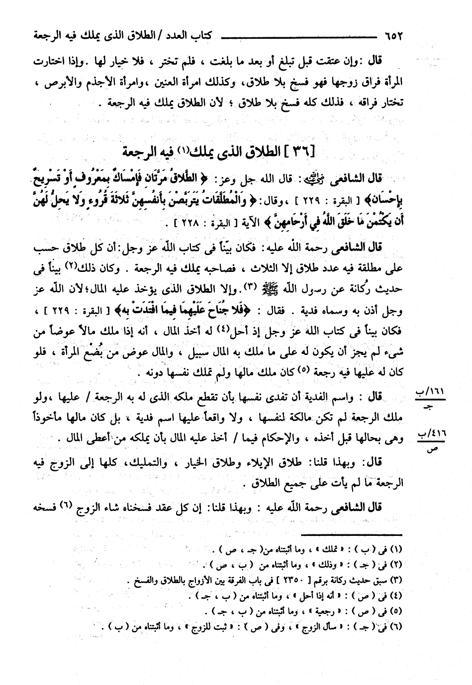 قَالَ الشَّافِعِيُّ: فَكَانَ بَيِّنًا فِي كِتَابِ اللَّهِ تَعَالَى أَنَّ كُلَّ طَلاَقٍ حُسِبَ عَلَى مُطَلَّقَةٍ فِيهِ عَدَدُ طَلاَقٍ إلَّا الثَّلاَثَ فَصَاحِبُهُ يَمْلِكُ فِيهِ الرَّجْعَةَ. وَكَانَ ذَلِكَ بَيِّنًا فِي حَدِيثِ رُكَانَةَ عَنْ رَسُولِ اللَّهِ - صلى الله عليه وسلم -. وَإِلَّا الطَّلاَقَ الَّذِي يُؤْخَذُ عَلَيْهِ الْمَالُ , لِأَنَّ اللَّهَ تَعَالَى أَذِنَ بِهِ وَسَمَّاهُ فِدْيَةً فَقَالَ {فَلاَ جُنَاحَ عَلَيْهِمَا فِيمَا افْتَدَتْ بِهِ} فَكَانَ بَيِّنًا فِي كِتَابِ اللَّهِ تَعَالَى إذْ أَحَلَّ لَهُ أَخْذُ الْمَالِ أَنَّهُ إذَا مَلَكَ مَالاً عِوَضًا مِنْ شَيْءٍ لَمْ يَجُزْ أَنْ يَكُونَ لَهُ عَلَى مَا مَلَكَ بِهِ الْمَالَ سَبِيلٌ وَالْمَالُ هُوَ عِوَضٌ مِنْ بُضْعِ الْمَرْأَةِ فَلَوْ كَانَ لَهُ عَلَيْهَا فِيهِ رَجْعَةٌ كَانَ مَلَكَ مَالَهَا وَلَمْ تَمْلِكْ نَفْسَهَا دُونَهُ (قَالَ) وَاسْمُ الْفِدْيَةِ أَنْ تَفْدِيَ نَفْسَهَا بِأَنْ تَقْطَعَ مِلْكَهُ الَّذِي لَهُ بِهِ الرَّجْعَةُ عَلَيْهَا وَلَوْ مَلَكَ الرَّجْعَةَ لَمْ تَكُنْ مَالِكَةً لِنَفْسِهَا وَلاَ وَاقِعًا عَلَيْهَا اسْمُ فِدْيَةٍ بَلْ كَانَ مَالُهَا مَأْخُوذًا وَهِيَ بِحَالِهَا قَبْلَ أَخْذِهِ وَالْأَحْكَامُ فِيمَا أُخِذَ عَلَيْهِ الْمَالُ بِأَنْ يَمْلِكَهُ مَنْ أَعْطَى الْمَالَ (قَالَ) وَبِهَذَا قُلْنَا طَلاَقُ الْإِيلاَءِ وَطَلاَقُ الْخِيَارِ وَالتَّمْلِيكِ كُلُّهَا إلَى الزَّوْجِ فِيهِ الرَّجْعَةُ مَا لَمْ يَأْتِ عَلَى جَمِيعِ الطَّلاَقِ