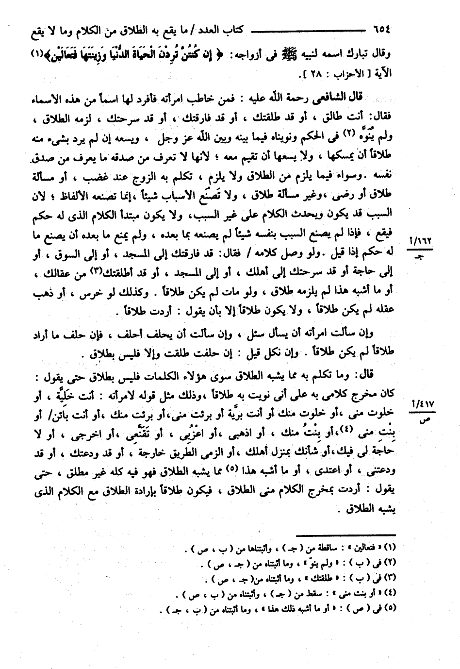 قَالَ الشَّافِعِيُّ : فَمَنْ خَاطَبَ امْرَأَتَهُ فَأَفْرَدَ لَهَا اسْمًا مِنْ هَذِهِ الْأَسْمَاءِ فَقَالَ أَنْتِ طَالِقٌ أَوْ قَدْ طَلَّقْتُك أَوْ فَارَقْتُك أَوْ قَدْ سَرَّحْتُك لَزِمَهُ الطَّلاَقُ وَلَمْ يَنْوِ فِي الْحُكْمِ وَنَوَيْنَاهُ فِيمَا بَيْنَهُ وَبَيْنَ اللَّهِ تَعَالَى , وَيَسَعُهُ إنْ لَمْ يُرِدْ بِشَيْءٍ مِنْهُ طَلاَقًا أَنْ يُمْسِكَهَا وَلاَ يَسَعُهَا أَنْ تُقِيمَ مَعَهُ لِأَنَّهَا لاَ تَعْرِفُ مِنْ صِدْقِهِ مَا يَعْرِفُ مِنْ صِدْقِ نَفْسِهِ وَسَوَاءٌ فِيمَا يَلْزَمُ مِنْ الطَّلاَقِ وَلاَ يَلْزَمُ تَكَلَّمَ بِهِ الزَّوْجُ عِنْدَ غَضَبٍ أَوْ مَسْأَلَةِ طَلاَقٍ أَوْ رِضًا وَغَيْرِ مَسْأَلَةِ طَلاَقٍ , وَلاَ تَصْنَعُ الْأَسْبَابُ شَيْئًا إنَّمَا تَصْنَعُهُ الْأَلْفَاظُ لِأَنَّ السَّبَبَ قَدْ يَكُونُ وَيَحْدُثُ الْكَلاَمُ عَلَى غَيْرِ السَّبَبِ وَلاَ يَكُونُ مُبْتَدَأَ الْكَلاَمِ الَّذِي لَهُ حُكْمٌ فَيَقَعُ فَإِذَا لَمْ يَصْنَعْ السَّبَبَ بِنَفْسِهِ شَيْئًا لَمْ يَصْنَعْهُ بِمَا بَعْدَهُ وَلَمْ يَمْنَعْ مَا بَعْدَهُ أَنْ يَصْنَعَ مَا لَهُ حُكْمٌ إذَا قِيلَ .