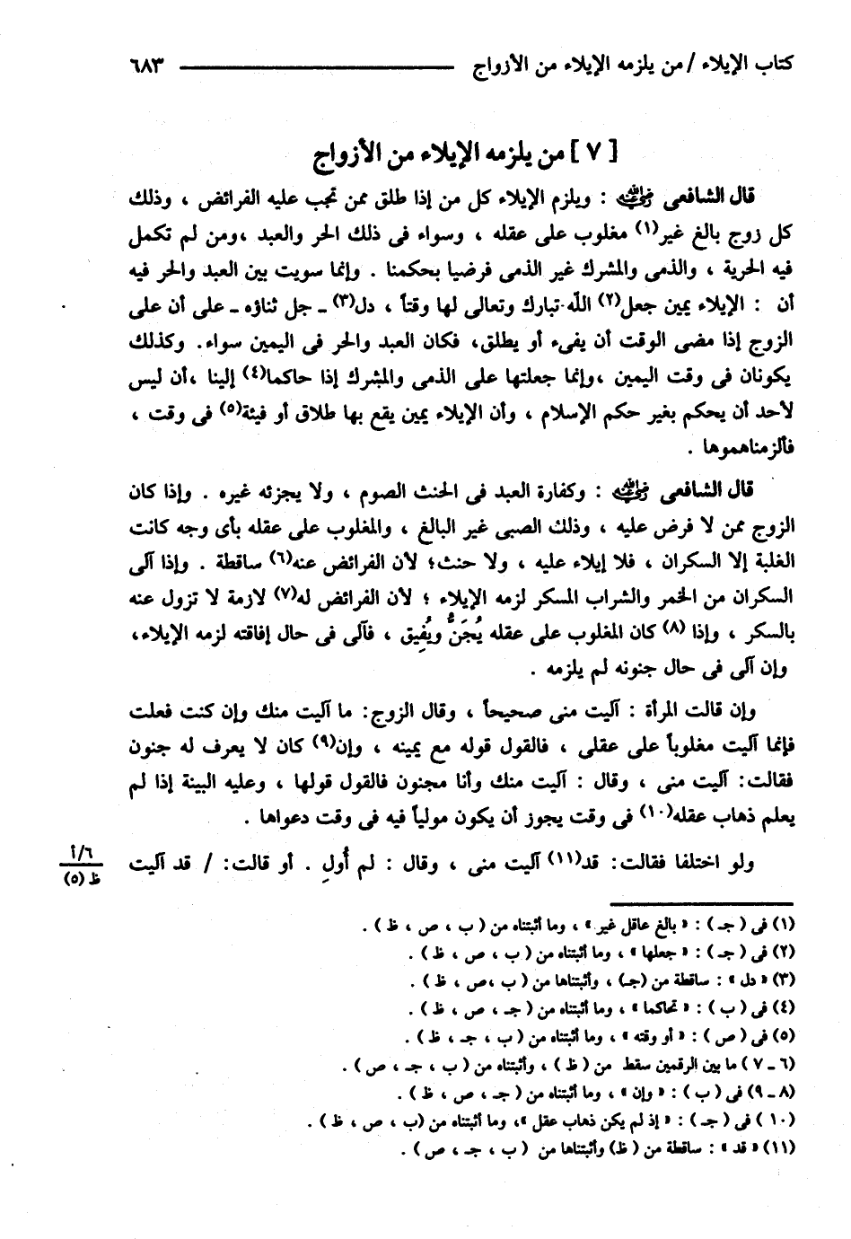 قَالَ الشَّافِعِيُّ : وَيَلْزَمُ الْإِيلاَءُ كُلَّ مَنْ إذَا طَلَّقَ لَزِمَهُ الطَّلاَقُ مِمَّنْ تَجِبُ عَلَيْهِ الْفَرَائِضُ وَذَلِكَ كُلُّ زَوْجٍ بَالِغٍ غَيْرِ مَغْلُوبٍ عَلَى عَقْلِهِ وَسَوَاءٌ فِي ذَلِكَ الْحُرُّ وَالْعَبْدُ وَمَنْ لَمْ تَكْمُلْ فِيهِ الْحُرِّيَّةُ وَالذِّمِّيُّ وَالْمُشْرِكُ غَيْرُ الذِّمِّيِّ رَضِيَا بِحُكْمِنَا . وَإِنَّمَا سَوَّيْت بَيْنَ الْعَبْدِ وَالْحُرِّ فِيهِ أَنَّ الْإِيلاَءَ يَمِينٌ جَعَلَ اللَّهُ تَبَارَكَ وَتَعَالَى لَهَا وَقْتًا دَلَّ جَلَّ ثَنَاؤُهُ عَلَى أَنَّ عَلَى الزَّوْجِ إذَا مَضَى الْوَقْتُ أَنْ يَفِيءَ أَوْ يُطَلِّقَ فَكَانَ الْعَبْدُ وَالْحُرُّ فِي الْيَمِينِ سَوَاءً . وَكَذَلِكَ يَكُونَانِ فِي وَقْتِ الْيَمِينِ وَإِنَّمَا جَعَلْتهَا عَلَى الذِّمِّيِّ وَالْمُشْرِكِ إذَا تَحَاكَمَا إلَيْنَا أَنْ لَيْسَ لِأَحَدٍ أَنْ يَحْكُمَ بِغَيْرِ حُكْمِ الْإِسْلاَمِ وَأَنَّ الْإِيلاَءَ يَمِينٌ يَقَعُ بِهَا طَلاَقٌ أَوْ فَيْئَةٌ فِي وَقْتٍ فألزمناهموها