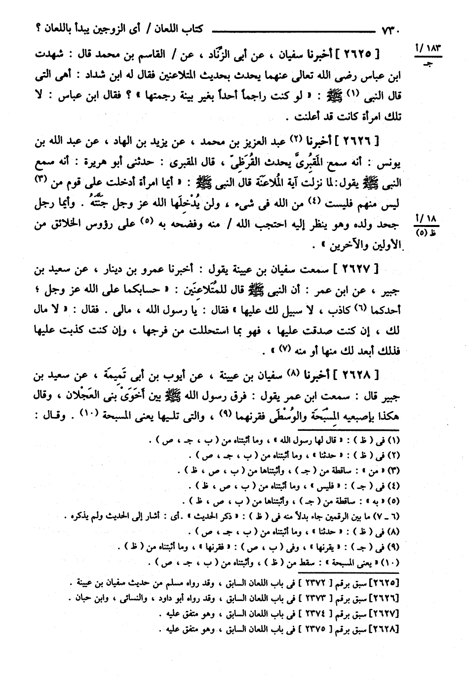 أَخْبَرَنَا سُفْيَانُ عَنْ أَبِي الزِّنَادِ عَنْ الْقَاسِمِ بْنِ مُحَمَّدٍ قَالَ شَهِدْت ابْنَ عَبَّاسٍ رضي الله تعالى عنهما يُحَدِّثُ بِحَدِيثِ الْمُتَلاَعِنَيْنِ فَقَالَ لَهُ ابْنُ شَدَّادٍ أَهِيَ الَّتِي قَالَ النَّبِيُّ - صلى الله عليه وسلم - { لَوْ كُنْت رَاجِمًا أَحَدًا بِغَيْرِ بَيِّنَةٍ رَجَمْتهَا ؟ } فَقَالَ ابْنُ عَبَّاسٍ لاَ تِلْكَ امْرَأَةٌ كَانَتْ قَدْ أَعْلَنَتْ أَخْبَرَنَا عَبْدُ الْعَزِيزِ بْنُ مُحَمَّدٍ عَنْ يَزِيدَ بْنِ الْهَادِي عَنْ عَبْدِ اللَّهِ بْنِ يُونُسَ أَنَّهُ سَمِعَ الْمَقْبُرِيَّ يُحَدِّثُ الْقُرَظِيَّ قَالَ الْمَقْبُرِيُّ حَدَّثَنِي أَبُو هُرَيْرَةَ أَنَّهُ سَمِعَ النَّبِيَّ - صلى الله عليه وسلم - يَقُولُ لَمَّا نَزَلَتْ آيَةُ الْمُلاَعَنَةِ قَالَ النَّبِيُّ - صلى الله عليه وسلم - { أَيُّمَا امْرَأَةٍ أَدْخَلَتْ عَلَى قَوْمٍ مَنْ لَيْسَ مِنْهُمْ فَلَيْسَتْ مِنْ اللَّهِ فِي شَيْءٍ وَلَنْ يُدْخِلَهَا اللَّهُ تَعَالَى جَنَّتَهُ وَأَيُّمَا رَجُلٍ جَحَدَ وَلَدَهُ وَهُوَ يَنْظُرُ إلَيْهِ احْتَجَبَ اللَّهُ تَعَالَى مِنْهُ وَفَضَحَهُ بِهِ عَلَى رُءُوسِ الْخَلاَئِقِ مِنْ الْأَوَّلِينَ وَالْآخِرِينَ } سَمِعْت سُفْيَانَ بْنَ عُيَيْنَةَ يَقُولُ أَخْبَرَنَا عَمْرُو بْنُ دِينَارٍ عَنْ سَعِيدِ بْنِ جُبَيْرٍ عَنْ ابْنِ عُمَرَ { أَنَّ النَّبِيَّ - صلى الله عليه وسلم - قَالَ لِلْمُتَلاَعِنَيْنِ حِسَابُكُمَا عَلَى اللَّهِ عَزَّ وَجَلَّ أَحَدُكُمَا كَاذِبٌ لاَ سَبِيلَ لَك عَلَيْهَا } فَقَالَ يَا رَسُولَ اللَّهِ مَا لِي . فَقَالَ { لاَ مَالَ لَك إنْ كُنْت صَدَقْت عَلَيْهَا فَهُوَ بِمَا اسْتَحْلَلْت مِنْ فَرْجِهَا وَإِنْ كُنْت كَذَبْت عَلَيْهَا فَذَلِكَ أَبْعَدُ لَك مِنْهَا أَوْ مِنْهُ } أَخْبَرَنَا سُفْيَانُ بْنُ عُيَيْنَةَ عَنْ أَيُّوبَ بْنِ أَبِي تَمِيمَةَ عَنْ سَعِيدِ بْنِ جُبَيْرٍ قَالَ سَمِعْت ابْنَ عُمَرَ يَقُولُ فَرَّقَ رَسُولُ اللَّهِ - صلى الله عليه وسلم - بَيْنَ أَخَوَيْ بَنِي الْعَجْلاَنِ وَقَالَ هَكَذَا بِإِصْبَعَيْهِ الْمُسَبِّحَةِ وَالْوُسْطَى فَقَرَنَهَا وَاَلَّتِي تَلِيهَا يَعْنِي الْمُسَبِّحَةَ وَقَالَ @