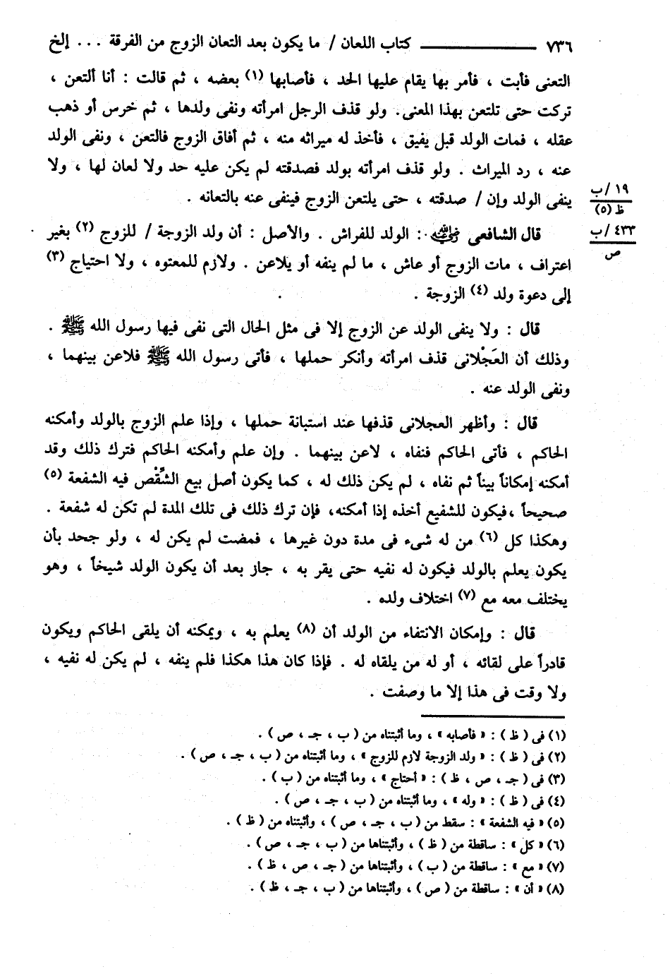 قَالَ الشَّافِعِيُّ : الْوَلَدُ لِلْفِرَاشِ وَالْأَصْلُ أَنَّ وَلَدَ الزَّوْجَةِ لِلزَّوْجِ بِغَيْرِ اعْتِرَافٍ مَاتَ الزَّوْجُ أَوْ عَاشَ مَا لَمْ يَنْفِهِ أَوْ يُلاَعِنْ وَلاَزِمٌ لِلْمَعْتُوهِ وَلاَ احْتِيَاجَ إلَى دَعْوَةِ وَلَدِ الزَّوْجَةِ , قَالَ وَلاَ يُنْفَى الْوَلَدُ عَنْ الزَّوْجِ إلَّا فِي مِثْلِ الْحَالِ الَّتِي نَفَى فِيهَا رَسُولُ اللَّهِ - صلى الله عليه وسلم - وَذَلِكَ { أَنَّ الْعَجْلاَنِيَّ قَذَفَ امْرَأَتَهُ وَأَنْكَرَ حَمْلَهَا فَأَتَى رَسُولَ اللَّهِ - صلى الله عليه وسلم - فَلاَعَنَ بَيْنَهُمَا وَنَفَى الْوَلَدَ عَنْهُ } قَالَ وَأَظْهَرَ الْعَجْلاَنِيُّ قَذْفَهَا عِنْدَ اسْتِبَانَةِ حَمْلِهَا وَإِذَا عَلِمَ الزَّوْجُ بِالْوَلَدِ وَأَمْكَنَهُ الْحَاكِمُ فَأَتَى الْحَاكِمَ فَنَفَاهُ لاَعَنَ بَيْنَهُمَا وَإِنْ عَلِمَ وَأَمْكَنَهُ الْحَاكِمُ فَتَرَكَ ذَلِكَ وَقَدْ أَمْكَنَهُ إمْكَانًا بَيِّنًا ثُمَّ نَفَاهُ لَمْ يَكُنْ ذَلِكَ لَهُ كَمَا يَكُونُ أَصْلُ بَيْعِ الشِّقْصِ صَحِيحًا فَيَكُونُ لِلشَّفِيعِ أَخْذُهُ إذَا أَمْكَنَهُ فَإِنْ تَرَكَ ذَلِكَ فِي تِلْكَ الْمُدَّةِ لَمْ تَكُنْ لَهُ شُفْعَةٌ وَهَكَذَا كُلُّ مَنْ لَهُ شَيْءٌ فِي مُدَّةٍ دُونَ غَيْرِهَا فَمَضَتْ لَمْ يَكُنْ لَهُ وَلَوْ جَحَدَ بِأَنْ يَكُونَ يَعْلَمُ بِالْوَلَدِ فَيَكُونُ لَهُ نَفْيُهُ حَتَّى يُقِرَّ بِهِ جَازَ بَعْدَ أَنْ يَكُونَ الْوَلَدُ شَيْخًا وَهُوَ يَخْتَلِفُ مَعَهُ اخْتِلاَفَ وَلَدِهِ . قَالَ وَإِمْكَانُ الِانْتِقَاءِ مِنْ الْوَلَدِ أَنْ يَعْلَمَ بِهِ وَيُمْكِنُهُ أَنْ يَلْقَى الْحَاكِمَ وَيَكُونَ قَادِرًا عَلَى لِقَائِهِ أَوْ لَهُ مَنْ يَلْقَاهُ لَهُ فَإِذَا كَانَ هَذَا هَكَذَا فَلَمْ يَنْفِهِ لَمْ يَكُنْ لَهُ نَفْيُهُ وَلاَ وَقْتَ فِي هَذَا إلَّا مَا وَصَفْت@