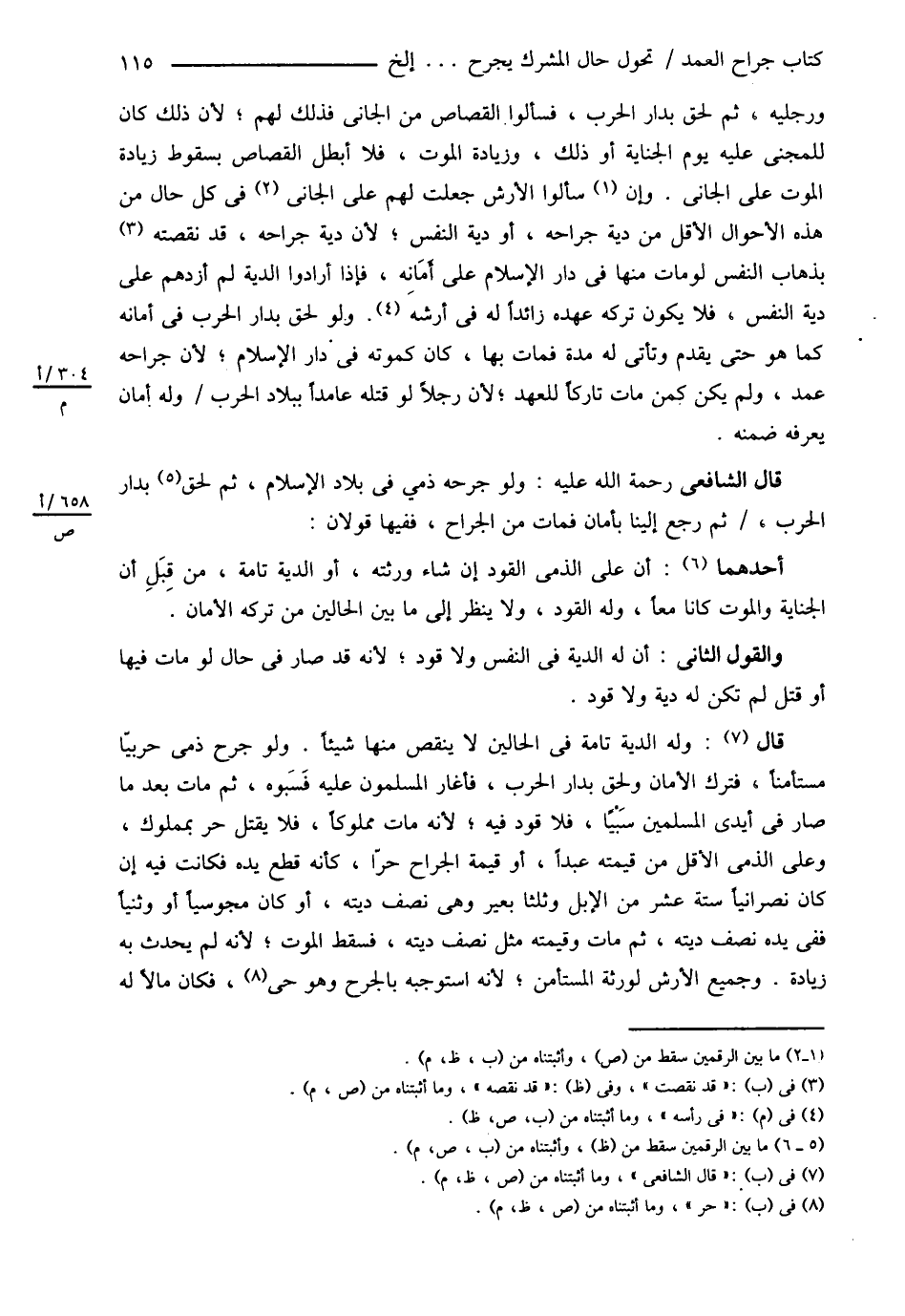 وَرِجْلَيْهِ , ثُمَّ لَحِقَ بِدَارِ الْحَرْبِ فَسَأَلُوا الْقِصَاصَ مِنْ الْجَانِي فَذَلِكَ لَهُمْ ; لِأَنَّ ذَلِكَ كَانَ لِلْمَجْنِيِّ عَلَيْهِ يَوْمَ الْجِنَايَةِ أَوْ ذَلِكَ وَزِيَادَةَ الْمَوْتِ فَلاَ أُبْطِلُ الْقِصَاصَ بِسُقُوطِ زِيَادَةِ الْمَوْتِ عَلَى الْجَانِي , وَإِنْ سَأَلُوا الْأَرْشَ جَعَلْت لَهُمْ عَلَى الْجَانِي فِي كُلِّ حَالٍ مِنْ هَذِهِ الْأَحْوَالِ الْأَقَلَّ مِنْ دِيَةِ جِرَاحِهِ أَوْ دِيَةِ النَّفْسِ ; لِأَنَّ دِيَةَ جِرَاحِهِ قَدْ نَقَصَتْ بِذَهَابِ النَّفْسِ لَوْ مَاتَ مِنْهَا فِي دَارِ الْإِسْلاَمِ عَلَى أَمَانِهِ فَإِذَا أَرَادُوا الدِّيَةَ لَمْ أَزِدْهُمْ عَلَى دِيَةِ النَّفْسِ فَلاَ يَكُونُ تَرْكُهُ عَهْدَهُ زَائِدًا لَهُ فِي أَرْشِهِ , وَلَوْ لَحِقَ بِدَارِ الْحَرْبِ فِي أَمَانِهِ كَمَا هُوَ حَتَّى يَقْدُمَ وَتَأْتِيَ لَهُ مُدَّةٌ فَمَاتَ بِهَا كَانَ كَمَوْتِهِ فِي دَارِ الْإِسْلاَمِ ; لِأَنَّ جِرَاحَهُ عَمْدٌ وَلَمْ يَكُنْ كَمَنْ مَاتَ تَارِكًا لِلْعَهْدِ ; لِأَنَّ رَجُلاً لَوْ قَتَلَهُ عَامِدًا بِبِلاَدِ الْحَرْبِ وَلَهُ أَمَانٌ يَعْرِفُهُ ضَمِنَهُ .