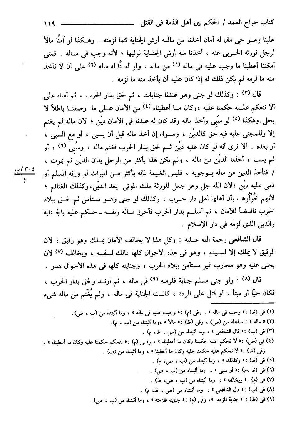 قَالَ الشَّافِعِيُّ : : وَكَذَلِكَ لَوْ جَنَى وَهُوَ عِنْدَنَا جِنَايَاتٍ , ثُمَّ لَحِقَ بِدَارِ الْحَرْبِ , ثُمَّ أَمَّنَّاهُ عَلَى أَنْ لاَ نَحْكُمَ عَلَيْهِ حَكَمْنَا عَلَيْهِ وَكَانَ مَا أَعْطَيْنَاهُ مِنْ الْأَمَانِ عَلَى مَا وَصَفْنَا بَاطِلاً لاَ يَحِلُّ وَهَكَذَا لَوْ سُبِيَ وَأُخِذَ مَالُهُ وَقَدْ كَانَ لَهُ عِنْدَنَا فِي الْأَمَانِ دَيْنٌ ; لِأَنَّ مَالَهُ لَمْ يُغْنَمْ إلَّا وَلِلْمَجْنِيِّ عَلَيْهِ فِيهِ حَقٌّ كَالدَّيْنِ وَسَوَاءٌ إنْ أُخِذَ مَالُهُ قَبْلَ أَنْ يُسْبَى أَوْ مَعَ السَّبْيِ أَوْ بَعْدَهُ , أَلاَ تَرَى أَنَّهُ لَوْ كَانَ عَلَيْهِ دَيْنٌ , ثُمَّ لَحِقَ بِدَارِ الْحَرْبِ فَغُنِمَ مَالُهُ وَسُبِيَ أَوْ لَمْ يُسْبَ أَخَذْنَا الدَّيْنَ مِنْ مَالِهِ وَلَمْ يَكُنْ هَذَا بِأَكْثَرَ مِنْ الرَّجُلِ يُدَانُ الدَّيْنَ , ثُمَّ يَمُوتُ فَنَأْخُذُ الدَّيْنَ مِنْ مَالِهِ بِوُجُوبِهِ فَلَيْسَ الْغَنِيمَةُ لِمَالِهِ بِأَكْثَرَ مِنْ الْمِيرَاثِ لَوْ وَرِثَهُ الْمُسْلِمُ أَوْ ذِمِّيٌّ عَلَيْهِ دَيْنٌ ; لِأَنَّ اللَّهَ عَزَّ وَجَلَّ جَعَلَ لِلْوَرَثَةِ مِلْكَ الْمَوْتَى بَعْدَ الدَّيْنِ , وَكَذَلِكَ الْغَنَائِمُ ; لِأَنَّهُمْ خَوَّلُوهَا بِأَنَّ أَهْلَهَا أَهْلُ دَارِ حَرْبٍ , وَكَذَلِكَ لَوْ جَنَى وَهُوَ مُسْتَأْمَنٌ , ثُمَّ لَحِقَ بِبِلاَدِ الْحَرْبِ نَاقِضًا لِلْأَمَانِ , ثُمَّ أَسْلَمَ بِدَارِ الْحَرْبِ فَأَحْرَزَ مَالَهُ وَنَفْسَهُ حُكِمَ عَلَيْهِ بِالْجِنَايَةِ وَالدَّيْنِ الَّذِي لَزِمَهُ فِي دَارِ الْإِسْلاَمِ .