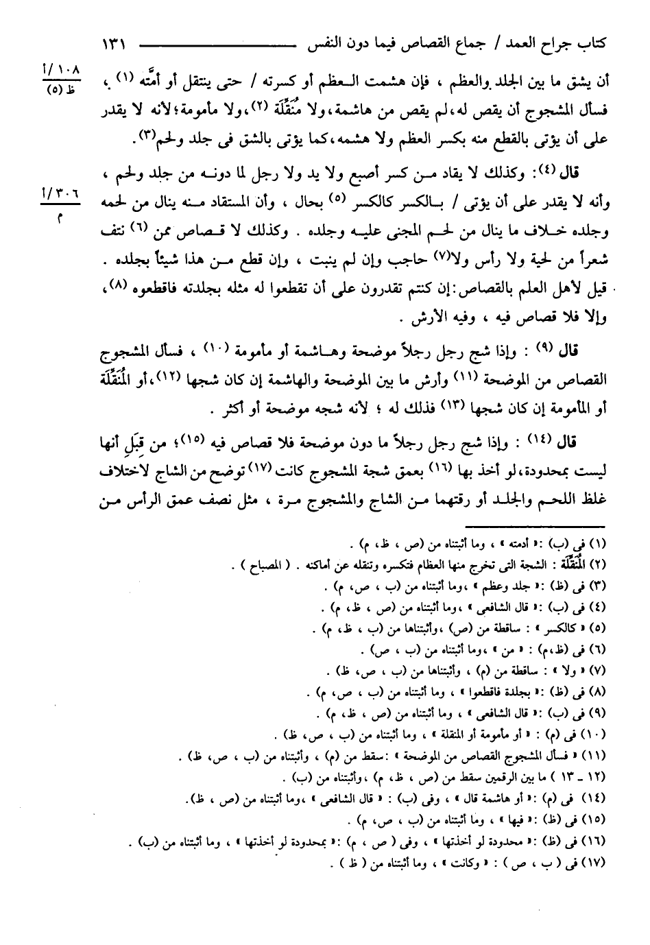 قَالَ الشَّافِعِيُّ : وَإِذَا شَجَّ رَجُلٌ رَجُلاً مَا دُونَ مُوضِحَةٍ فَلاَ قِصَاصَ فِيهِ مِنْ قِبَلِ أَنَّهَا لَيْسَتْ بِمَحْدُودَةٍ لَوْ أَخَذَ بِهَا بِعُمْقِ شَجَّةِ الْمَشْجُوجِ وَكَانَتْ تُوضِحُ مِنْ الشَّاجِّ لِاخْتِلاَفِ غِلَظِ اللَّحْمِ وَالْجِلْدِ أَوْ رِقَّتِهِمَا مِنْ الشَّاجِّ وَالْمَشْجُوجِ مَرَّةً مِثْلُ نِصْفِ عُمْقِ الرَّأْسِ مِنْ@