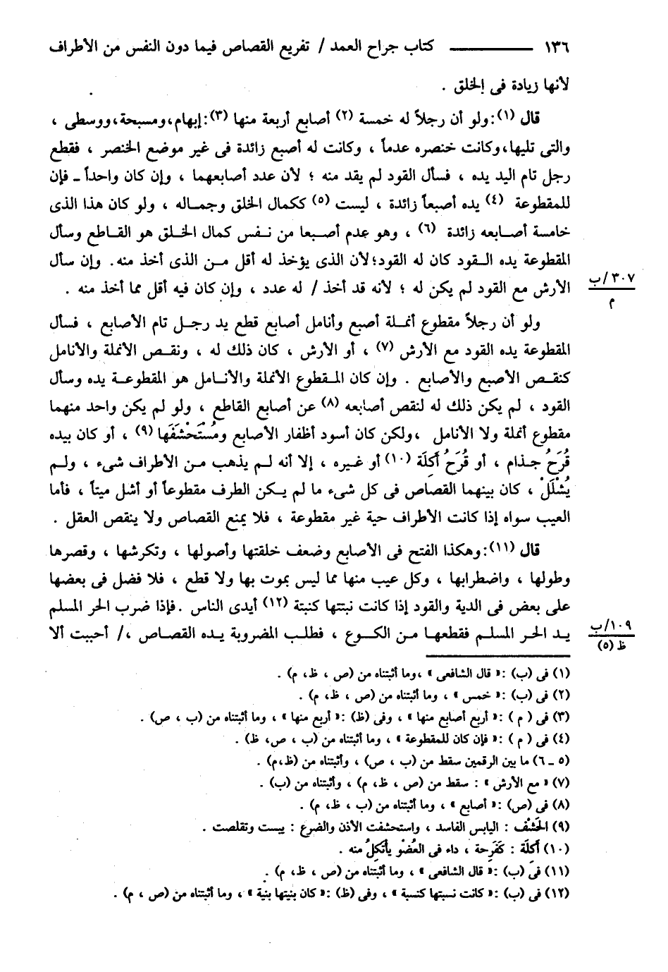 قَالَ الشَّافِعِيُّ : وَلَوْ أَنَّ رَجُلاً لَهُ خَمْسُ أَصَابِعَ أَرْبَعَةٌ مِنْهَا إبْهَامٌ وَمُسَبِّحَةٌ وَوُسْطَى وَاَلَّتِي تَلِيهَا وَكَانَتْ خِنْصَرُهُ عَدَمًا وَكَانَتْ لَهُ أُصْبُعٌ زَائِدَةٌ فِي غَيْرِ مَوْضِعِ الْخِنْصَرِ فَقَطَعَ رَجُلٌ تَامُّ الْيَدِ يَدَهُ فَسَأَلَ الْقَوَدَ لَمْ يُقَدْ مِنْهُ ; لِأَنَّ عَدَدَ أَصَابِعِهِمَا وَإِنْ كَانَ وَاحِدًا فَإِنَّ لِلْمَقْطُوعَةِ يَدُهُ أُصْبُعًا زَائِدَة وَهُوَ عَدِمَ أُصْبُعًا مِنْ نَفْسِ كَمَالِ الْخَلْقِ هُوَ الْقَاطِعُ وَسَأَلَ الْمَقْطُوعَةُ يَدُهُ الْقَوَدَ كَانَ لَهُ الْقَوَدُ ; لِأَنَّ الَّذِي يُؤْخَذُ لَهُ أَقَلُّ مِنْ الَّذِي أُخِذَ مِنْهُ وَإِنْ سَأَلَ الْأَرْشَ مَعَ الْقَوَدِ لَمْ يَكُنْ لَهُ ; لِأَنَّهُ قَدْ أُخِذَ لَهُ عَدَدٌ وَإِنْ كَانَ فِيهِ أَقَلَّ مِمَّا أُخِذَ مِنْهُ