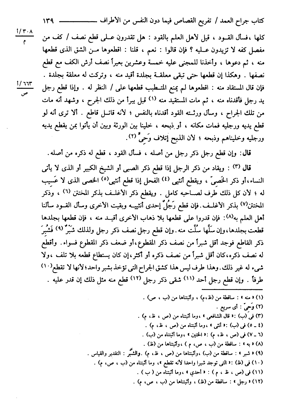 وَإِنْ قَطَعَ رَجُلٌ نِصْفَ ذَكَرِ رَجُلٍ وَلِذَلِكَ فَشُبِرَ ذَكَرُ الْقَاطِعِ فَوُجِدَ أَقَلَّ شِبْرًا مِنْ نِصْفِ ذَكَرِ الْمَقْطُوعِ أَوْ ضِعْفَ ذَكَرِ الْمَقْطُوعِ فَسَوَاءٌ وَأَقْطَعُ لَهُ نِصْفَ ذَكَرِهِ كَانَ أَقَلَّ شِبْرًا مِنْ نِصْفِ ذَكَرِهِ أَوْ أَكْثَرَ إنْ كَانَ يُسْتَطَاعُ قَطْعُهُ بِلاَ تَلَفٍ وَلاَ شَيْءَ لَهُ غَيْرُ ذَلِكَ وَهَذَا طَرَفٌ لَيْسَ هَذَا كَشَقِّ الْجِرَاحِ الَّتِي تُؤْخَذُ بِشِبْرٍ وَاحِدٍ ; لِأَنَّهَا لاَ تَقْطَعُ طَرَفًا وَإِنْ قَطَعَ رَجُلٌ أَحَدَ شِقَّيْ ذَكَرِ رَجُلٍ قُطِعَ مِنْهُ مِثْلُ ذَلِكَ إنْ قُدِرَ عَلَيْهِ .@