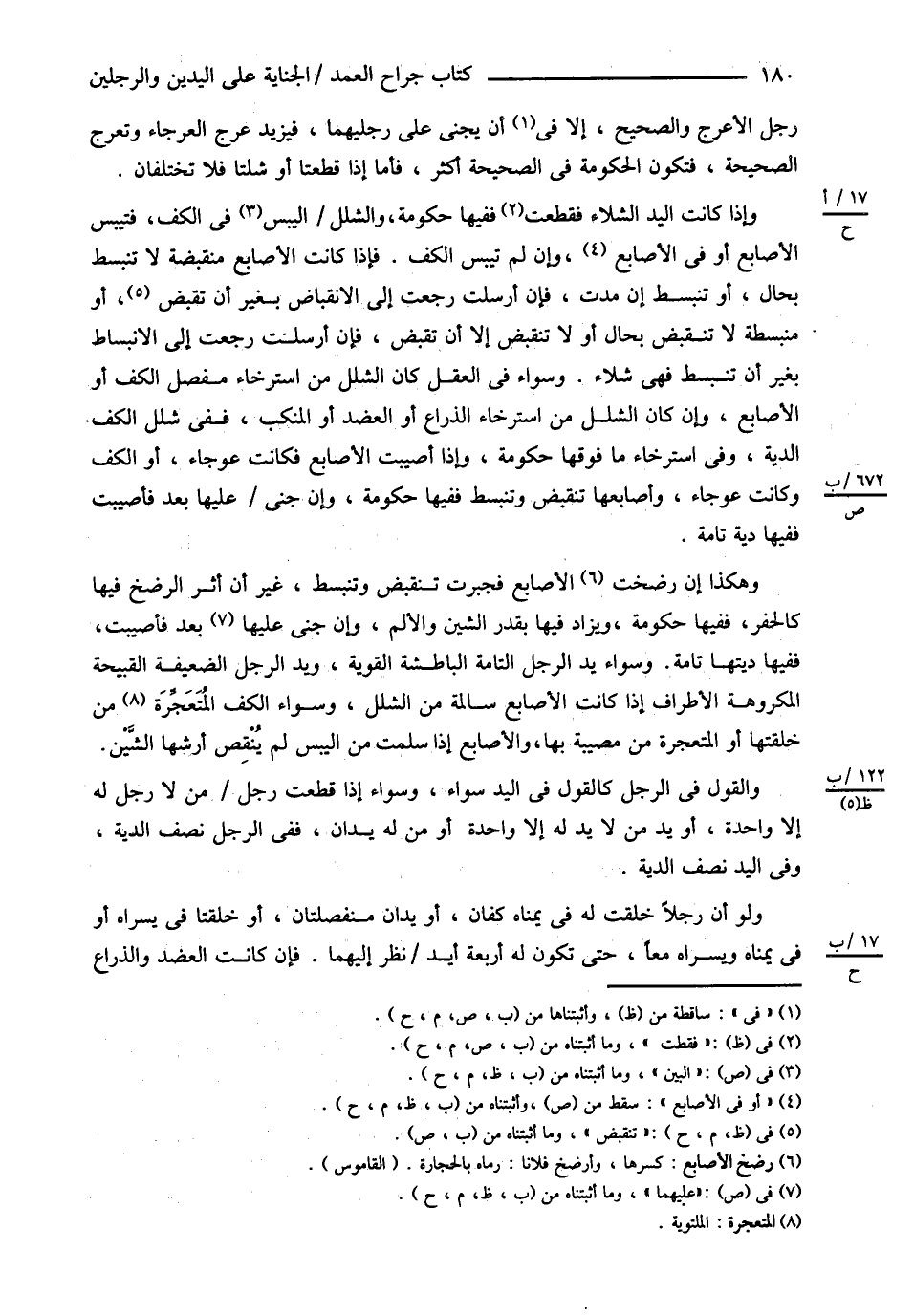 رِجْلُ الْأَعْرَجِ وَالصَّحِيحِ إلَّا فِي أَنْ يَجْنِيَ عَلَى رِجْلَيْهِمَا فَيَزِيدُ عَرَجَ الْعَرْجَاءِ وَتَعْرَجُ الصَّحِيحَةُ فَتَكُونُ الْحُكُومَةُ فِي الصَّحِيحَةِ أَكْثَرُ فَأَمَّا إذَا قُطِعَتَا أَوْ شُلَّتَا فَلاَ تَخْتَلِفَانِ وَإِذَا كَانَتْ الْيَدُ الشَّلَّاءُ فَقُطِعْت فَفِيهَا حُكُومَةٌ وَالشَّلَلُ الْيُبْسُ فِي الْكَفِّ فَتَيْبَسُ الْأَصَابِعُ أَوْ فِي الْأَصَابِعِ وَإِنْ لَمْ تَيْبَسْ الْكَفُّ فَإِذَا كَانَتْ الْأَصَابِعُ مُنْقَبِضَةً لاَ تَنْبَسِطُ بِحَالٍ أَوْ تَنْبَسِطُ إنْ مُدَّتْ فَإِنْ أُرْسِلَتْ رَجَعَتْ إلَى الِانْقِبَاضِ بِغَيْرِ أَنْ تُقْبَضَ أَوْ مُنْبَسِطَةً لاَ تَنْقَبِضُ بِحَالٍ أَوْ لاَ تَنْقَبِضُ إلَّا أَنْ تُقْبَضَ فَإِنْ أُرْسِلَتْ رَجَعَتْ إلَى الِانْبِسَاطِ بِغَيْرِ أَنْ تَنْبَسِطَ فَهِيَ شَلَّاءُ . وَسَوَاءٌ فِي الْعَقْلِ كَانَ الشَّلَلُ مِنْ اسْتِرْخَاءِ مَفْصِلِ الْكَفِّ أَوْ الْأَصَابِعِ وَإِنْ كَانَ الشَّلَلُ مِنْ اسْتِرْخَاءِ الذِّرَاعِ أَوْ الْعَضُدِ أَوْ الْمَنْكِبِ فَفِي شَلَلِ الْكَفِّ الدِّيَةُ وَفِي اسْتِرْخَاءِ مَا فَوْقَهَا حُكُومَةٌ وَإِذَا أُصِيبَتْ الْأَصَابِعُ فَكَانَتْ عَوْجَاءَ أَوْ الْكَفُّ وَكَانَتْ عَوْجَاءَ وَأَصَابِعُهَا تَنْقَبِضُ وَتَنْبَسِطُ فَفِيهَا حُكُومَةٌ , وَإِنْ جَنَى عَلَيْهَا بَعْدَمَا أُصِيبَتْ فَفِيهَا دِيَةٌ تَامَّةٌ وَهَكَذَا إنْ رُضِخَتْ الْأَصَابِعُ فَجُبِرَتْ تَنْقَبِضُ وَتَنْبَسِطُ غَيْرَ أَنَّ أَثَرَ الرَّضْخِ فِيهَا كَالْحَفْرِ فَفِيهَا حُكُومَةٌ وَيُزَادُ فِيهَا بِقَدْرِ الشَّيْنِ وَالْأَلَمِ وَإِنْ جَنَى عَلَيْهَا بَعْدُ فَأُصِيبَتْ فَفِيهَا دِيَتُهَا تَامَّةٌ وَسَوَاءٌ يَدُ الرَّجُلِ التَّامَّةُ الْبَاطِشَةُ الْقَوِيَّةُ وَيَدُ الرَّجُلِ الضَّعِيفَةُ الْقَبِيحَةُ الْمَكْرُوهَةُ الْأَطْرَافِ إذَا كَانَتْ الْأَصَابِعُ سَالِمَةً مِنْ الشَّلَلِ وَسَوَاءٌ الْكَفُّ الْمُتَعَجِّرَةُ مِنْ خِلْقَتِهَا أَوْ الْمُتَعَجِّرَةِ مِنْ مُصِيبَةٍ بِهَا وَالْأَصَابِعُ إذَا سَلِمَتْ مِنْ الْيُبْسِ لَمْ يُنْقِصْ أَرْشَهَا الشَّيْنُ . وَالْقَوْلُ فِي الرِّجْلِ كَالْقَوْلِ فِي الْيَدِ سَوَاءٌ , وَسَوَاءٌ إذَا قُطِعَتْ رِجْلُ مَنْ لاَ رِجْلَ لَهُ إلَّا وَاحِدَةٌ أَوْ يَدُ مَنْ لاَ يَدَ لَهُ إلَّا وَاحِدَةٌ أَوْ مَنْ لَهُ يَدَانِ فَفِي الرِّجْلِ نِصْفُ الدِّيَةِ وَفِي الْيَدِ نِصْفُ الدِّيَةِ وَلَوْ أَنَّ رَجُلاً خُلِقَتْ لَهُ فِي يُمْنَاهُ كَفَّانِ أَوْ يَدَانِ مُنْفَصِلَتَانِ أَوْ خُلِقَتَا فِي يُسْرَاهُ أَوْ فِي يُمْنَاهُ وَيُسْرَاهُ مَعًا حَتَّى تَكُونَ لَهُ أَرْبَعَةُ أَيْدٍ نُظِرَ إلَيْهِمَا , فَإِنْ كَانَتْ الْعَضُدُ وَالذِّرَاعُ@