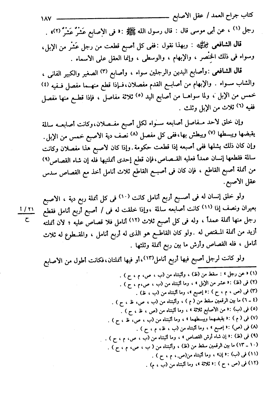 قَالَ الشَّافِعِيُّ : وَأَصَابِعُ الْيَدَيْنِ وَالرِّجْلَيْنِ سَوَاءٌ وَأَصَابِعُ الصَّغِيرِ وَالْكَبِيرِ الْفَانِي وَالشَّابِّ سَوَاءٌ , وَالْإِبْهَامُ مِنْ أَصَابِعِ الْقَدَمِ مَفْصِلاَنِ فَإِذَا قُطِعَ مِنْهُمَا مَفْصِلٌ فَفِيهِ خَمْسٌ مِنْ الْإِبِلِ وَلِمَا سِوَاهَا مِنْ الْأَصَابِعِ ثَلاَثَةُ مَفَاصِلَ فَإِذَا قُطِعَ مِنْهَا مِفْصَلٌ فَفِيهِ ثَلاَثٌ مِنْ الْإِبِلِ وَثُلُثٌ وَإِنْ خُلِقَ لِأَحَدٍ مَفَاصِلُ أَصَابِعِهِ , سَوَاءٌ لِكُلِّ أُصْبُعٍ مَفْصِلاَنِ وَكَانَتْ أَصَابِعُهُ سَالِمَةً يَقْبِضُهَا وَيَبْسُطُهَا وَيَبْطِشُ بِهَا فَفِي كُلِّ مَفْصِلٍ نِصْفُ دِيَةِ الْأُصْبُعِ خَمْسٌ مِنْ الْإِبِلِ وَإِنْ كَانَ ذَلِكَ يُشِلُّهَا فَفِي أُصْبُعِهِ إذَا قُطِعَتْ حُكُومَةٌ وَإِذَا كَانَ لِأُصْبُعِ هَذَا مَفْصِلاَنِ وَكَانَتْ سَالِمَةً فَقَطَعَهَا إنْسَانٌ عَمْدًا فَعَلَيْهِ الْقِصَاصُ فَإِنْ قَطَعَ إحْدَى أُنْمُلَتَيْهَا فَلَهُ إنْ شَاءَ الْقِصَاصُ مِنْ أُنْمُلَةِ أُصْبُعِ الْقَاطِعِ فَإِنْ كَانَ فِي أُصْبُعِ الْقَاطِعِ ثَلاَثُ أَنَامِلَ أَخَذَ مَعَ الْقِصَاصِ سُدُسَ عَقْلِ الْأُصْبُعِ وَلَوْ خُلِقَ إنْسَانٌ لَهُ فِي أُصْبُعٍ أَرْبَعُ أَنَامِلَ كَانَتْ فِي كُلِّ أُنْمُلَةٍ رُبُعُ دِيَةِ الْأُصْبُعِ بَعِيرَانِ وَنِصْفٌ إنْ كَانَتْ أَصَابِعُهُ سَالِمَةً وَإِذَا خُلِقْت لَهُ فِي أُصْبُعٍ أَرْبَعُ أَنَامِلَ فَقَطَعَ رَجُلٌ مِنْهَا أُنْمُلَةً عَمْدًا وَلَهُ فِي كُلِّ أُصْبُعٍ ثَلاَثُ أَنَامِلَ فَلاَ قِصَاصَ عَلَيْهِ ; لِأَنَّ أُنْمُلَتَهُ أَزْيَدُ مِنْ أُنْمُلَةِ الْمُقْتَصِّ لَهُ وَلَوْ كَانَ الْقَاطِعُ هُوَ الَّذِي لَهُ أَرْبَعُ أَنَامِلَ وَالْمَقْطُوعُ لَهُ ثَلاَثُ أَنَامِلَ فَلَهُ الْقِصَاصُ وَأَرْشُ مَا بَيْنَ رُبُعِ أُنْمُلَةٍ وَثُلُثِهَا وَلَوْ كَانَتْ لِرَجُلٍ أُصْبُعٌ فِيهَا أَرْبَعُ أَنَامِلَ أَوْ فِيهَا أُنْمُلَتَانِ فَكَانَتْ أَطْوَلَ مِنْ الْأَصَابِعِ@