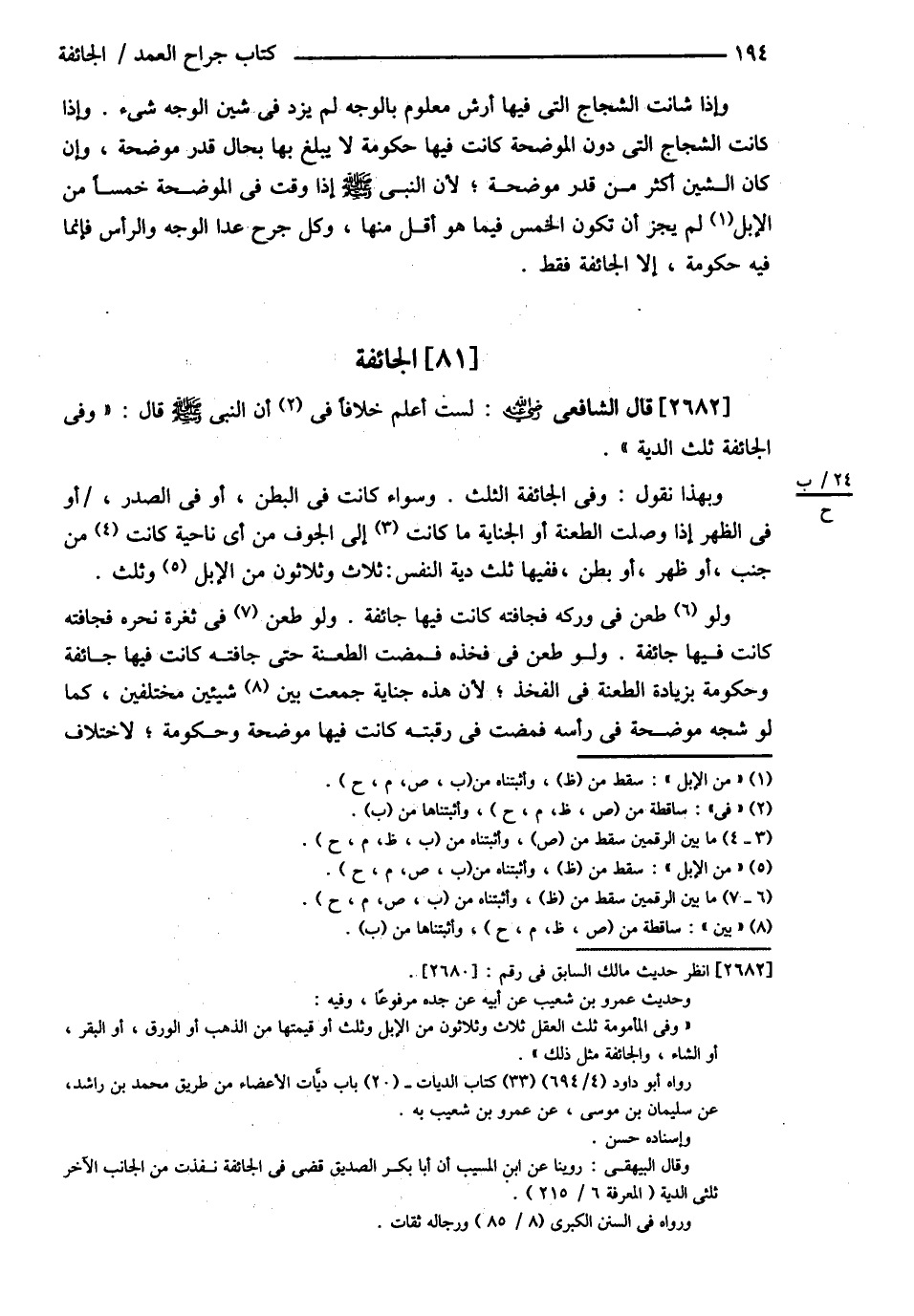 قَالَ الشَّافِعِيُّ : رحمه الله تعالى : لَسْت أَعْلَمُ خِلاَفًا فِي أَنَّ النَّبِيَّ - صلى الله عليه وسلم - قَالَ : ? وَفِي الْجَائِفَةِ ثُلُثُ الدِّيَةِ ? وَبِهَذَا نَقُولُ وَفِي الْجَائِفَةِ الثُّلُثُ وَسَوَاءٌ كَانَتْ فِي الْبَطْنِ أَوْ فِي الصَّدْرِ أَوْ فِي الظَّهْرِ إذَا وَصَلَتْ الطَّعْنَةُ أَوْ الْجِنَايَةُ مَا كَانَتْ إلَى الْجَوْفِ مِنْ أَيِّ نَاحِيَةٍ كَانَتْ مِنْ جَنْبٍ أَوْ ظَهْرٍ أَوْ بَطْنٍ فَفِيهَا ثُلُثُ دِيَةِ النَّفْسِ ثَلاَثٌ وَثَلاَثُونَ مِنْ الْإِبِلِ وَثُلُثٌ . وَلَوْ طُعِنَ فِي وَرِكِهِ فَجَافَتْهُ كَانَتْ فِيهَا جَائِفَةٌ . وَلَوْ طُعِنَ فِي ثُغْرَةُ نَحْرِهِ فَجَافَتْهُ كَانَتْ فِيهَا جَائِفَةٌ . وَلَوْ طُعِنَ فِي فَخِذِهِ فَمَضَتْ الطَّعْنَةُ حَتَّى جَافَتْهُ كَانَتْ فِيهَا جَائِفَةٌ وَحُكُومَةٌ بِزِيَادَةِ الطَّعْنَةِ فِي الْفَخِذِ ; لِأَنَّ هَذِهِ جِنَايَةٌ جَمَعَتْ بَيْنَ شَيْئَيْنِ مُخْتَلِفَيْنِ كَمَا لَوْ شَجَّهُ مُوضِحَةً فِي رَأْسِهِ فَمَضَتْ فِي رَقَبَتِهِ كَانَتْ فِيهَا مُوضِحَةٌ وَحُكُومَةٌ لِاخْتِلاَفِ@