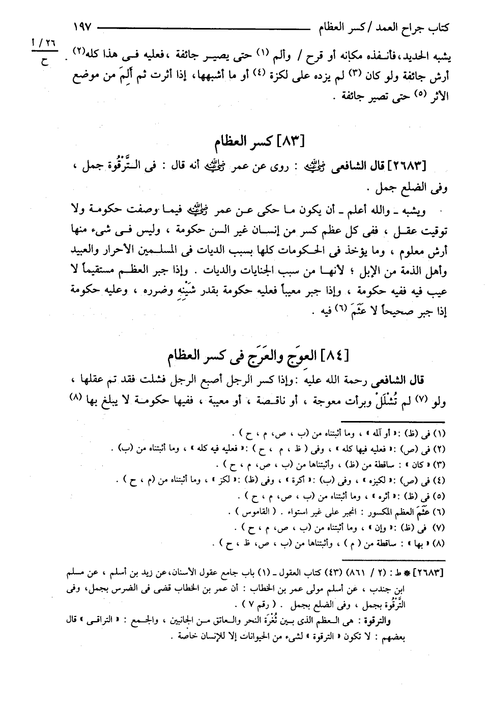 قَالَ الشَّافِعِيُّ : رُوِيَ عَنْ عُمَرَ رضي الله عنه أَنَّهُ قَالَ فِي التَّرْقُوَةِ جَمَلٌ وَفِي الضِّلْعِ جَمَلٌ وَيُشْبِهُ - وَاَللَّهُ أَعْلَمُ - أَنْ يَكُونَ مَا حُكِيَ عَنْ عُمَرَ رضي الله عنه فِيمَا وَصَفْت حُكُومَةً لاَ تَوْقِيتَ عَقْلٍ فَفِي كُلِّ عَظْمٍ كُسِرَ مِنْ إنْسَانٍ غَيْرُ السِّنِّ حُكُومَةٌ وَلَيْسَ فِي شَيْءٍ مِنْهَا أَرْشٌ مَعْلُومٌ وَمَا يُؤْخَذُ فِي الْحُكُومَاتِ كُلِّهَا بِسَبَبِ الدِّيَاتِ فِي الْمُسْلِمِينَ الْأَحْرَارِ وَالْعَبِيدِ وَأَهْلِ الذِّمَّةِ مِنْ الْإِبِلِ ; لِأَنَّهَا مِنْ سَبَبِ الْجِنَايَاتِ وَالدِّيَاتِ وَإِذَا جُبِرَ الْعَظْمُ مُسْتَقِيمًا لاَ عَيْبَ فِيهِ فَفِيهِ حُكُومَةٌ وَإِذَا جُبِرَ مَعِيبًا فَعَلَيْهِ حُكُومَةٌ بِقَدْرِ شَيْنِهِ وَضَرَرِهِ وَعَلَيْهِ حُكُومَةٌ إذَا جُبِرَ صَحِيحًا لاَ عَتْمَ فِيهِ . .